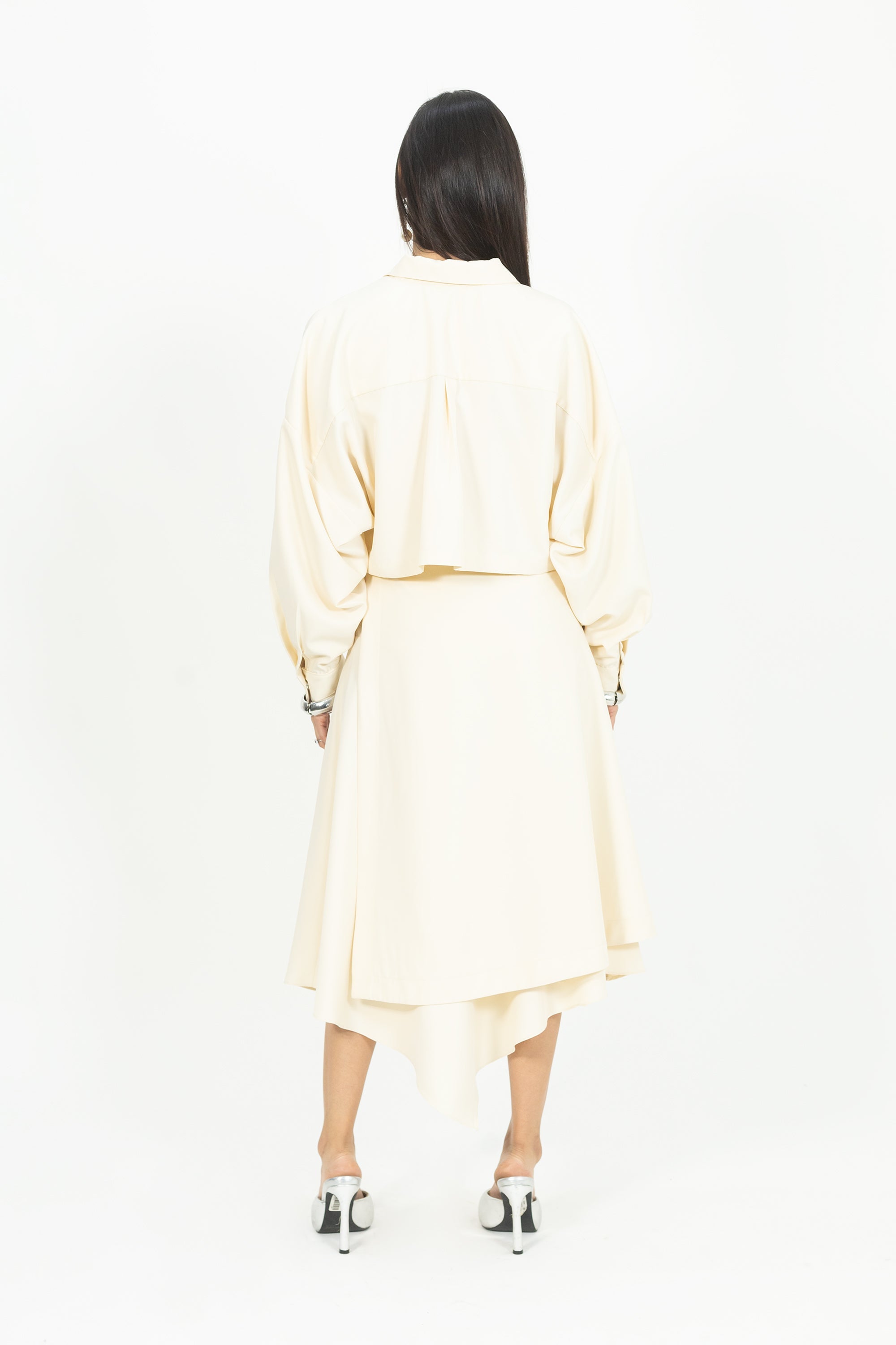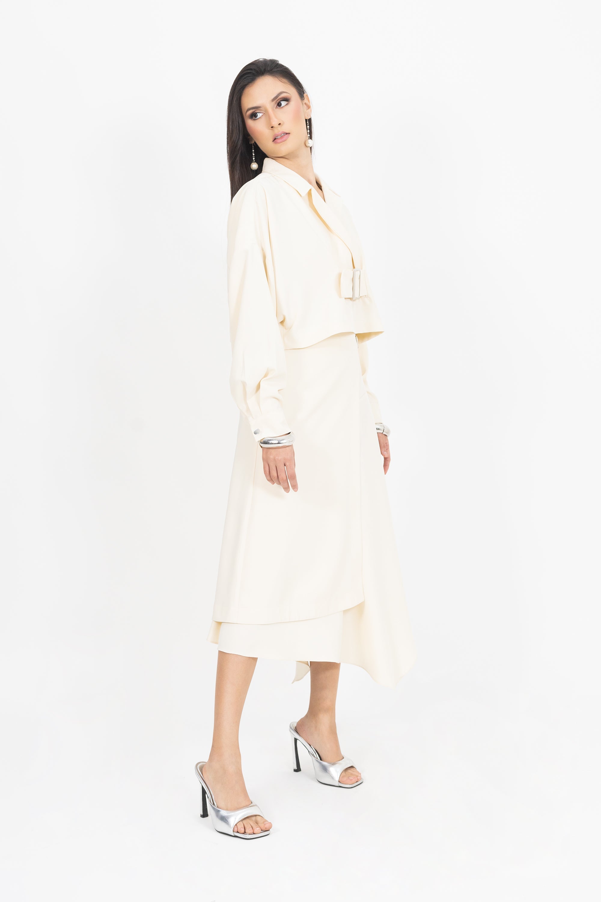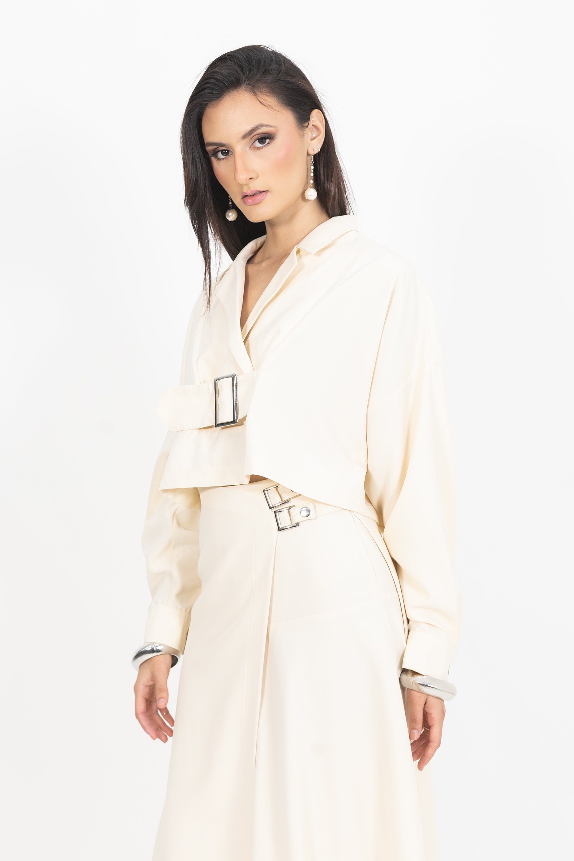 La chaqueta corta con manga dolman, puño y cinto con hebilla es una pieza que eleva cualquier look con su carácter arquitectónico y refinado. Su manga dolman aporta un aire contemporáneo y estructurado, mientras que el cinturón con hebilla central define la silueta y enmarca la cintura con distinción.