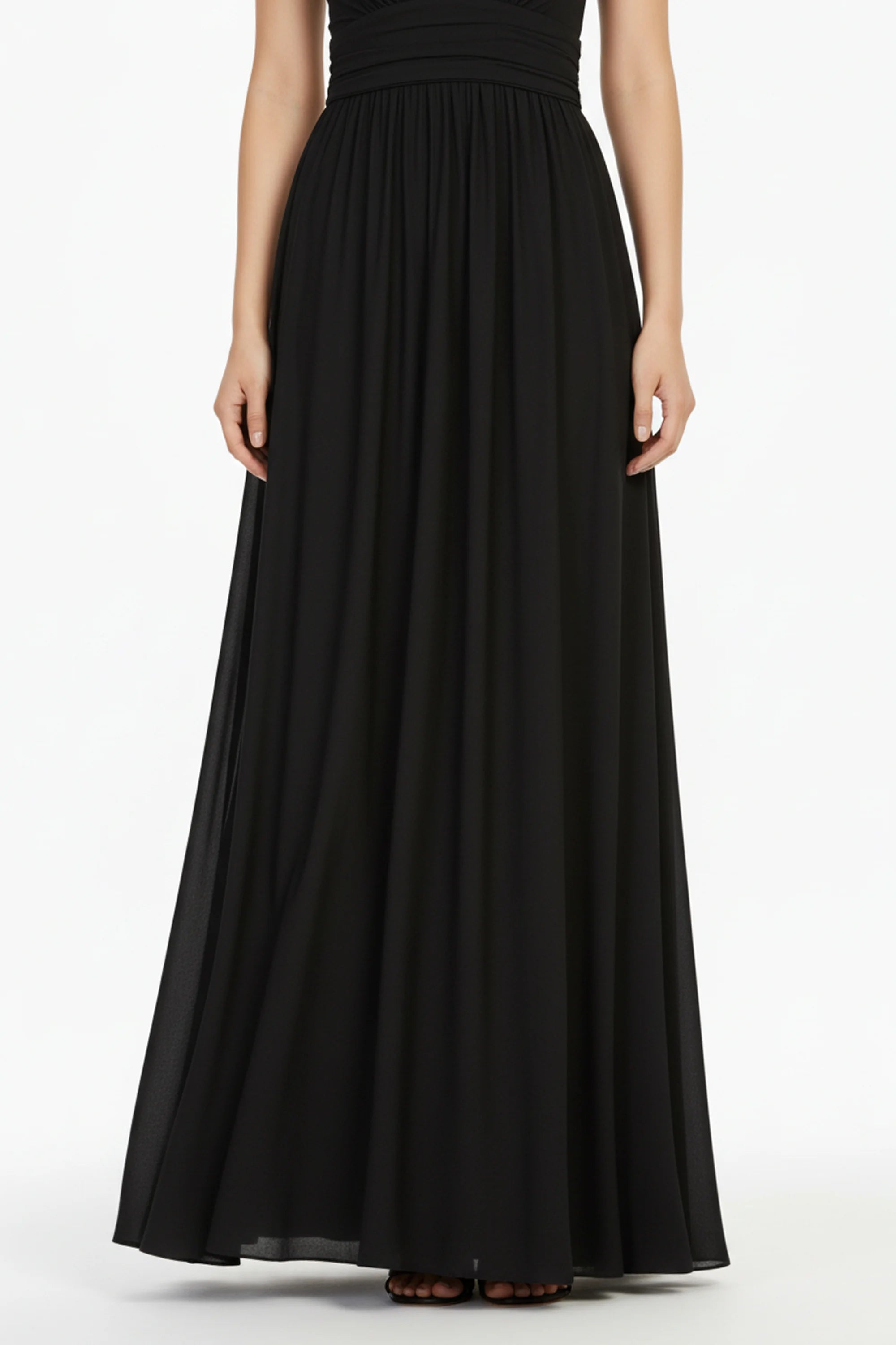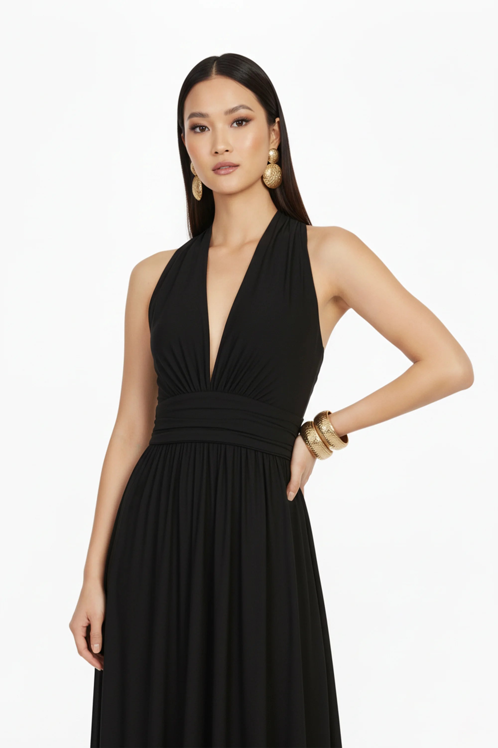 Diseñado para resaltar la silueta, este vestido presenta un escote en V con tirantes cruzados que aportan soporte y sofisticación a la parte superior.