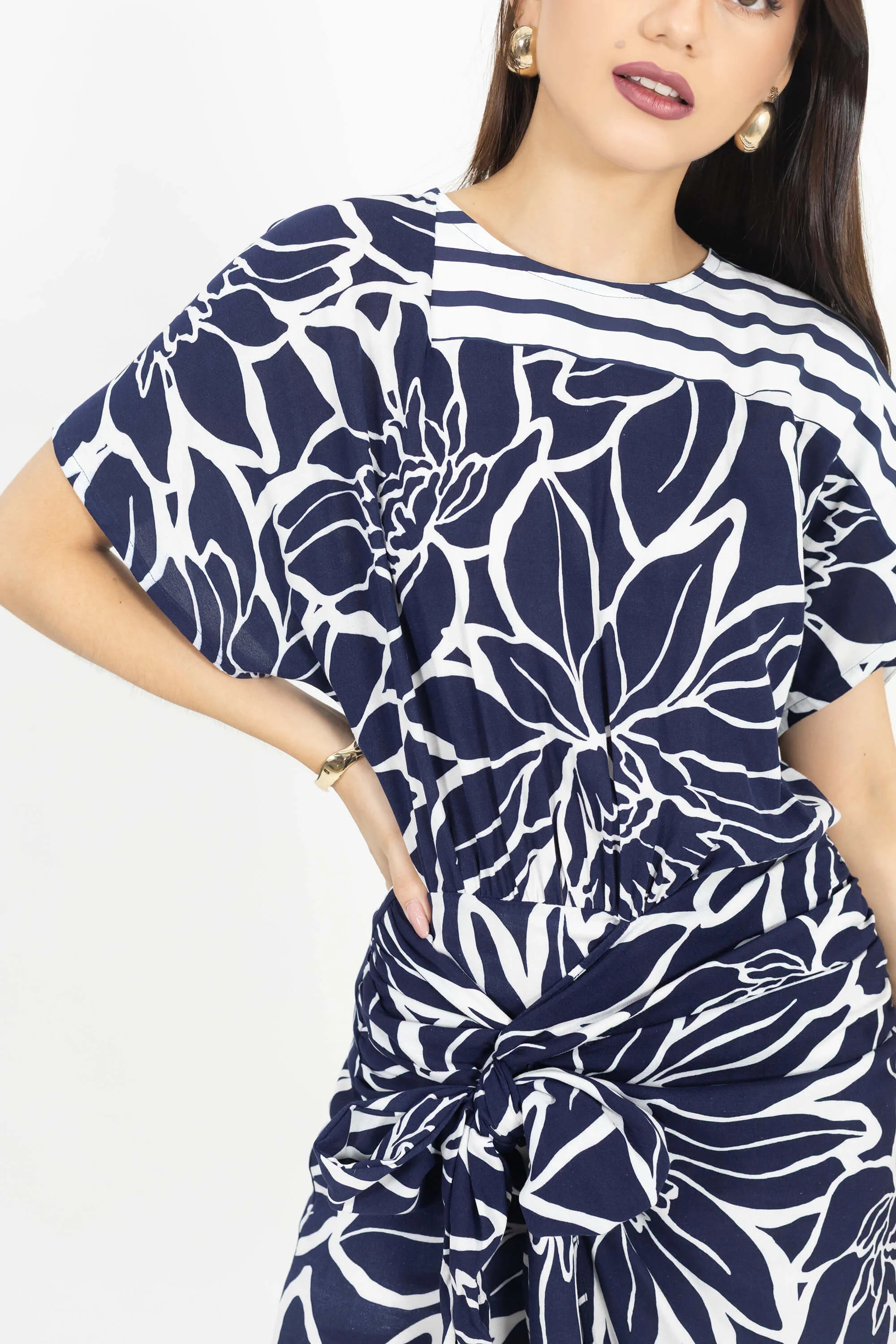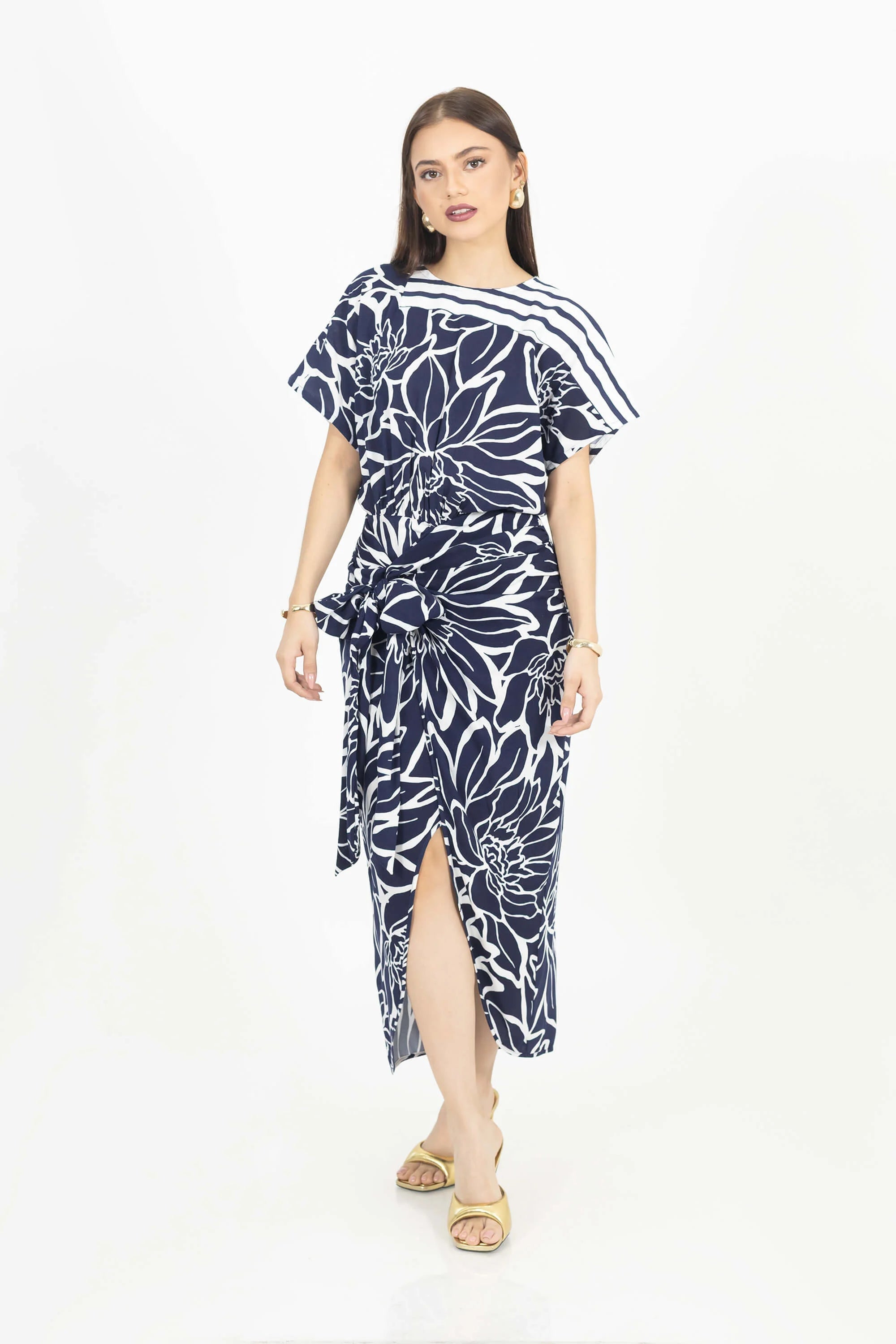 Su silueta envolvente se ajusta con un lazo frontal que acentúa delicadamente la cintura, mientras que la falda cruzada aporta movimiento y un aire sutilmente bohemio. Las mangas pasadas aportan cobertura ligera y un toque de fluidez que equilibra a la perfección la estructura del diseño.