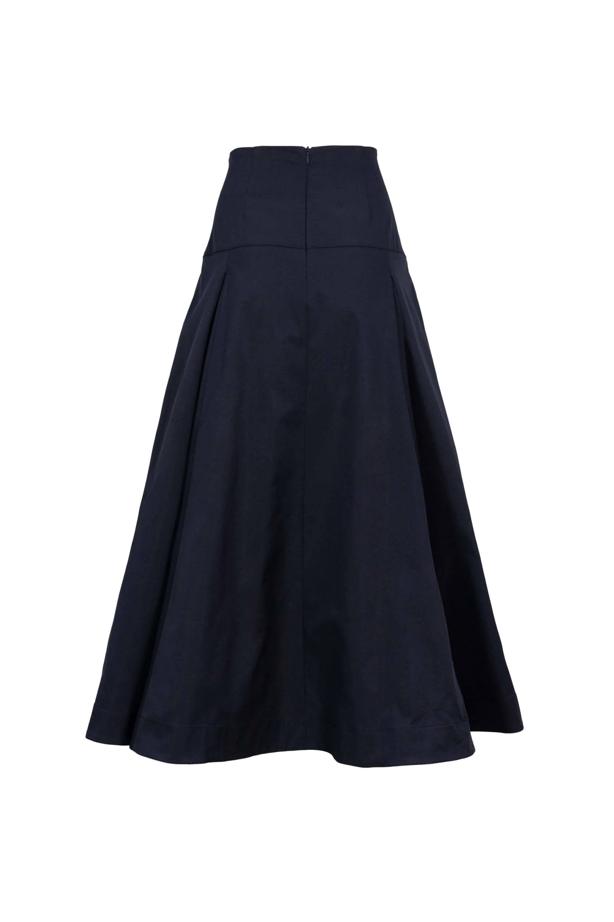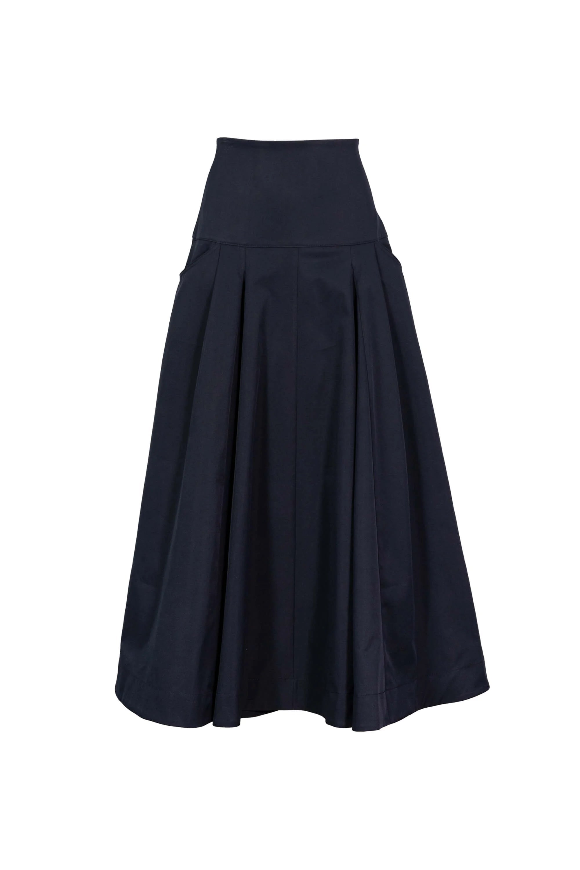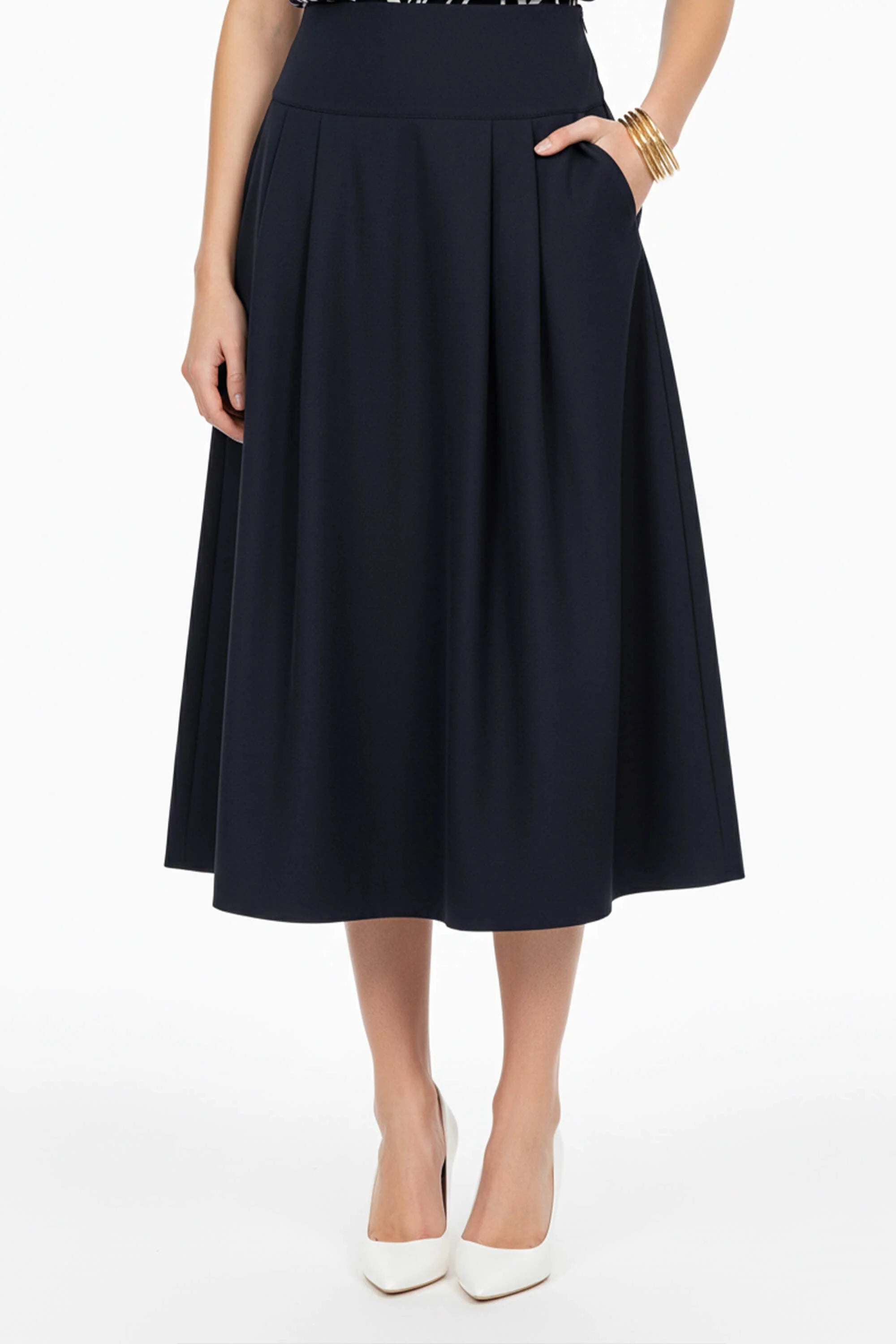 La falda midi amplia es un homenaje a la feminidad sofisticada y al movimiento elegante. Su silueta generosa crea un efecto fluido y etéreo, aportando dinamismo y comodidad sin perder el porte refinado que distingue a la marca.