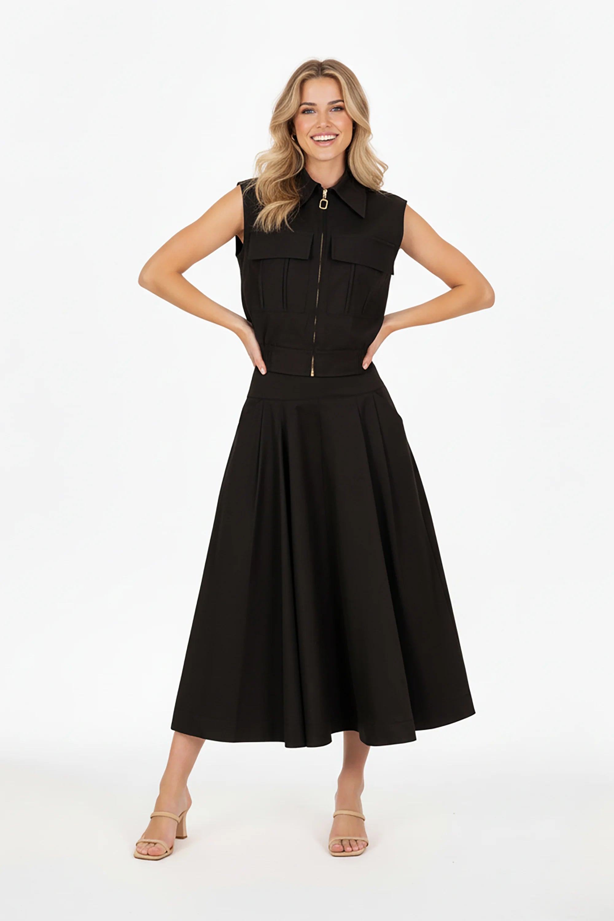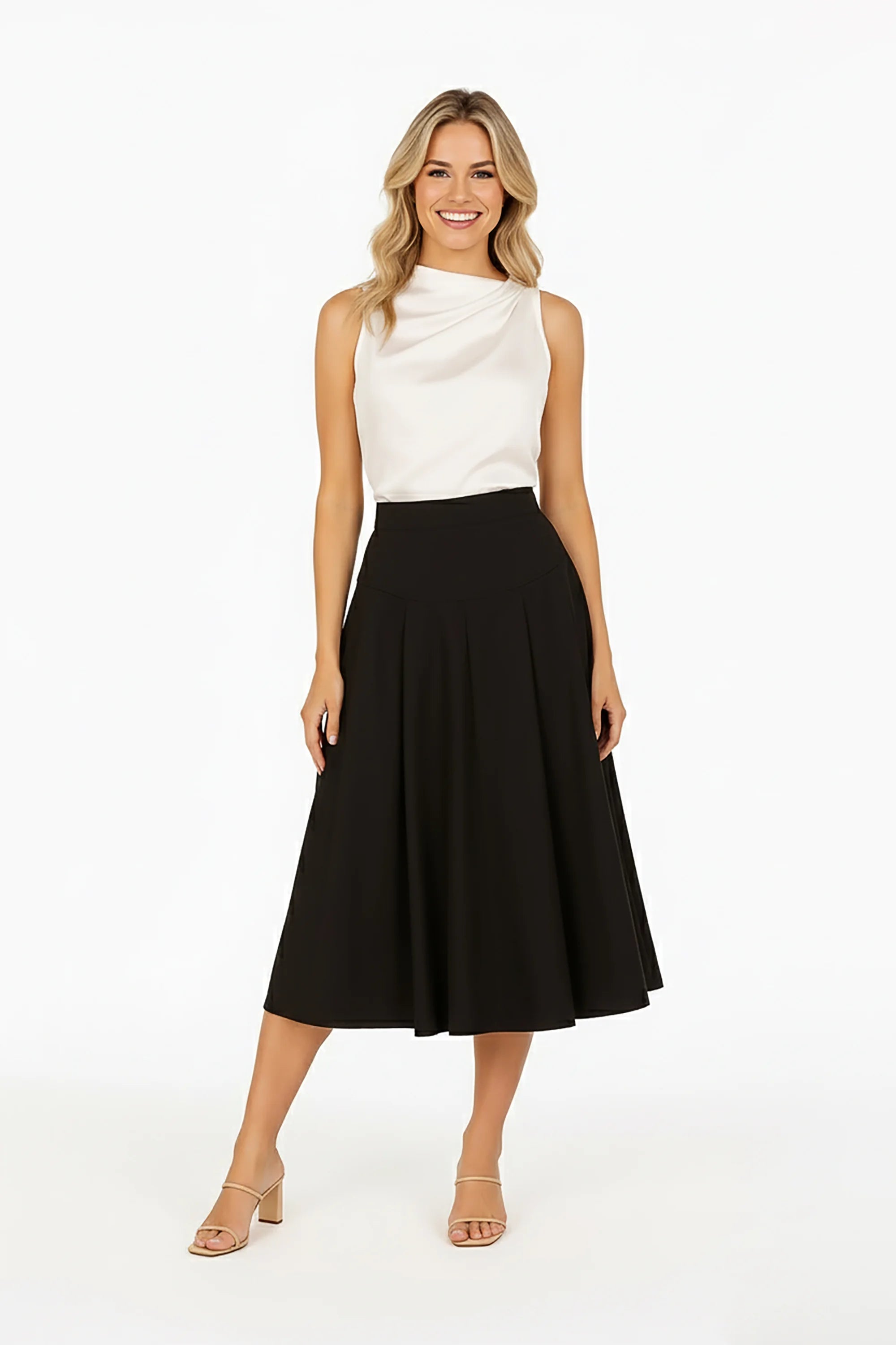 Falda midi amplia diseño atemporal y sofisticado.