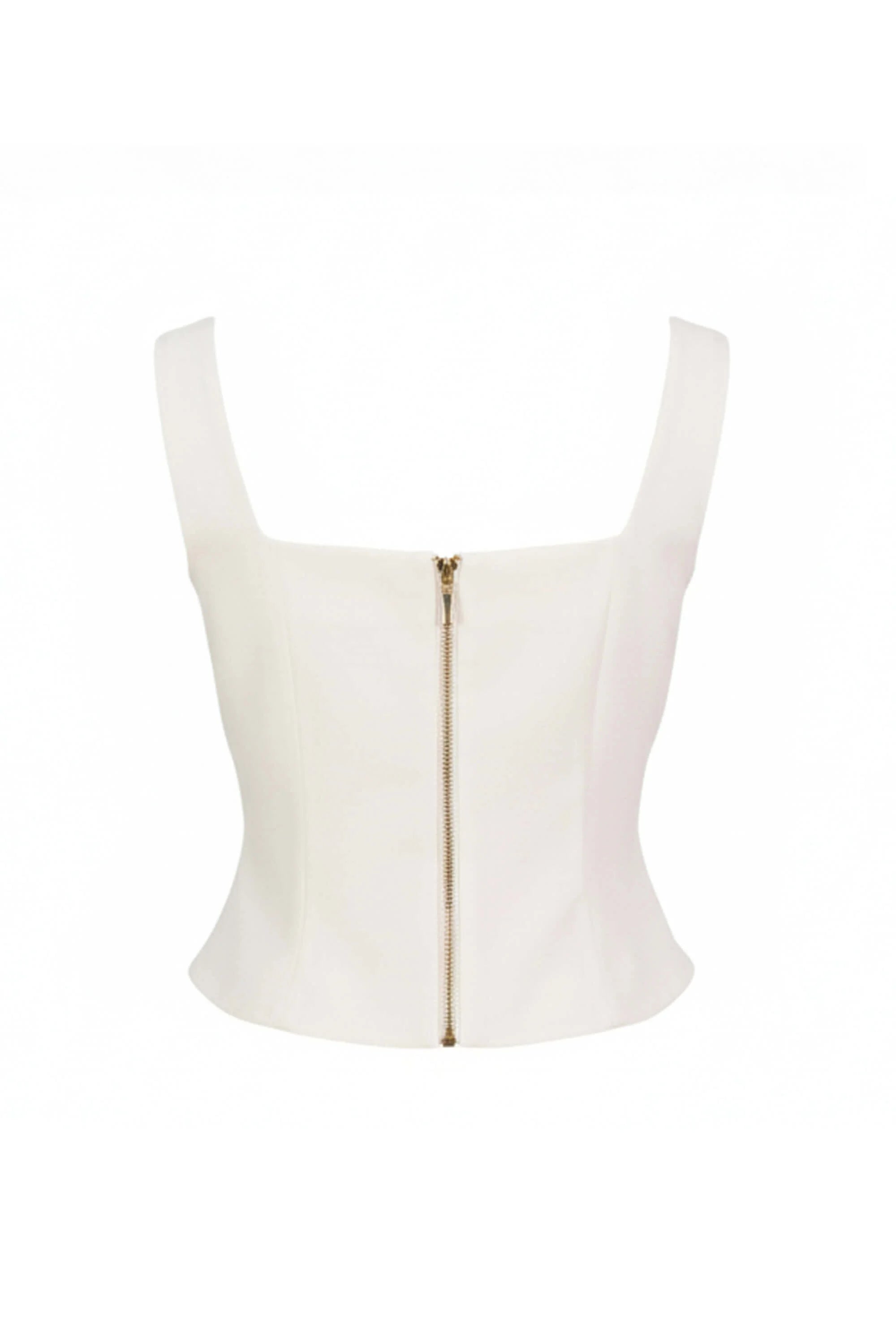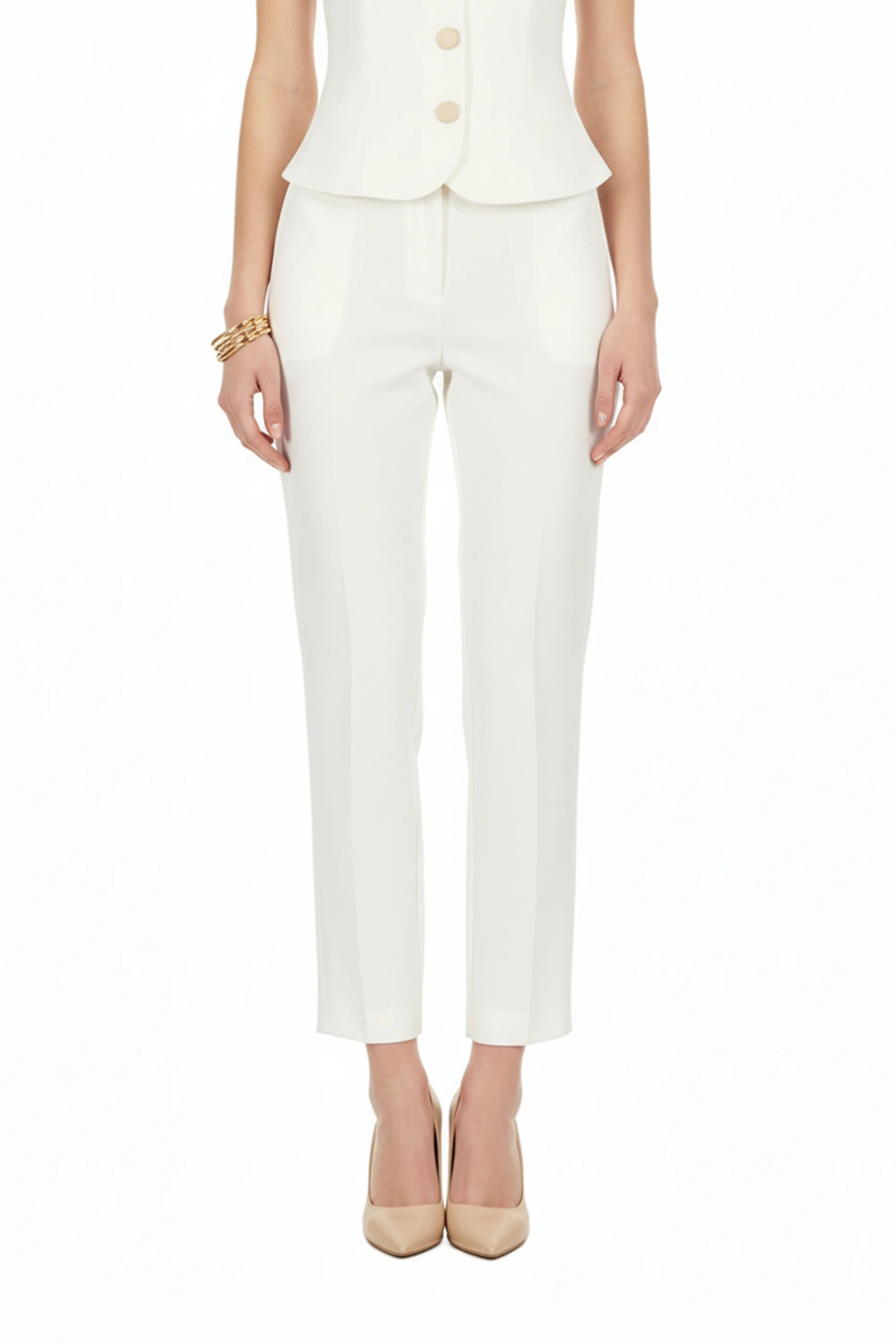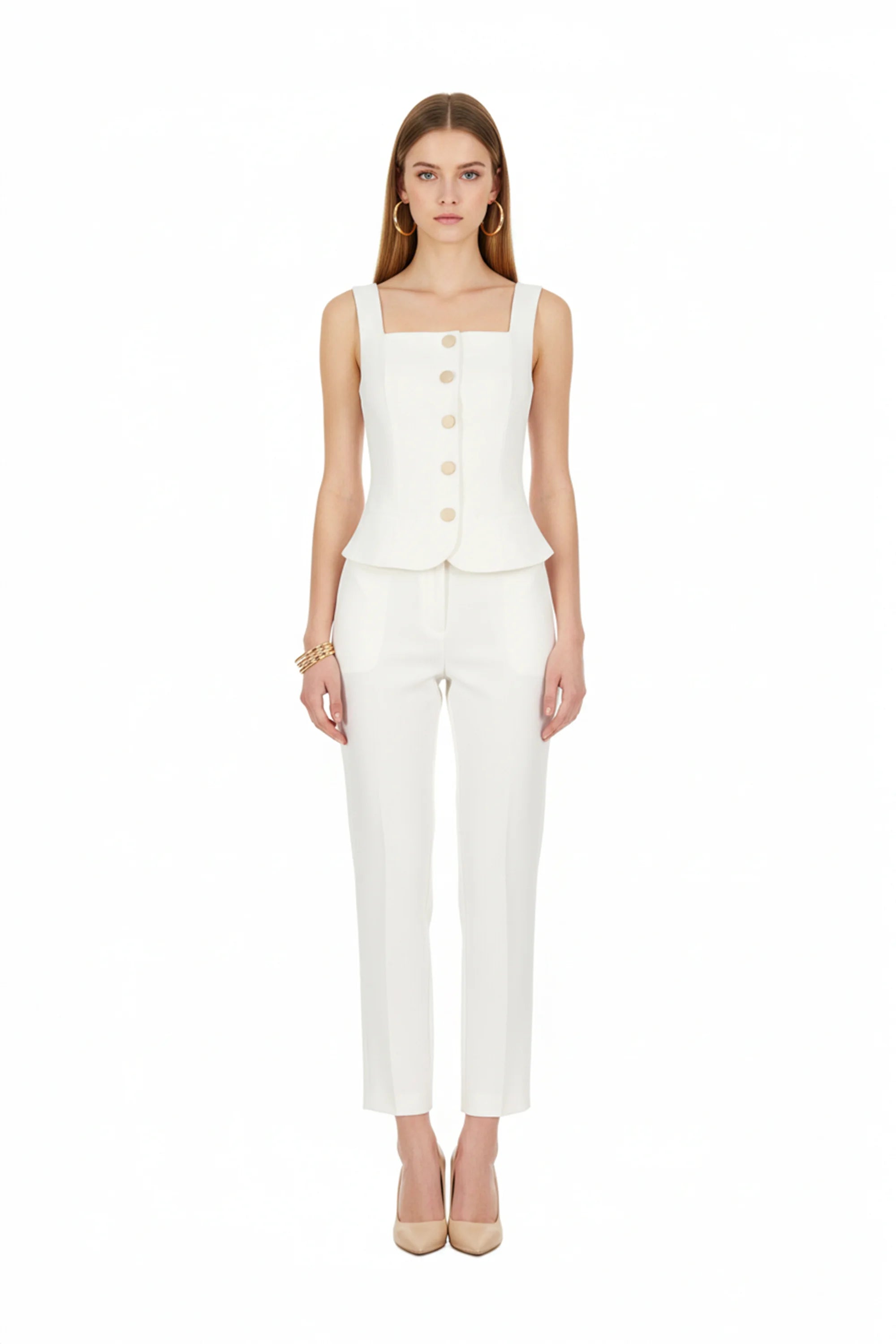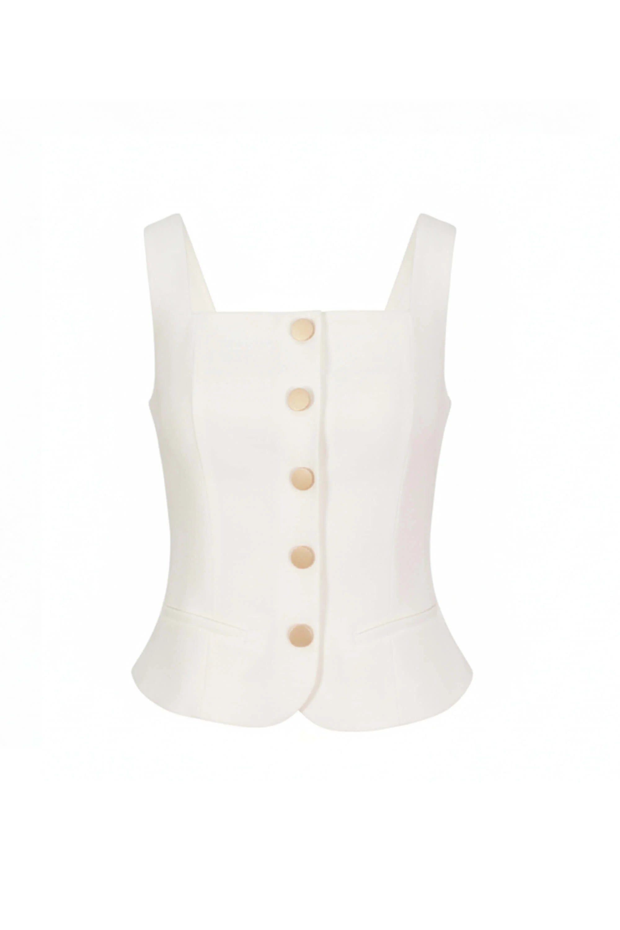 Este saco sin mangas de Reina Díaz redefine la estética clásica con una propuesta limpia y contemporánea. Su silueta estructurada estiliza la figura, mientras que las aletillas simuladas elegantemente integradas aportan un toque ornamental sin sacrificar la pureza del diseño.