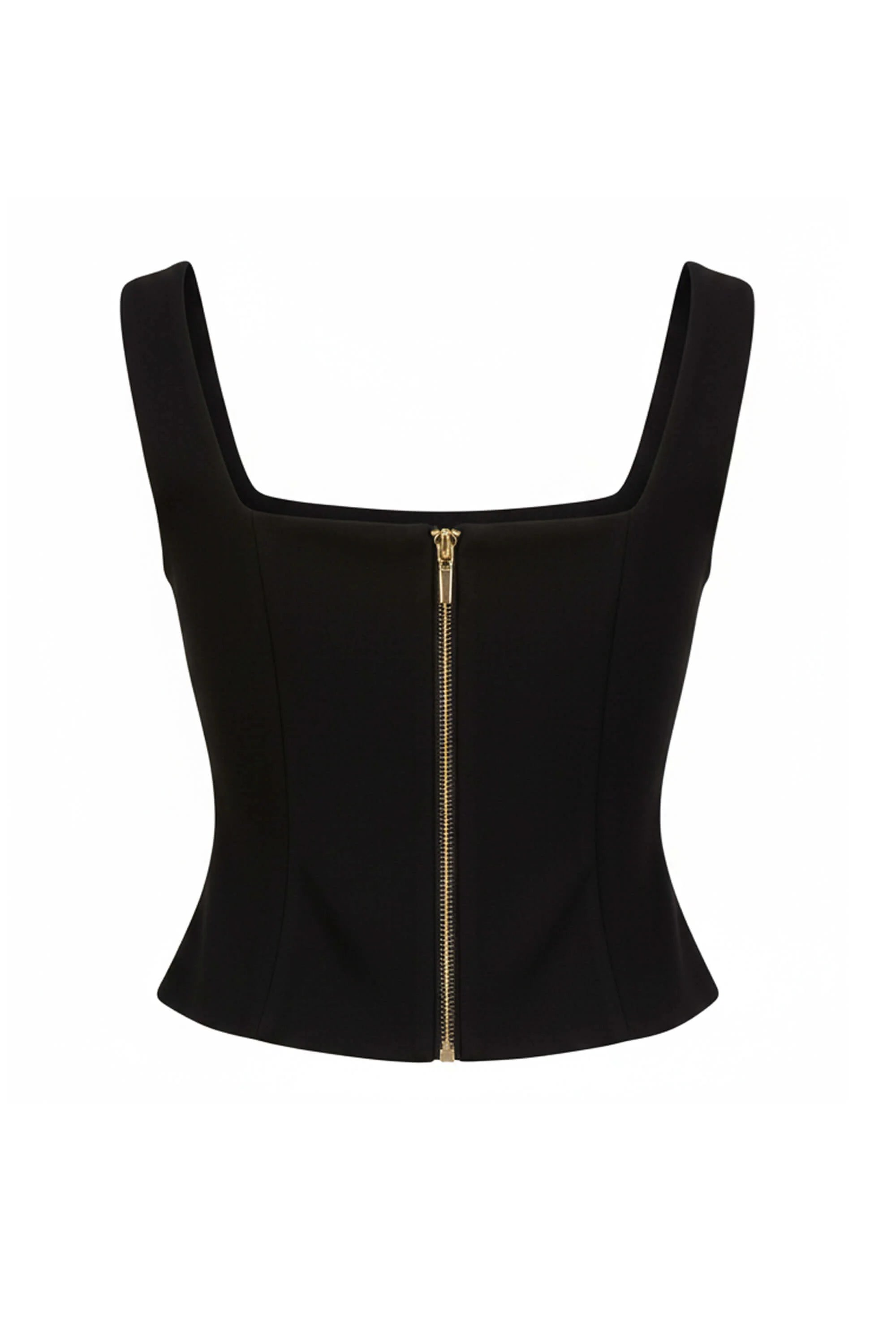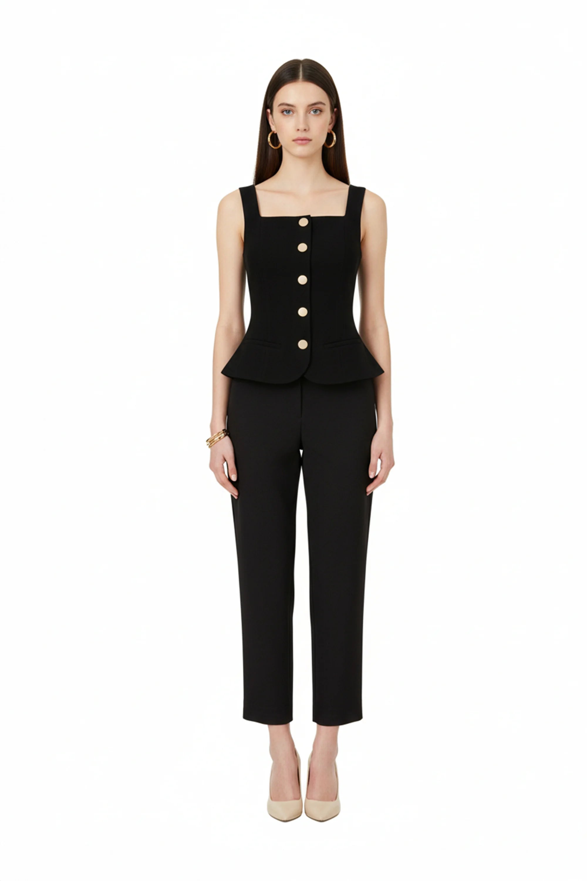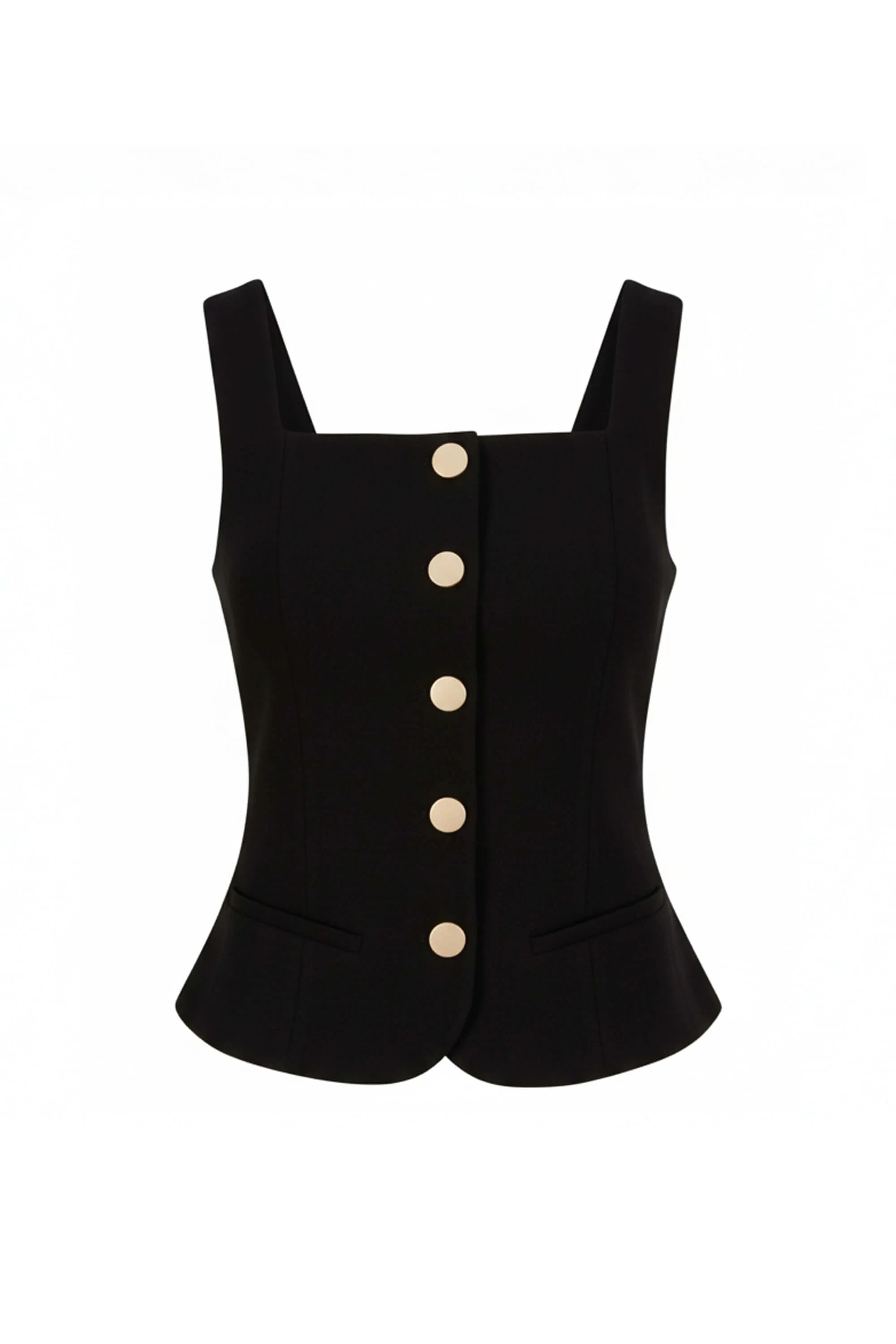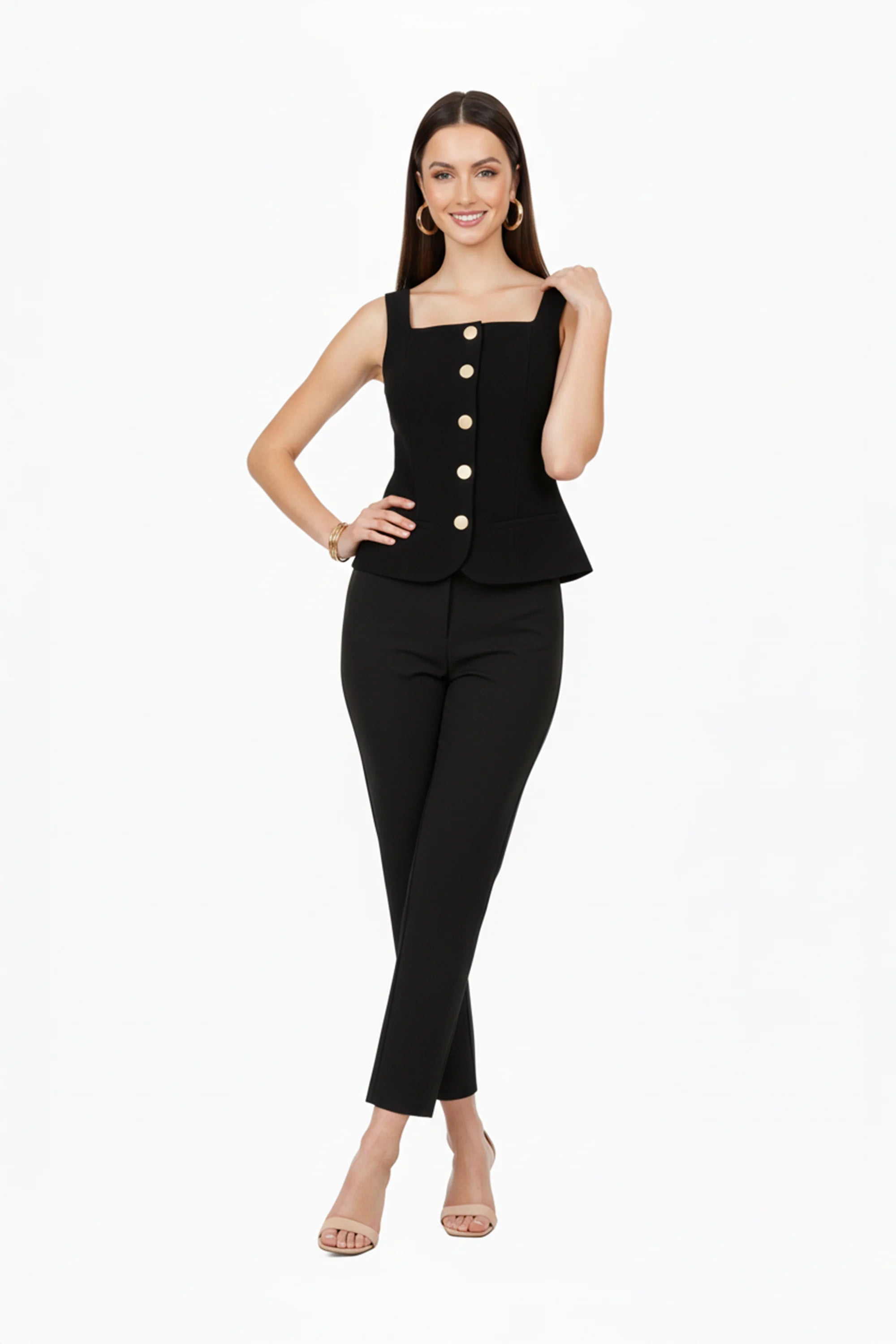 Este saco sin mangas de Reina Díaz redefine la estética clásica con una propuesta limpia y contemporánea. Su silueta estructurada estiliza la figura, mientras que las aletillas simuladas elegantemente integradas aportan un toque ornamental sin sacrificar la pureza del diseño.