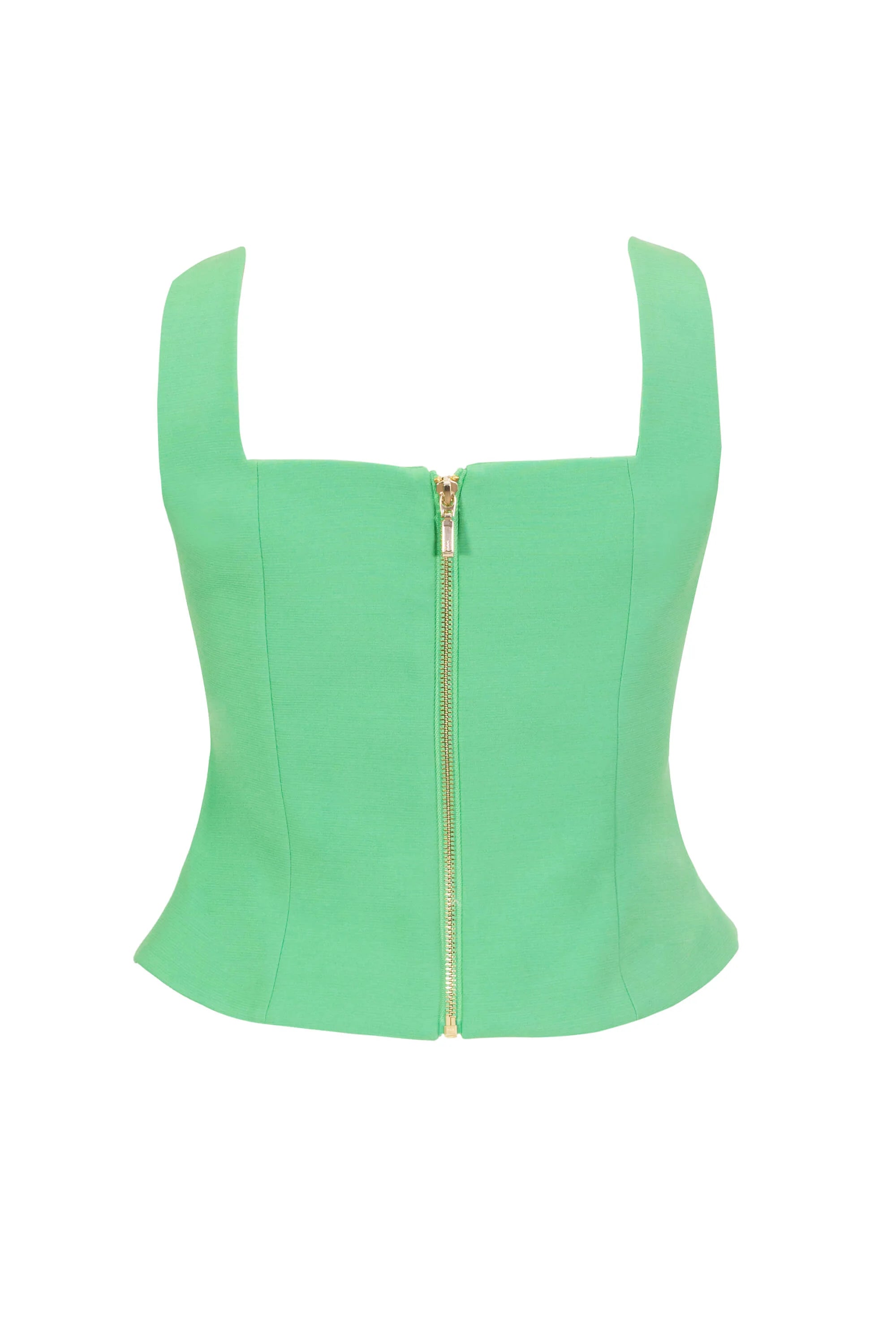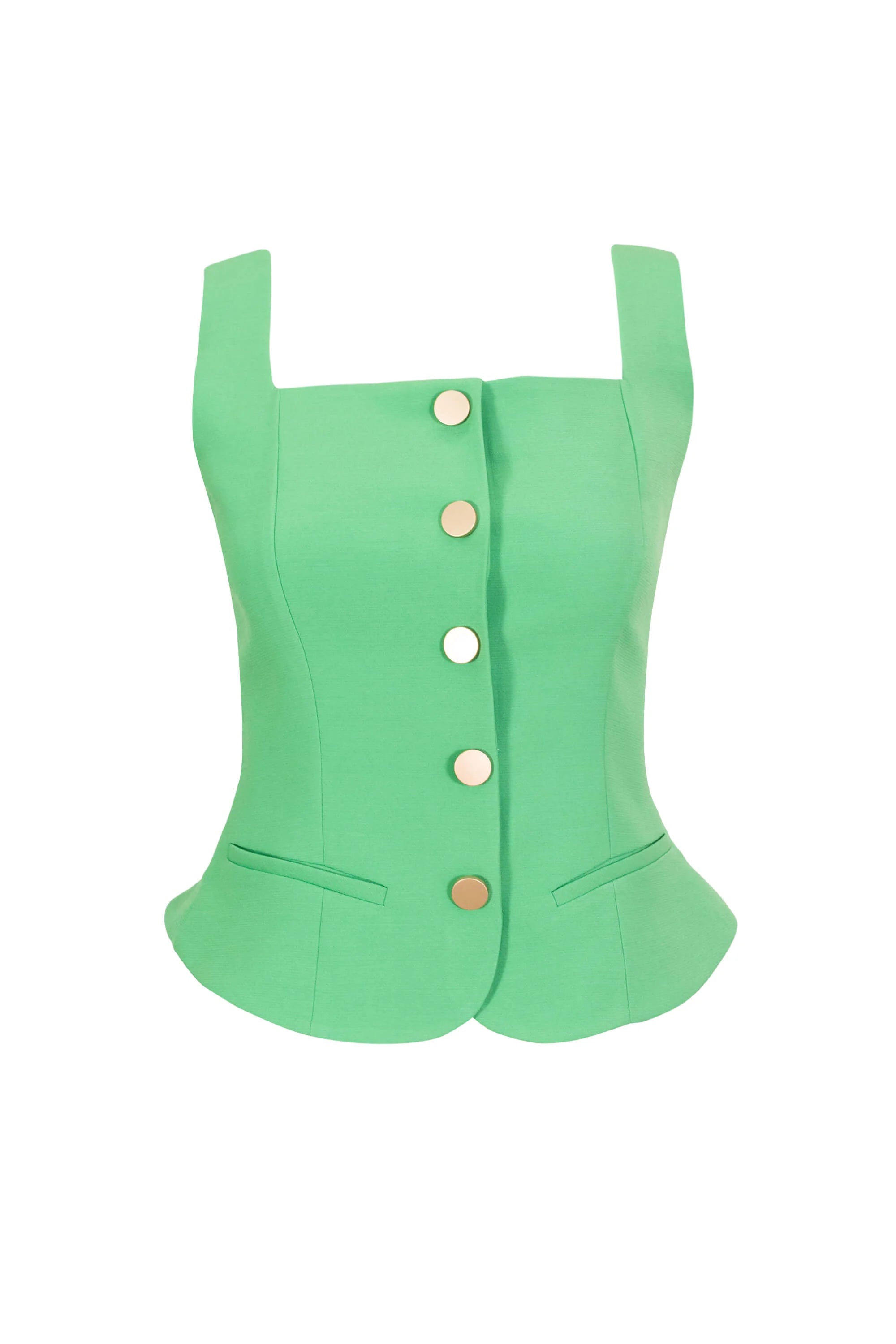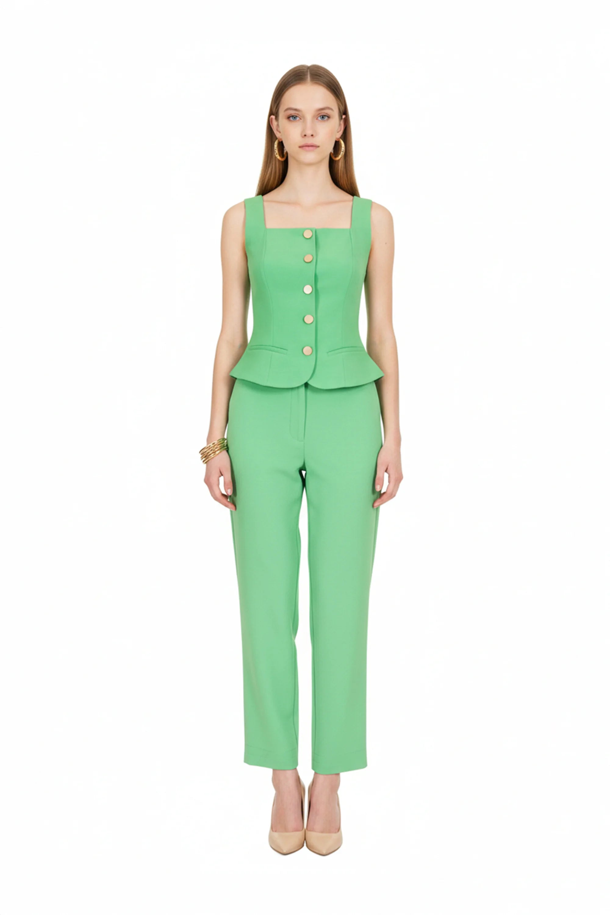 Este saco sin mangas de Reina Díaz redefine la estética clásica con una propuesta limpia y contemporánea. Su silueta estructurada estiliza la figura, mientras que las aletillas simuladas elegantemente integradas aportan un toque ornamental sin sacrificar la pureza del diseño.
