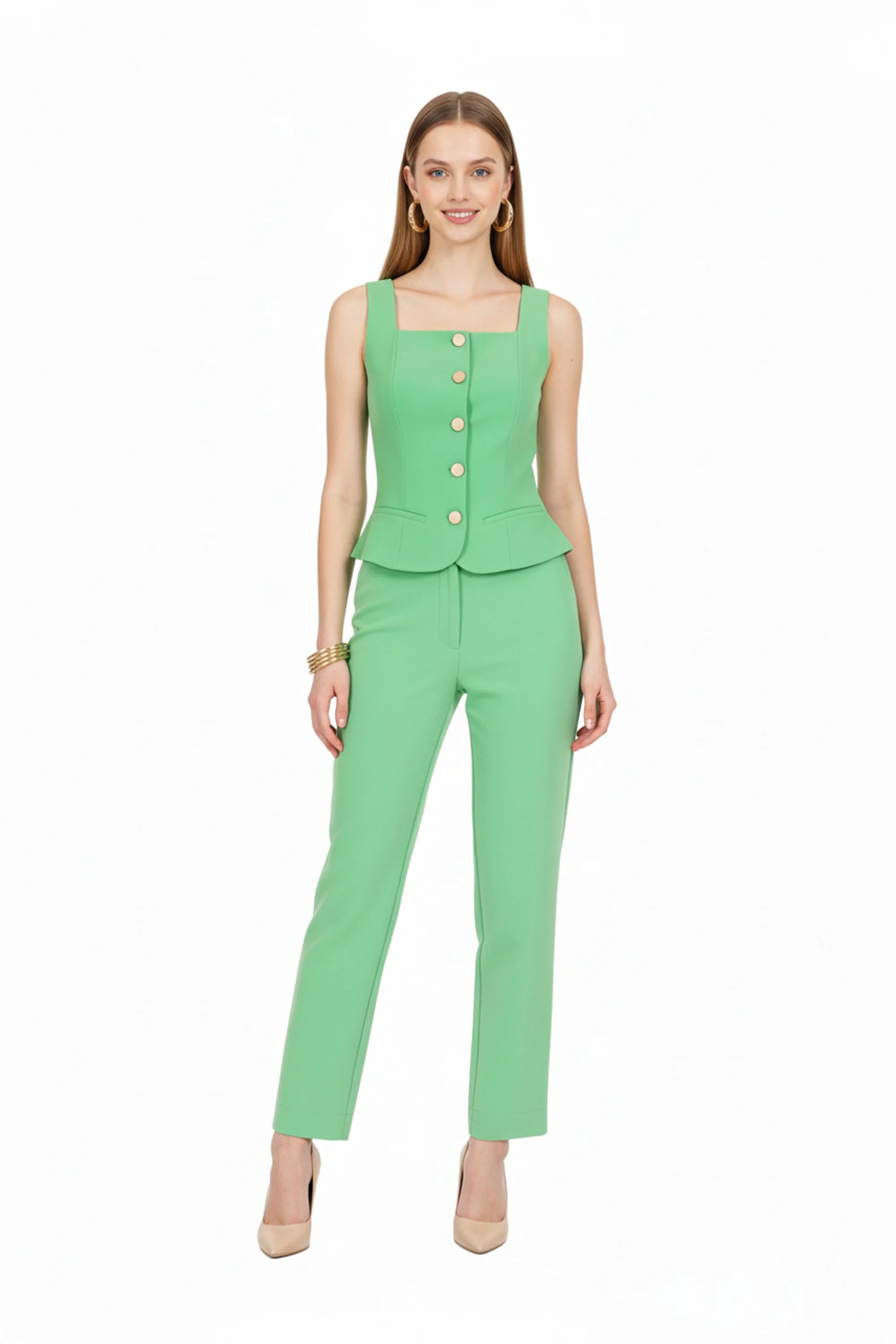 Los botones metálicos al frente refuerzan su carácter sofisticado, convirtiéndolo en una pieza poderosa, ideal tanto para ocasiones ejecutivas como para estilismos relajados de alto impacto.
