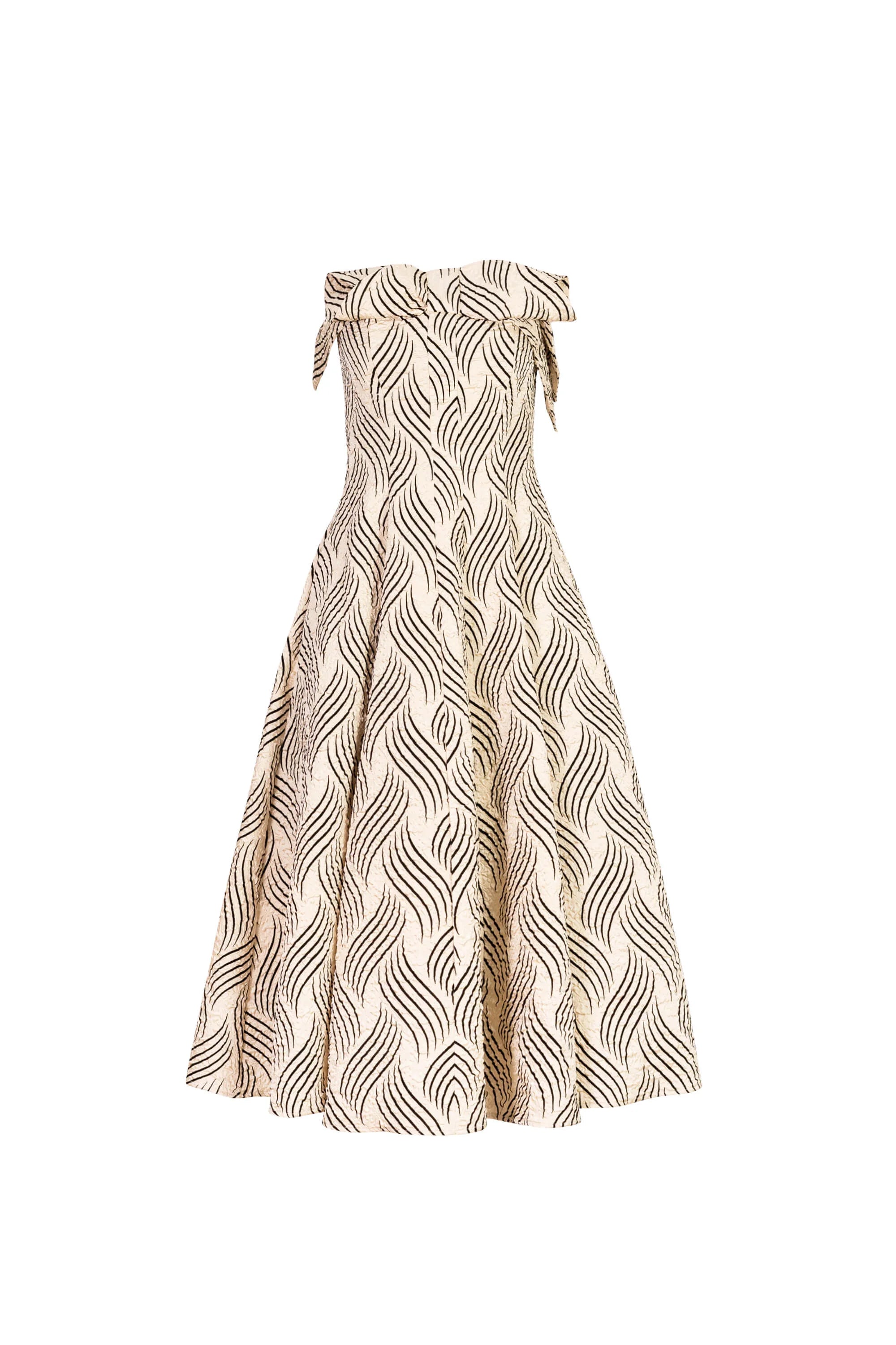 Este vestido strapless con cortes estratégicos y un delicado moño al frente celebra la feminidad con una silueta envolvente y un aire de sofisticación natural. Su diseño realza el busto y define la cintura, mientras la falda con volumen fluye con elegancia en cada paso.