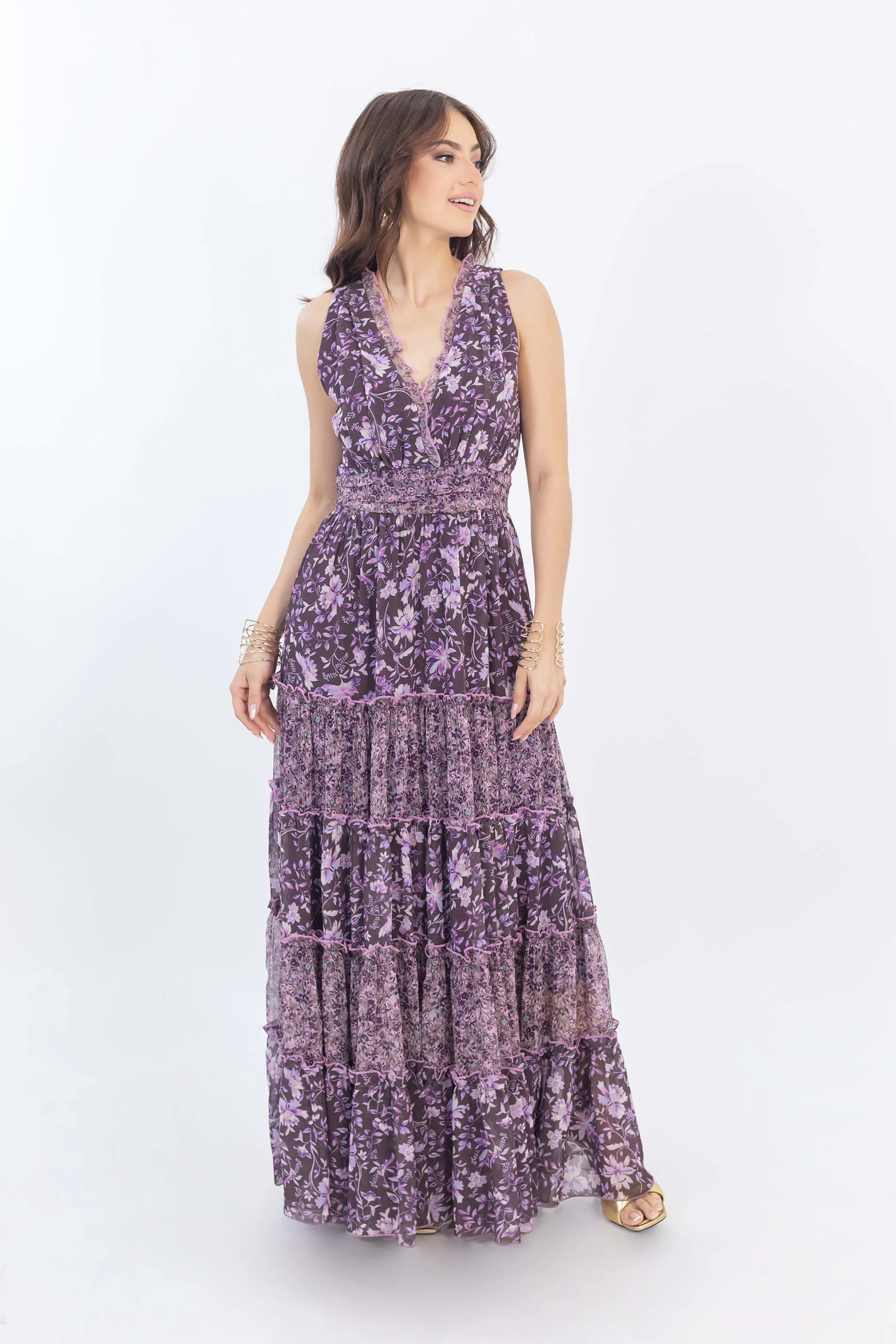 El escote en V enmarca el busto con delicadeza, mientras los tirantes anchos aportan un balance perfecto entre soporte y elegancia. Su diseño de falda amplia en niveles con sutiles detalles de volantes acentúa el aire romántico de la prenda, ideal para eventos al aire libre, bodas o celebraciones donde la distinción es esencial.