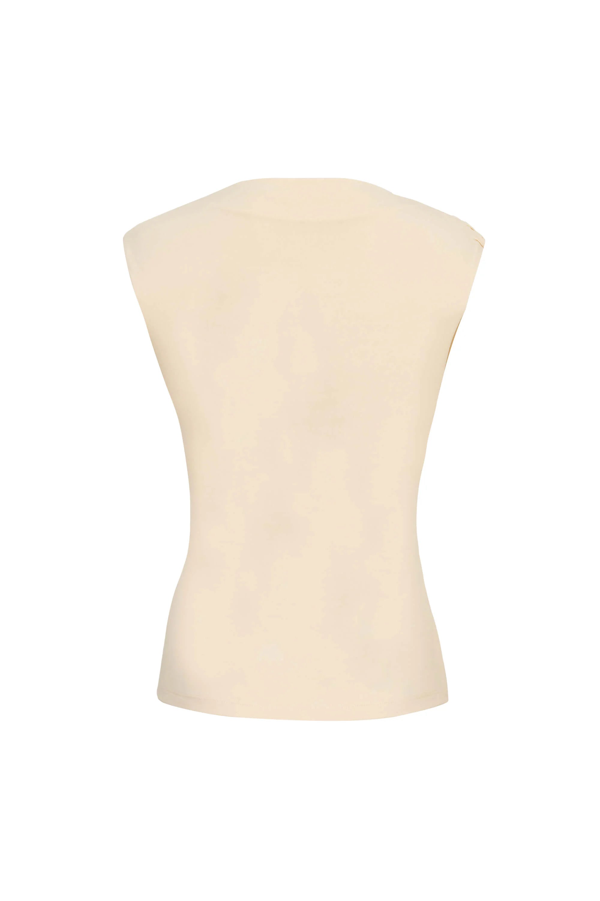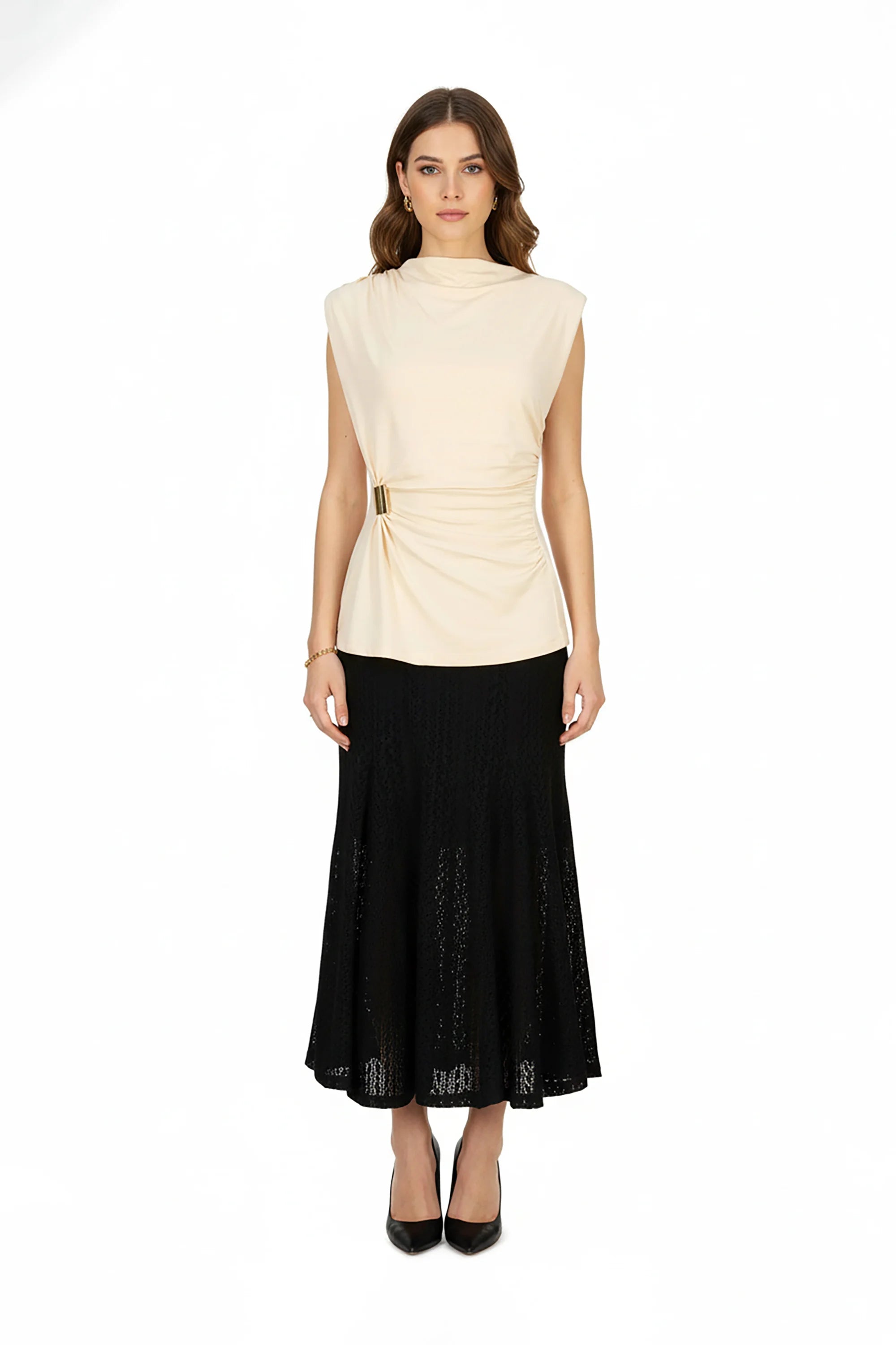 Blusa sin mangas de licra con drapeado lateral y adorno metálico en la cintura.