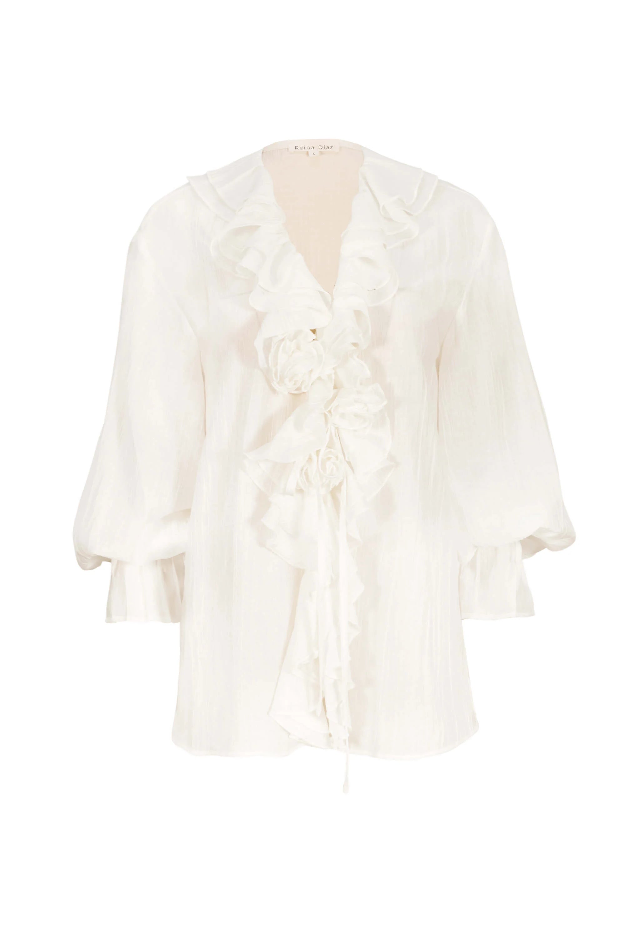 Con un escote decorado que evoca el estilo chino tradicional y olanes que enmarcan el frente, esta blusa es una prenda icónica para looks sofisticados. El diseño fluido de mangas largas la convierte en una opción atemporal y elegante para cualquier ocasión.