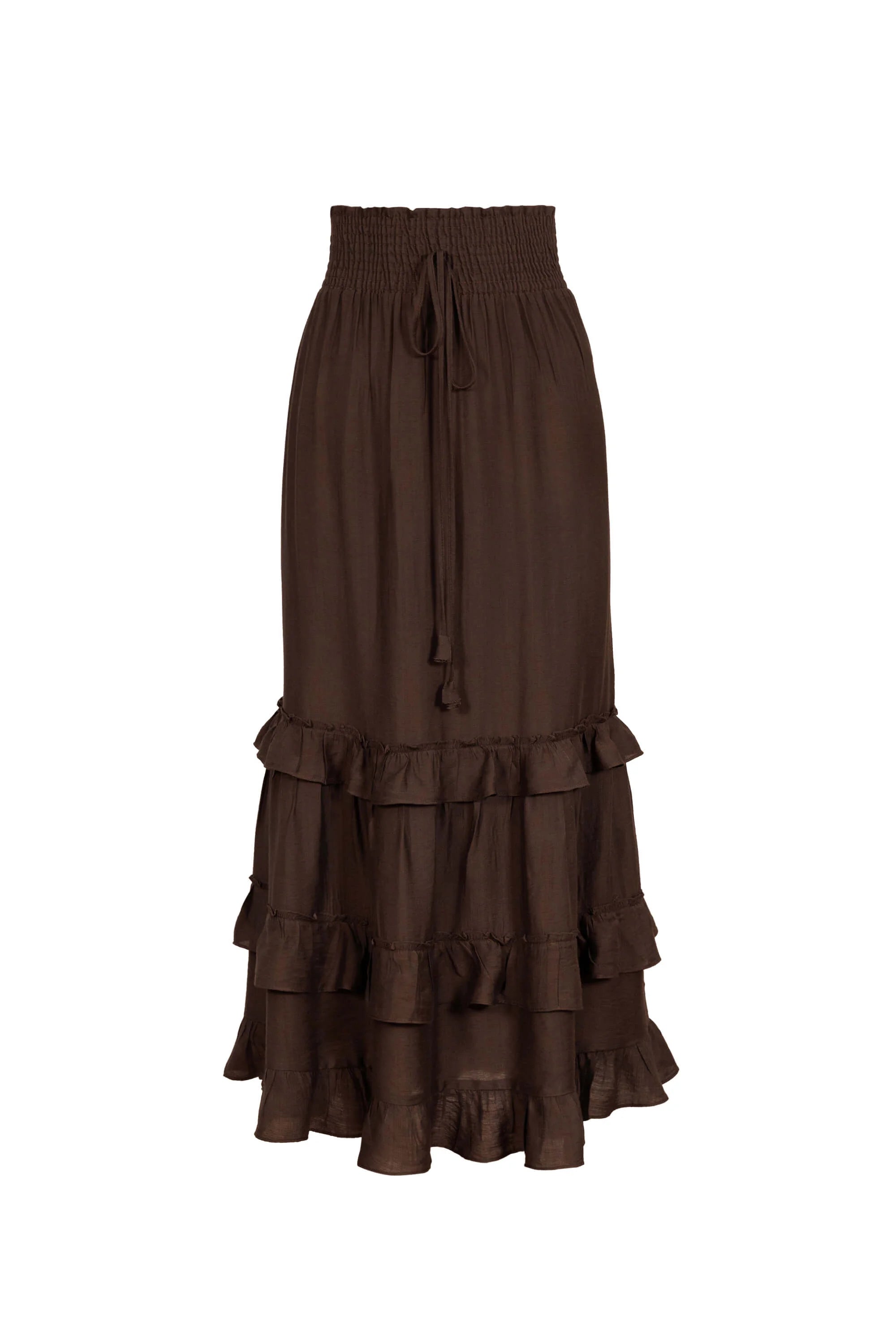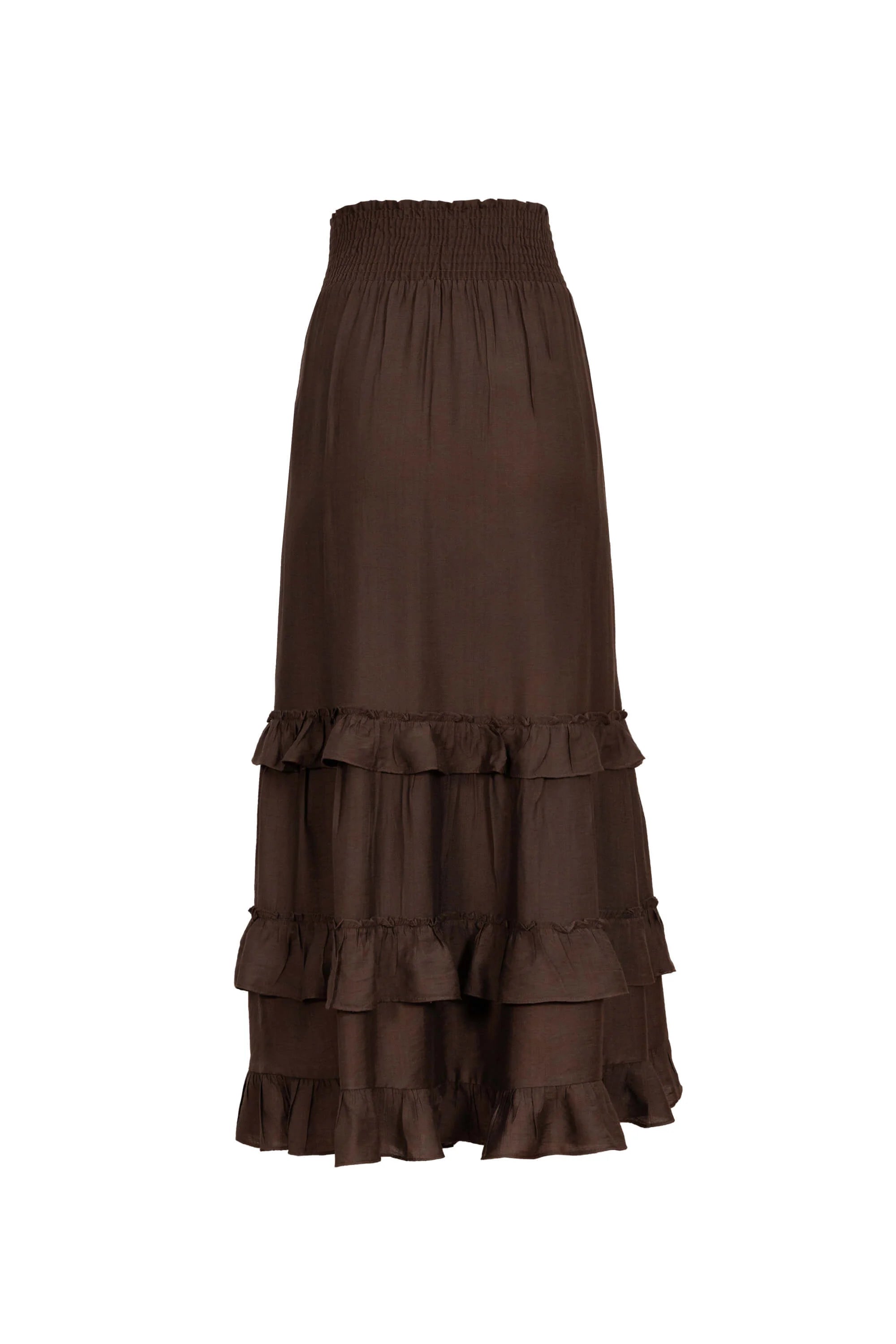 Esta falda midi negra con olanes es una pieza esencial para looks que mezclan libertad y elegancia. Su diseño con vuelos en capas aporta dinamismo, mientras la silueta alarga visualmente la figura.
