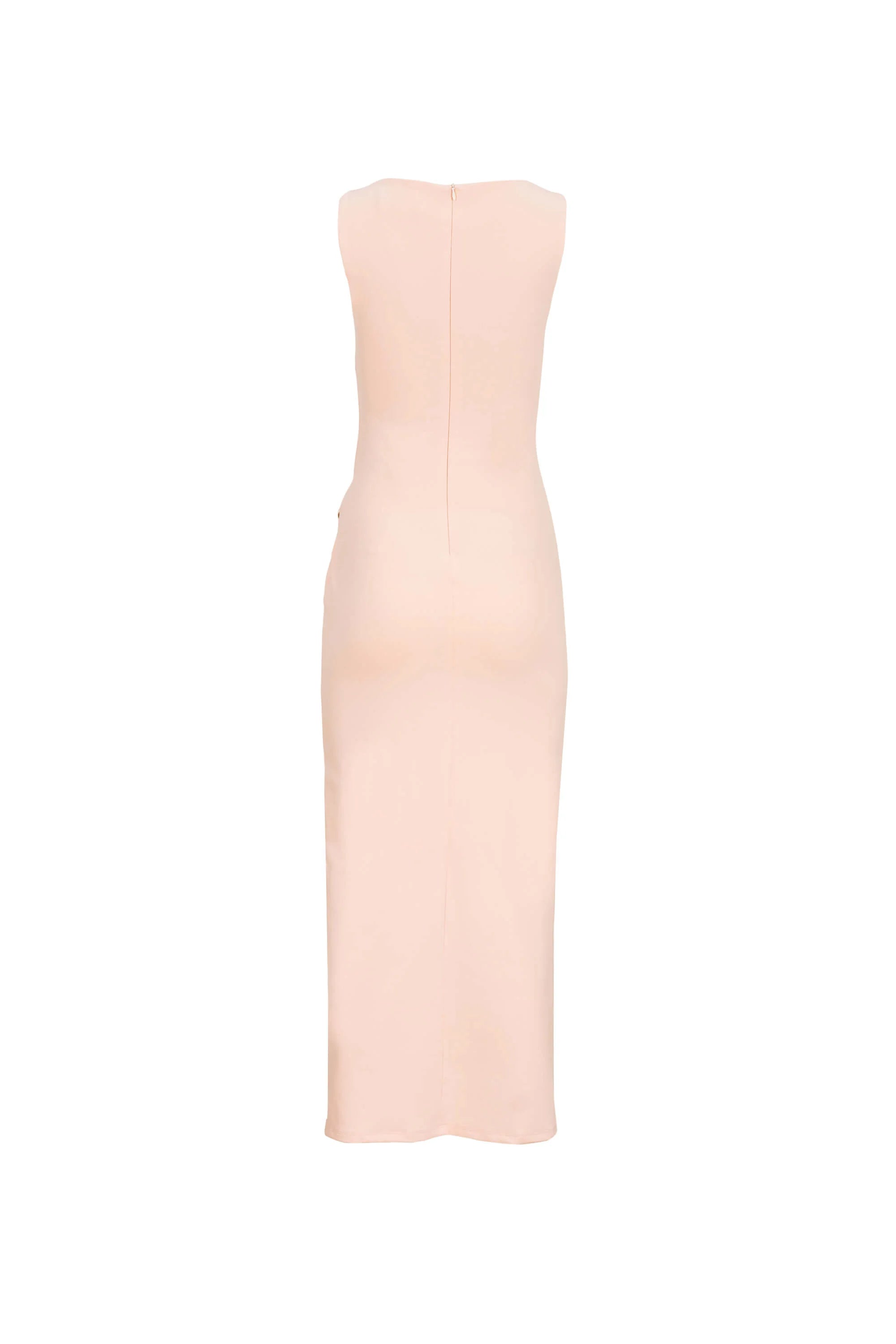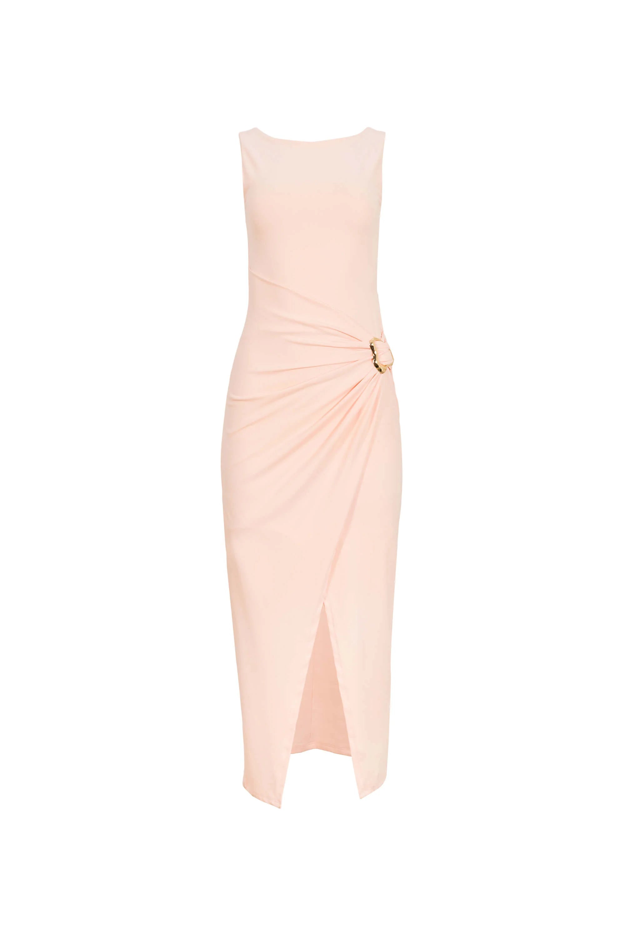 Maxi vestido asimétrico con detalle de hebilla dorada y pliegues en la cadera.