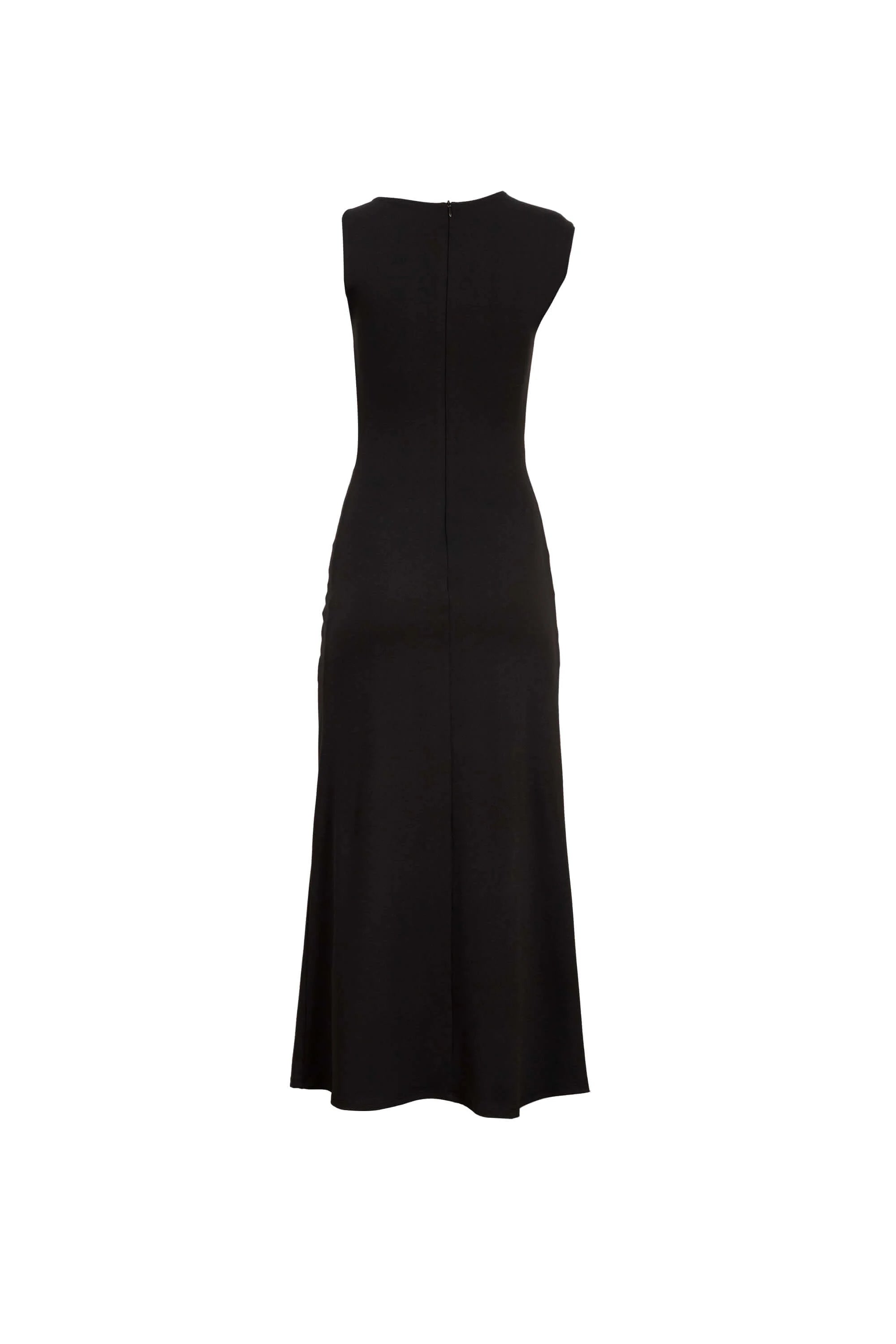 Vestido largo de licra negro con drapeado y broches en forma de estrella.