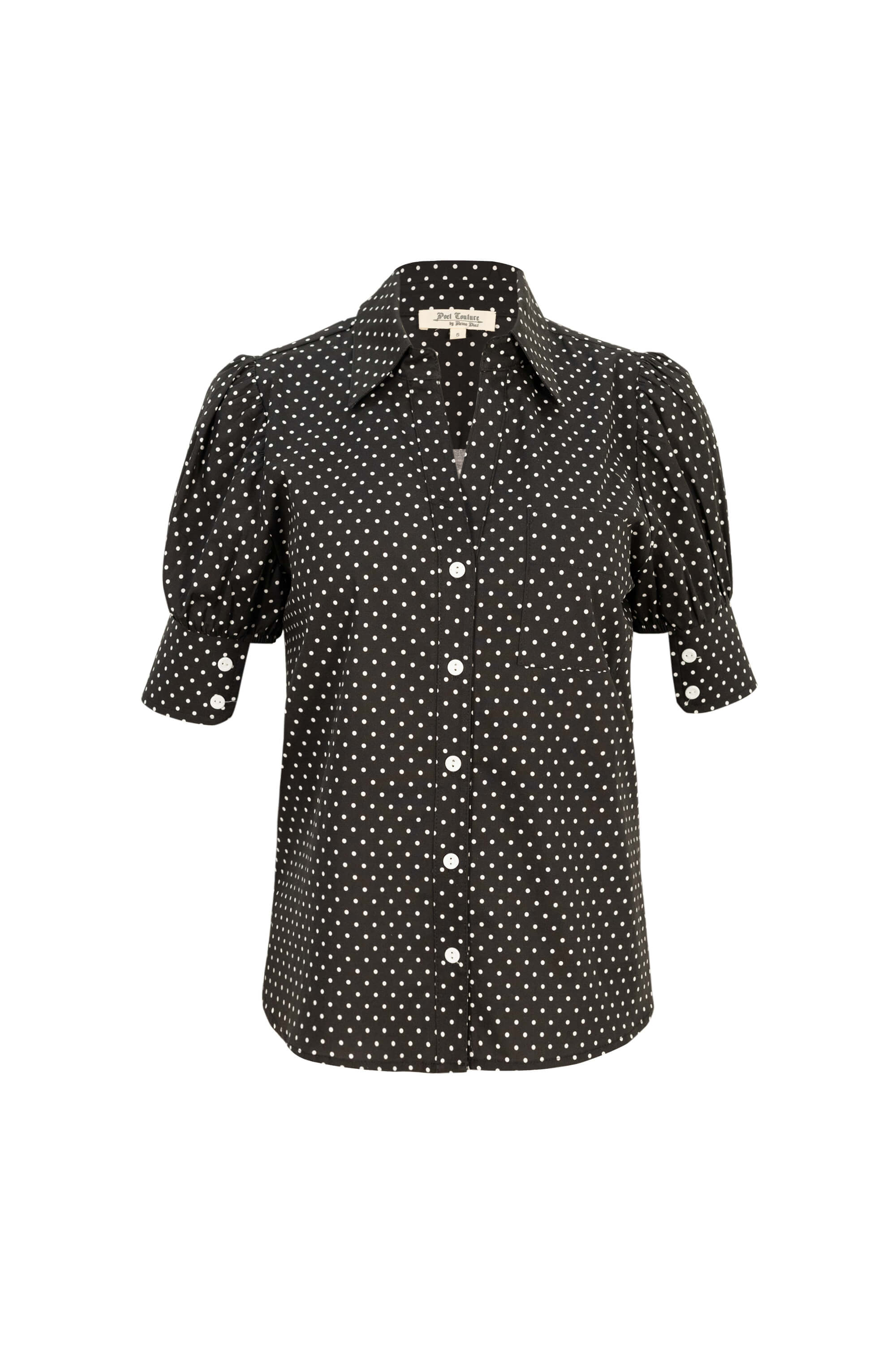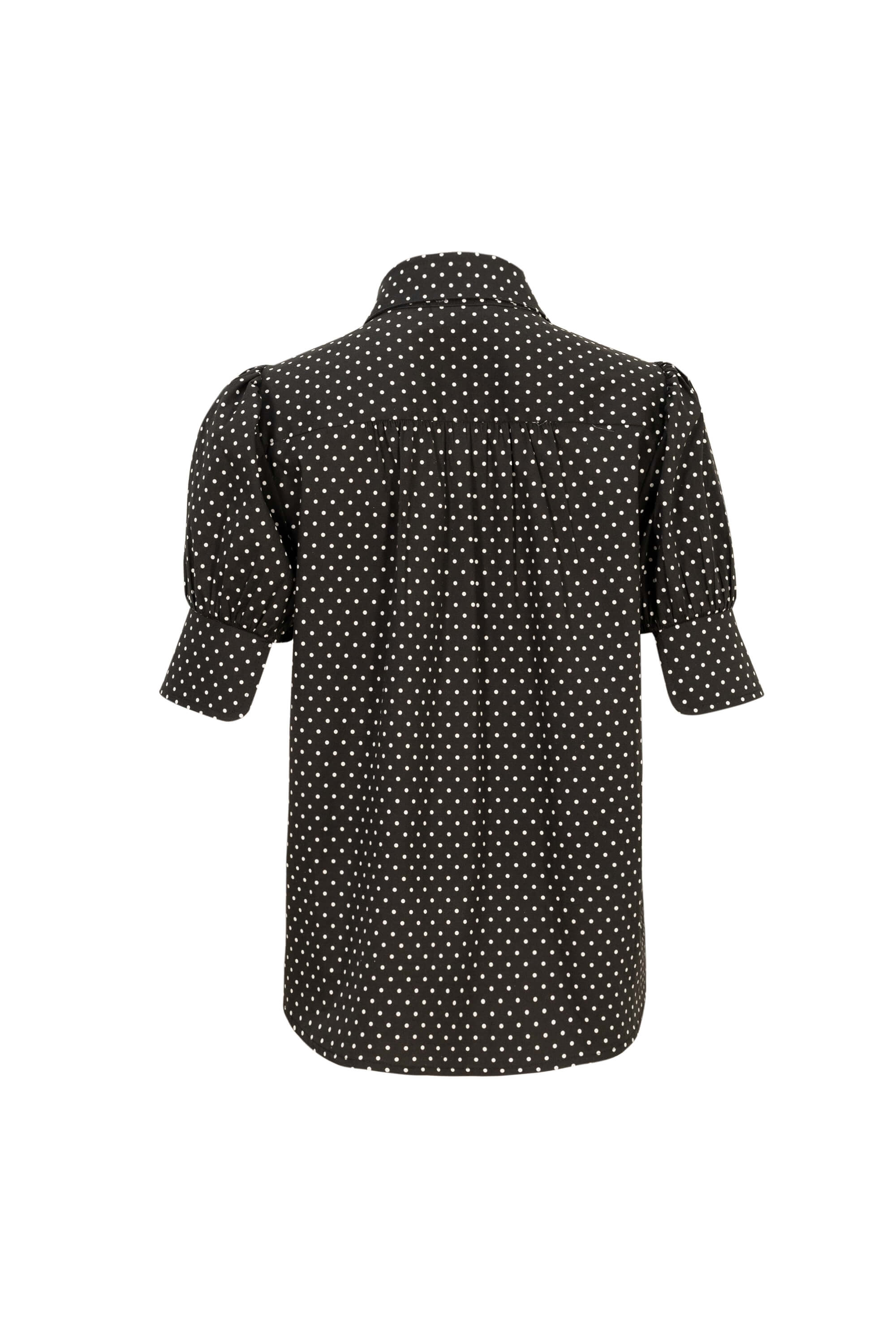 Clásica y atemporal, esta blusa combina la estructura de una camisa tradicional con el encanto romántico de las mangas princesa. Confeccionada en un tejido suave y ligero, presenta cuello camisero, botones frontales y un delicado estampado de lunares que aporta un aire femenino y sofisticado. Un diseño versátil que transita con elegancia entre lo casual y lo formal, ideal para looks de día con carácter y estilo.