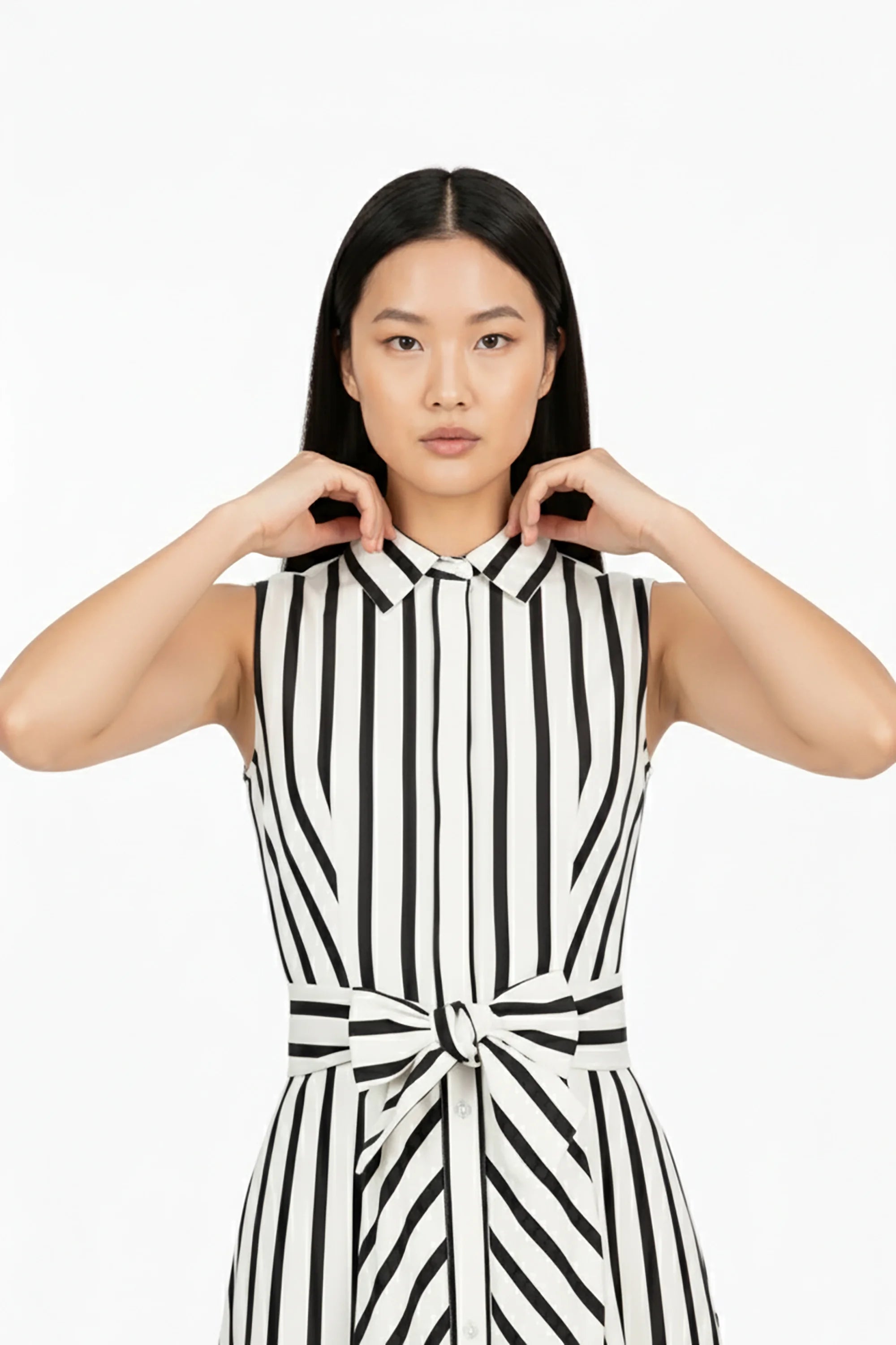 El vestido midi de manga resacada es una prenda que combina frescura, elegancia y un aire contemporáneo. Su diseño sin mangas estiliza los brazos, mientras que el cuello camisero y el frente abotonado aportan un detalle clásico renovado. El cinturón anudado en la cintura define la silueta con sutileza, creando un efecto femenino y sofisticado.