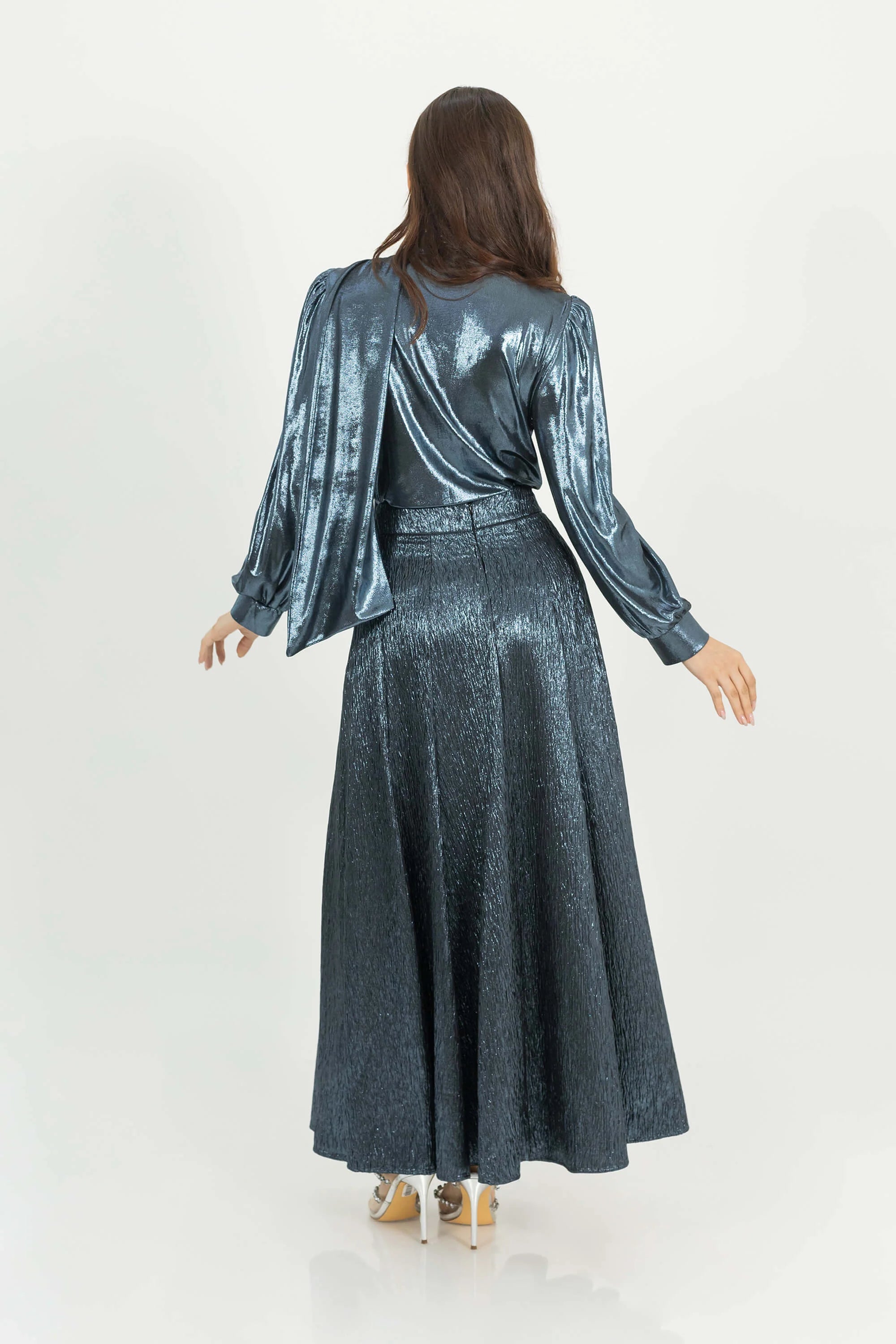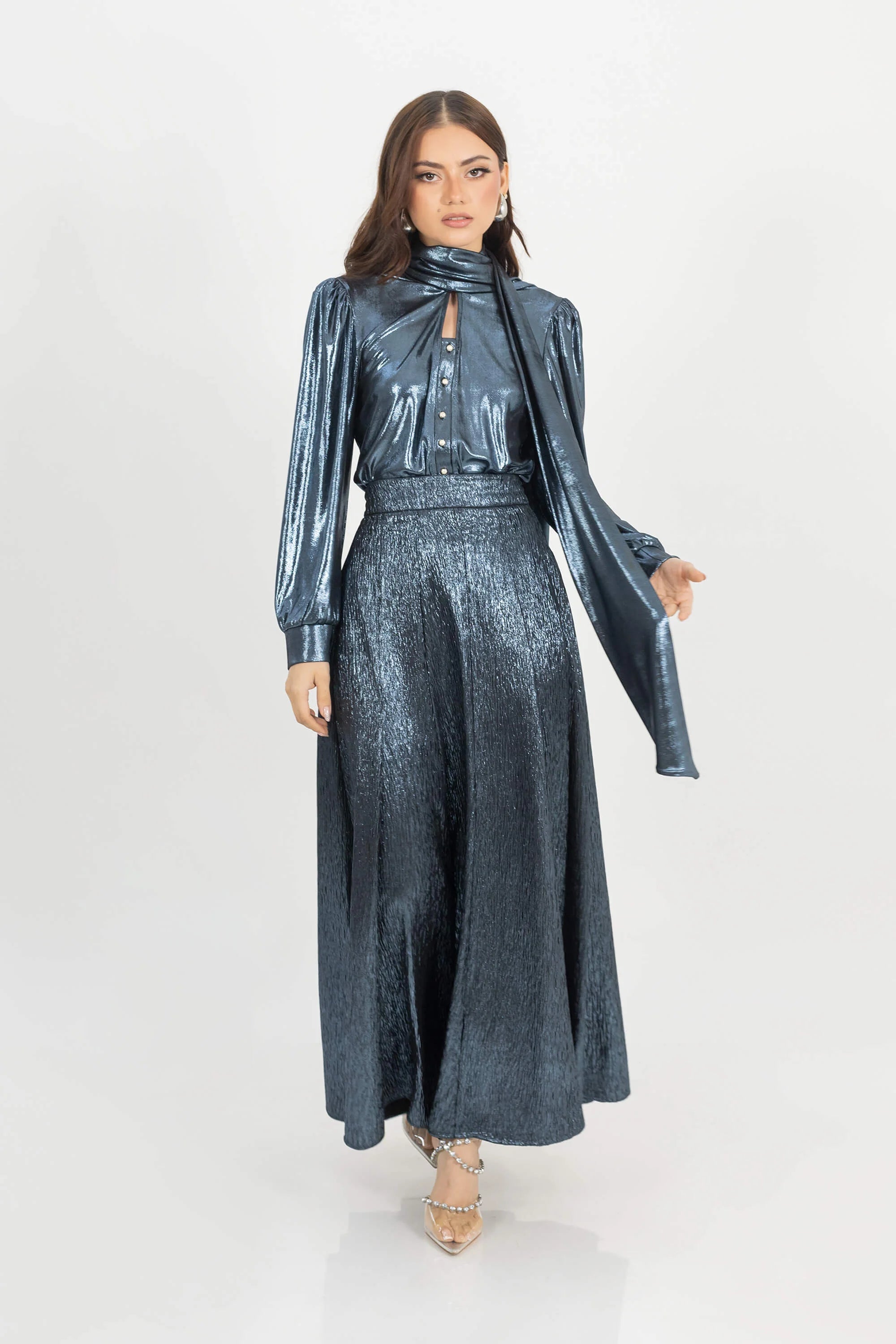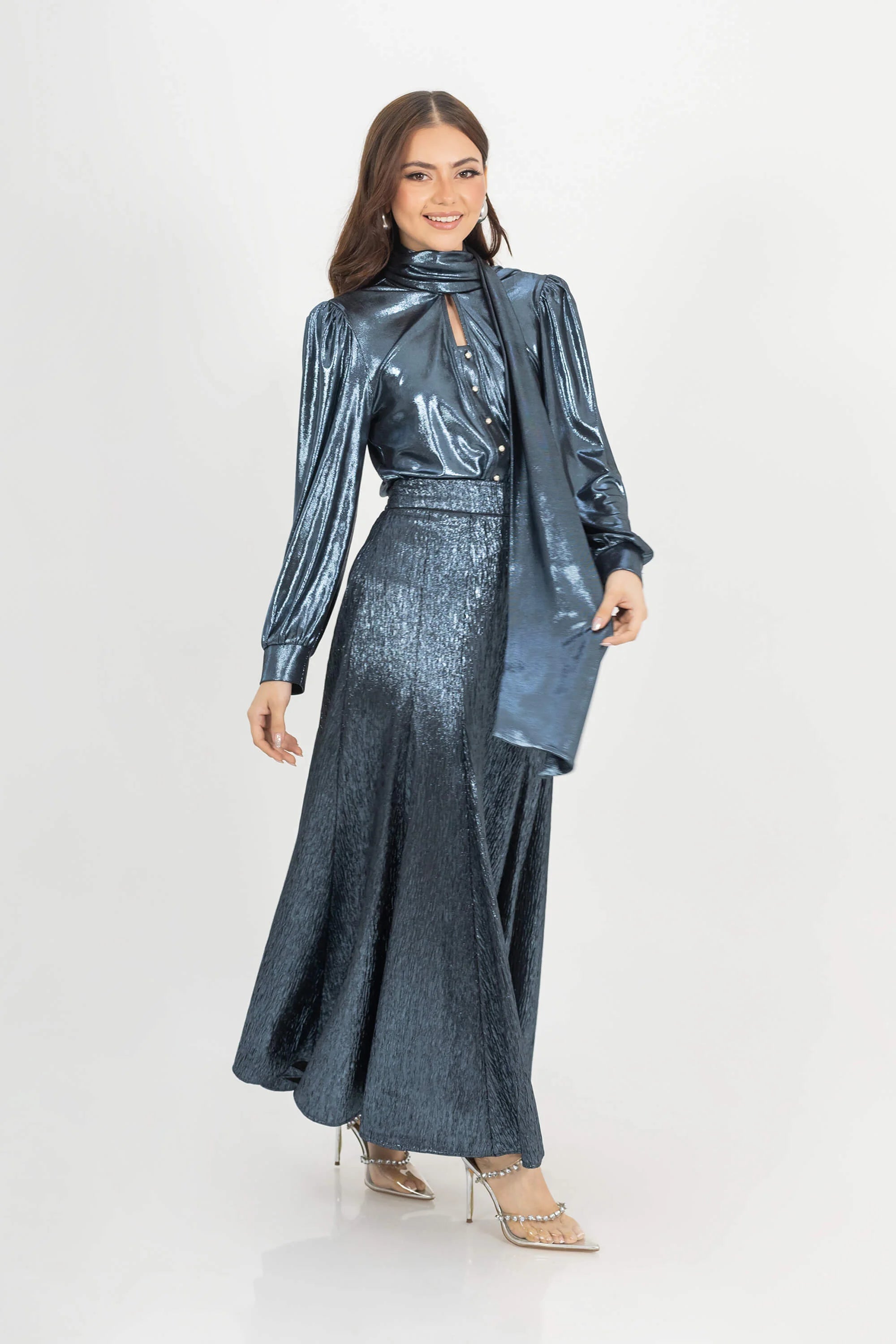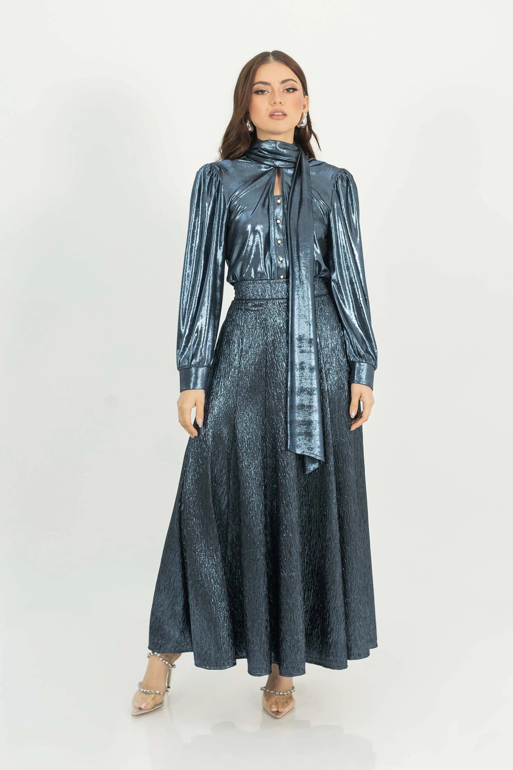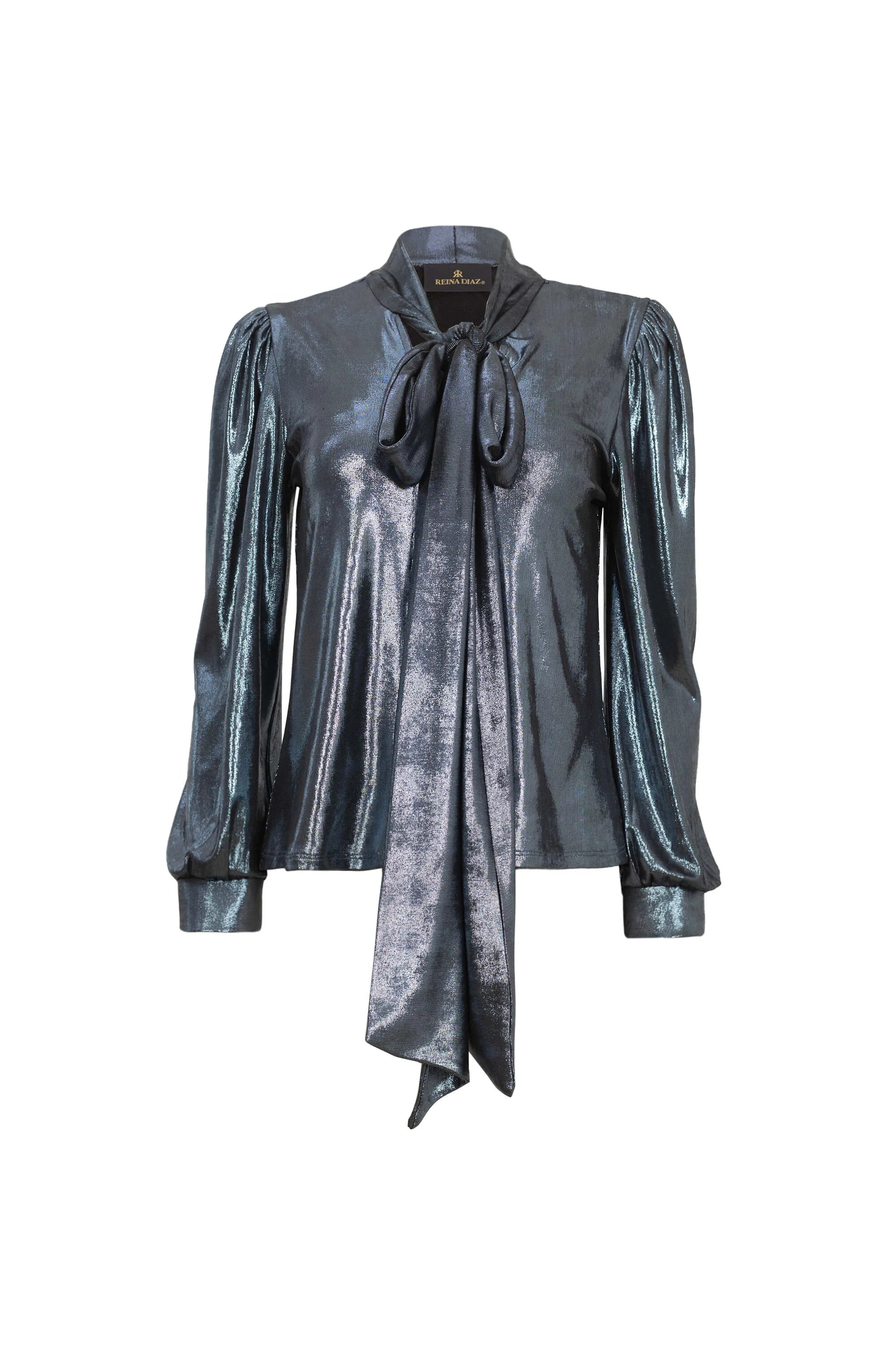 La blusa manga larga con corbata es una pieza que combina a la perfección elegancia clásica y modernidad. Confeccionada en un tejido con sutil brillo metálico, esta blusa se convierte en el centro de atención de cualquier look, aportando un aire refinado y contemporáneo.