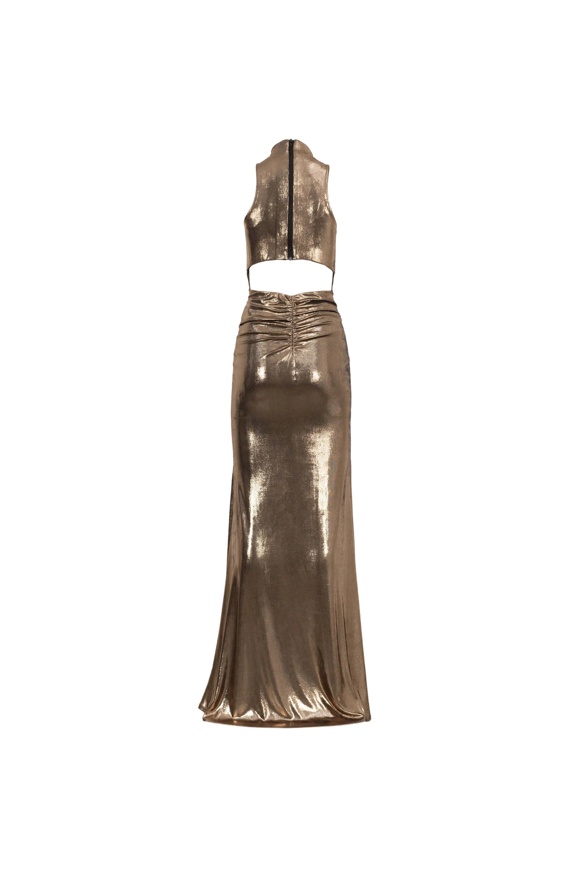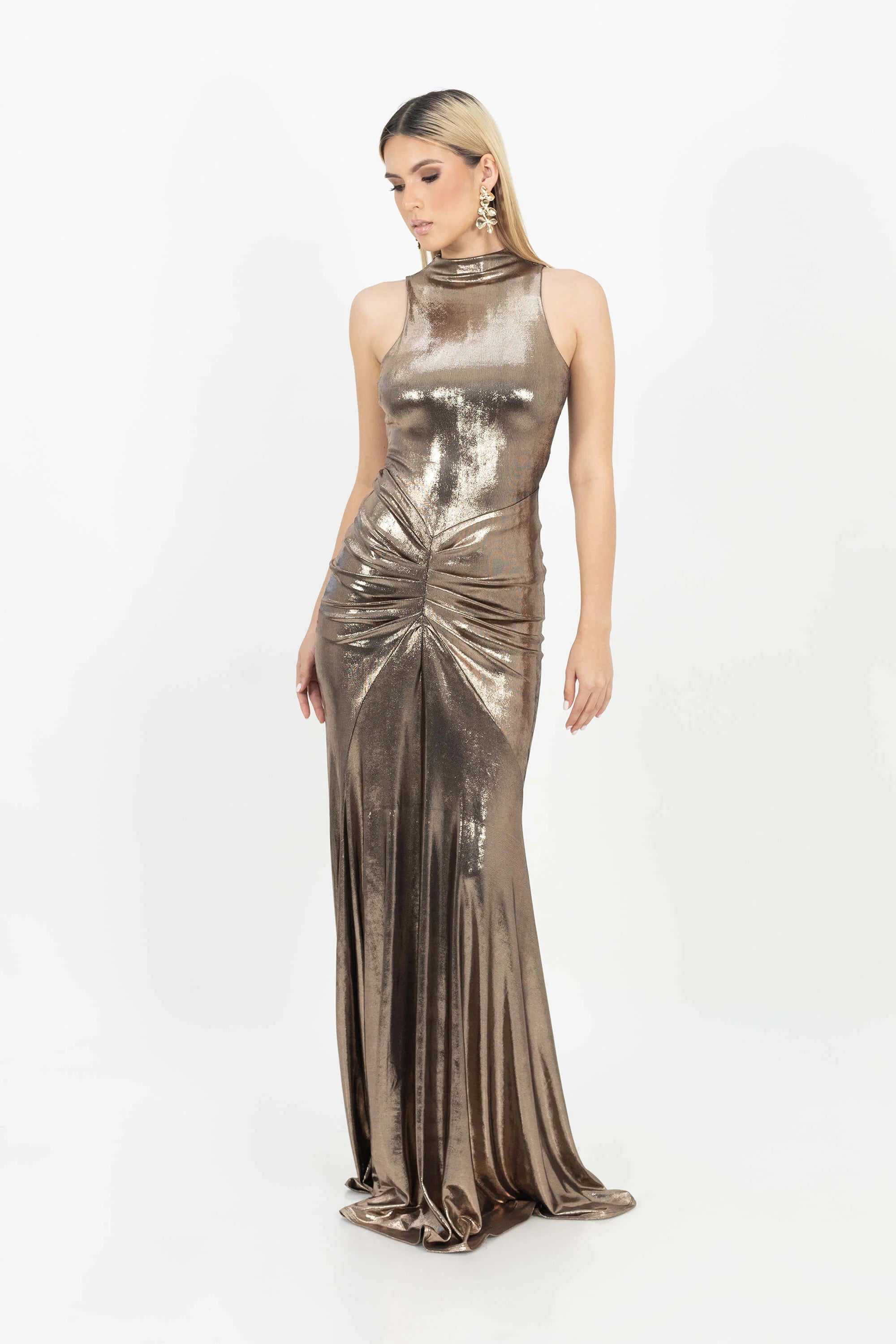 Vestido maxi metálico cuello chimenea y sisa resacada.