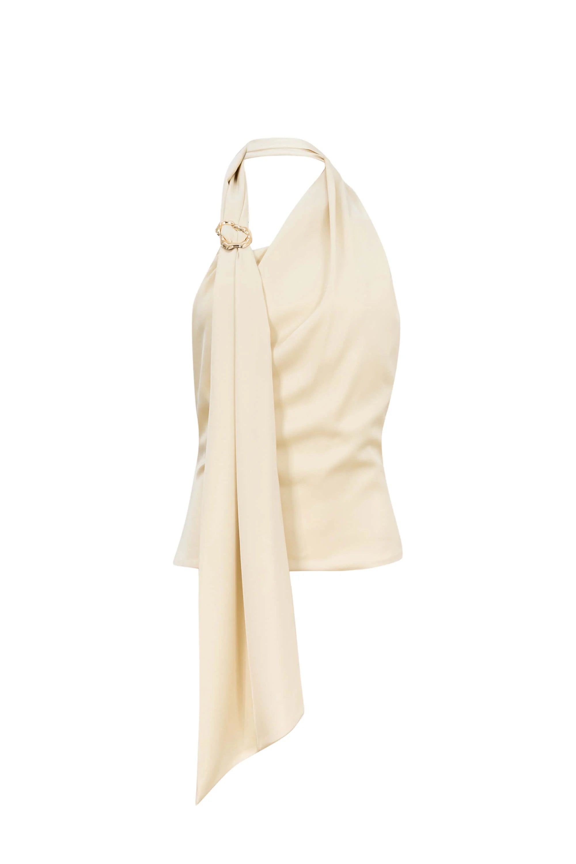 La blusa asimétrica de un hombro con tira para cuello de Poet Couture combina elegancia y modernidad. Su diseño fluido con detalle metálico en el cuello crea una silueta sofisticada, ideal para eventos formales o looks de noche con un toque refinado.