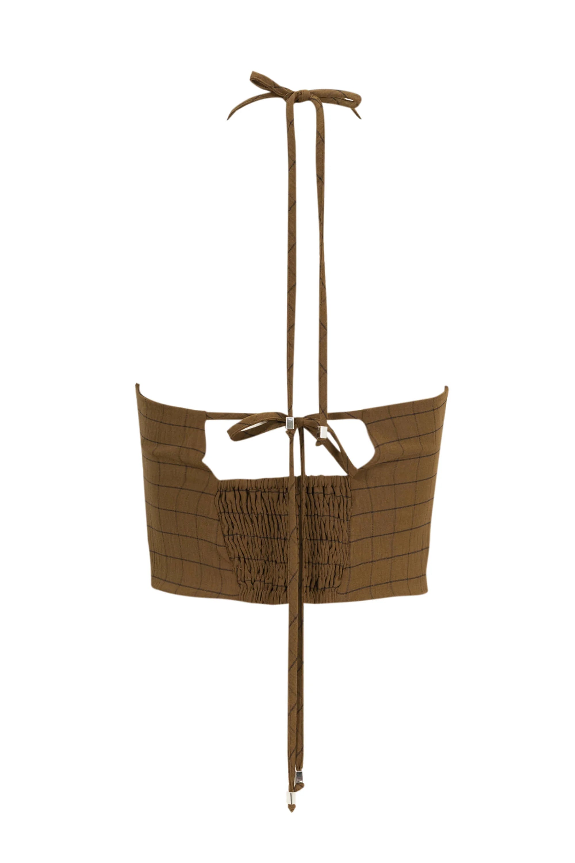 El top halter con cordón y espalda enresortada de Poet Couture es una pieza versátil y moderna. Su diseño ajustado y cuello con detalle metálico realzan el cuello y los hombros, aportando un toque contemporáneo a cualquier look. Ideal para usar con faldas o pantalones de talle alto.