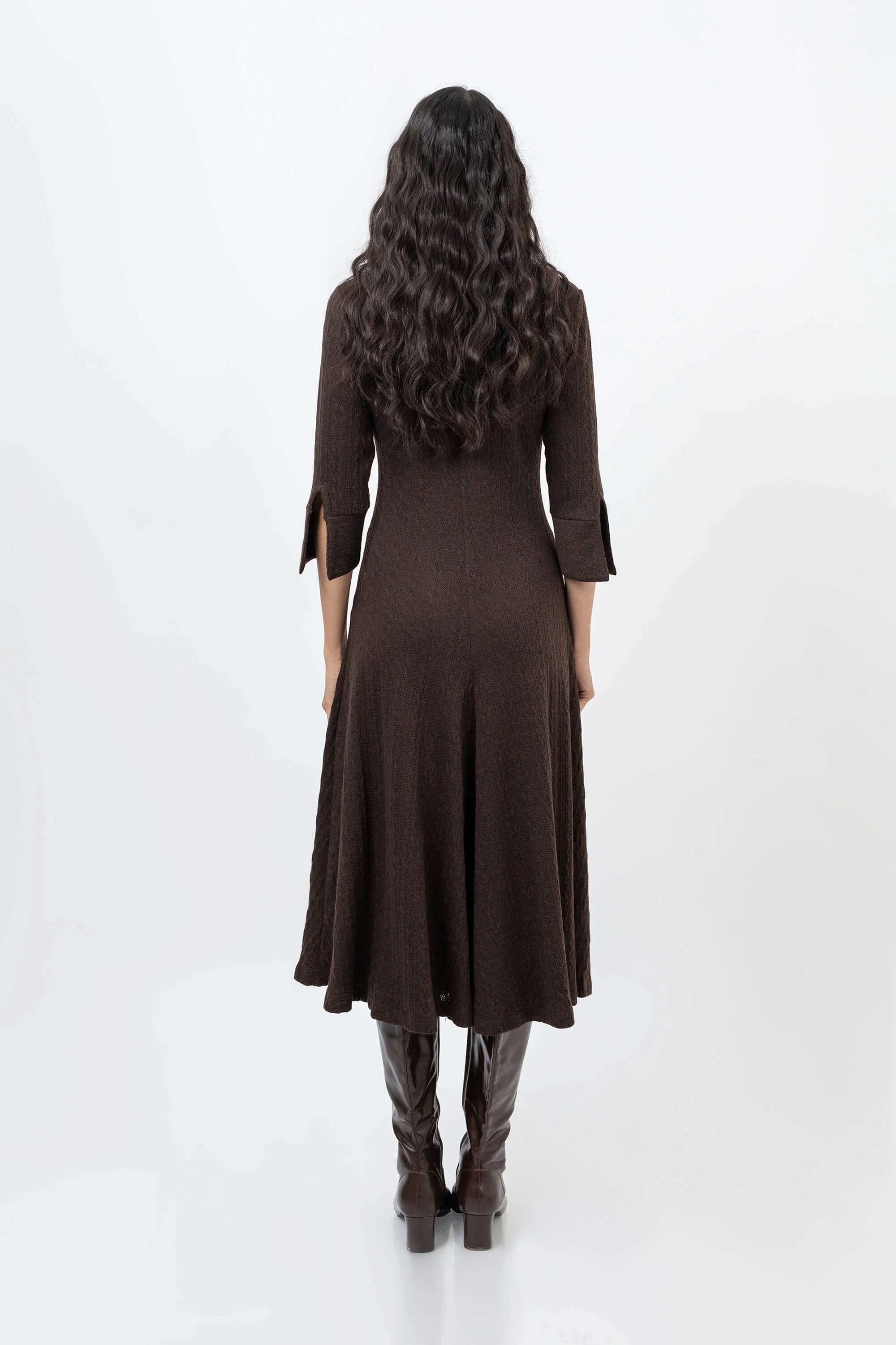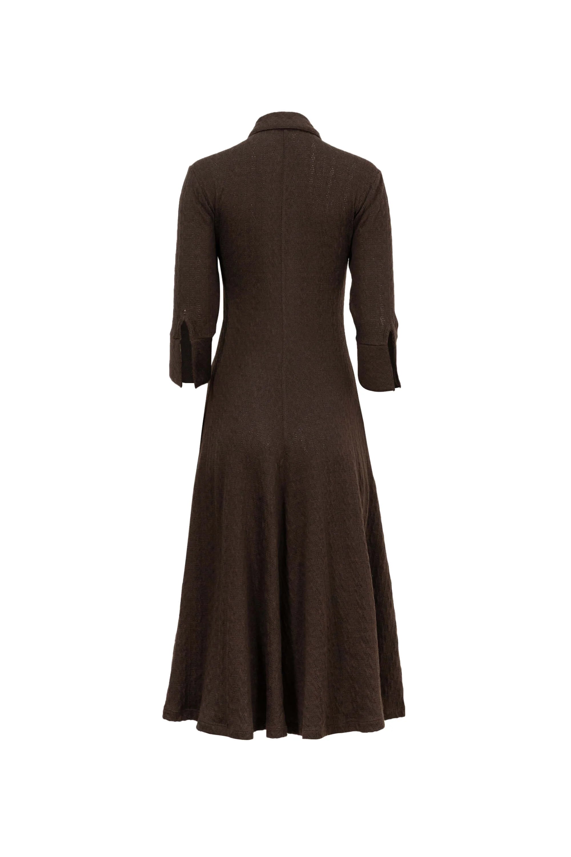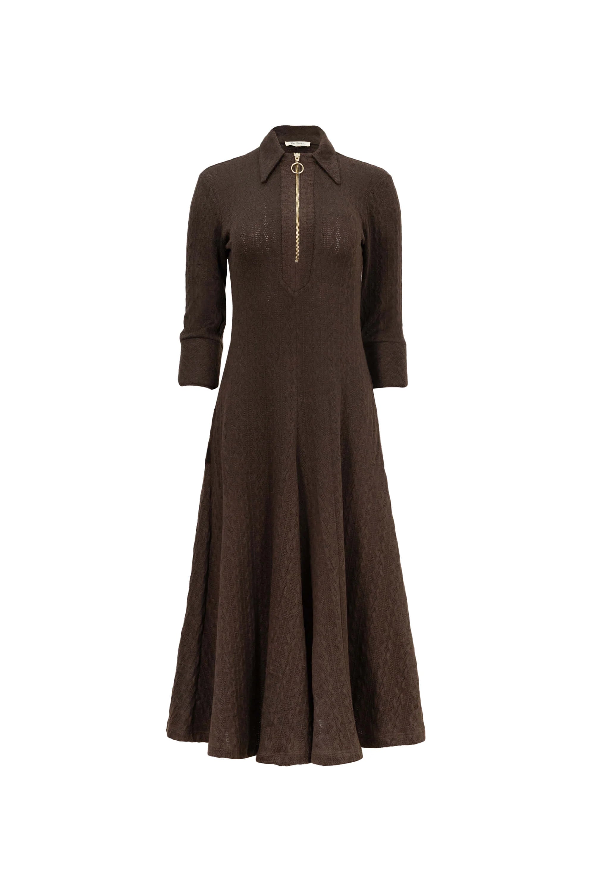 Vestido midi con cierre frontal y manga tres cuartos de Poet Couture es una expresión de elegancia atemporal. Confeccionado en tejido suave de textura ligera, su silueta acentúa la figura con un corte evasé y detalles de confección impecables. El cierre metálico al frente y el cuello camisero añaden un toque contemporáneo, ideal para looks urbanos o sofisticados de día. Una prenda versátil y refinada que combina estilo y funcionalidad.