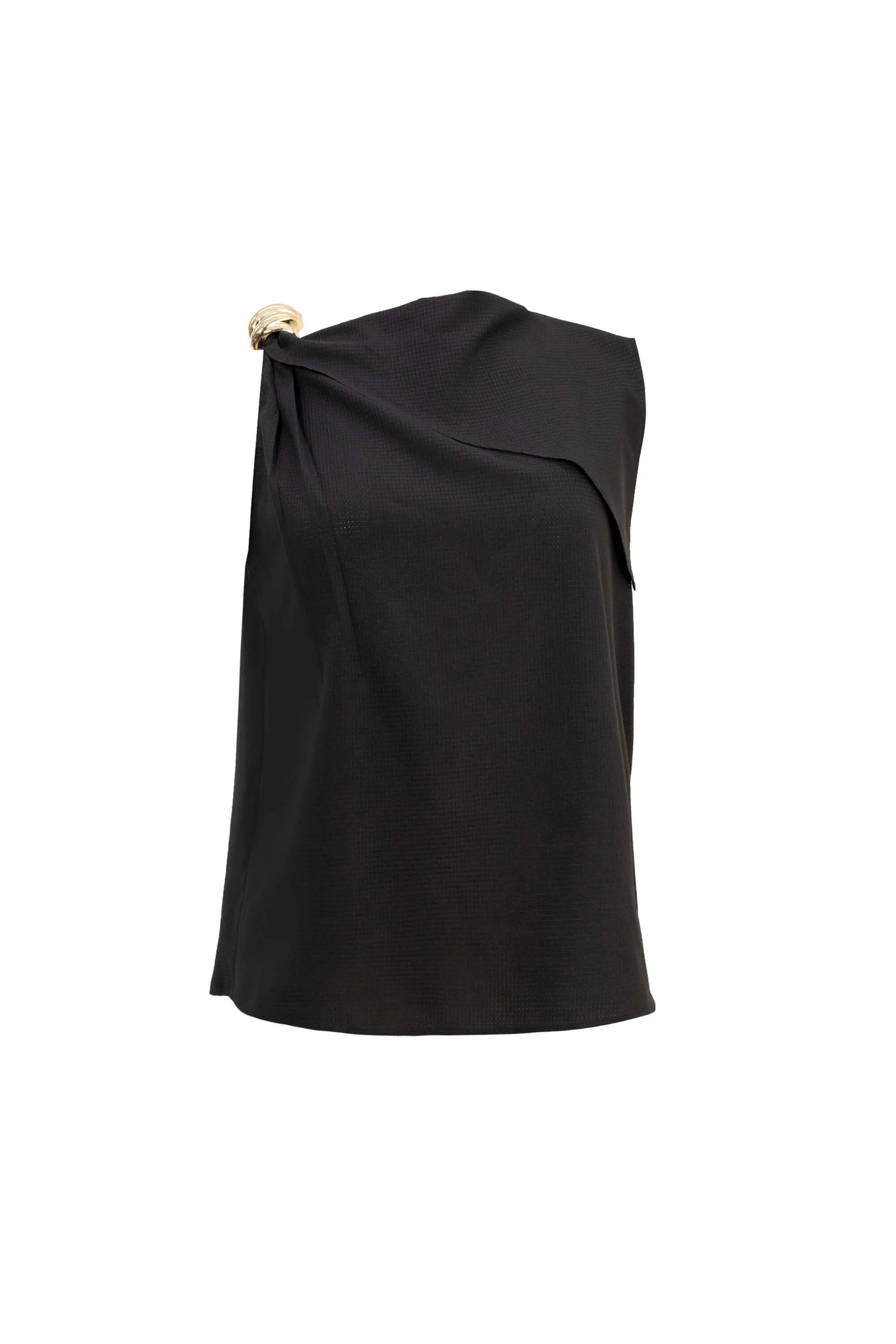 La Blusa sin manga con herraje de Reina Díaz combina minimalismo y sofisticación en una pieza versátil y moderna. Su escote drapeado se une mediante un delicado herraje metálico que aporta un toque de lujo sutil. Confeccionada en un tejido fluido de tacto suave, es perfecta para crear looks elegantes tanto de día como de noche, elevando cualquier conjunto con distinción.