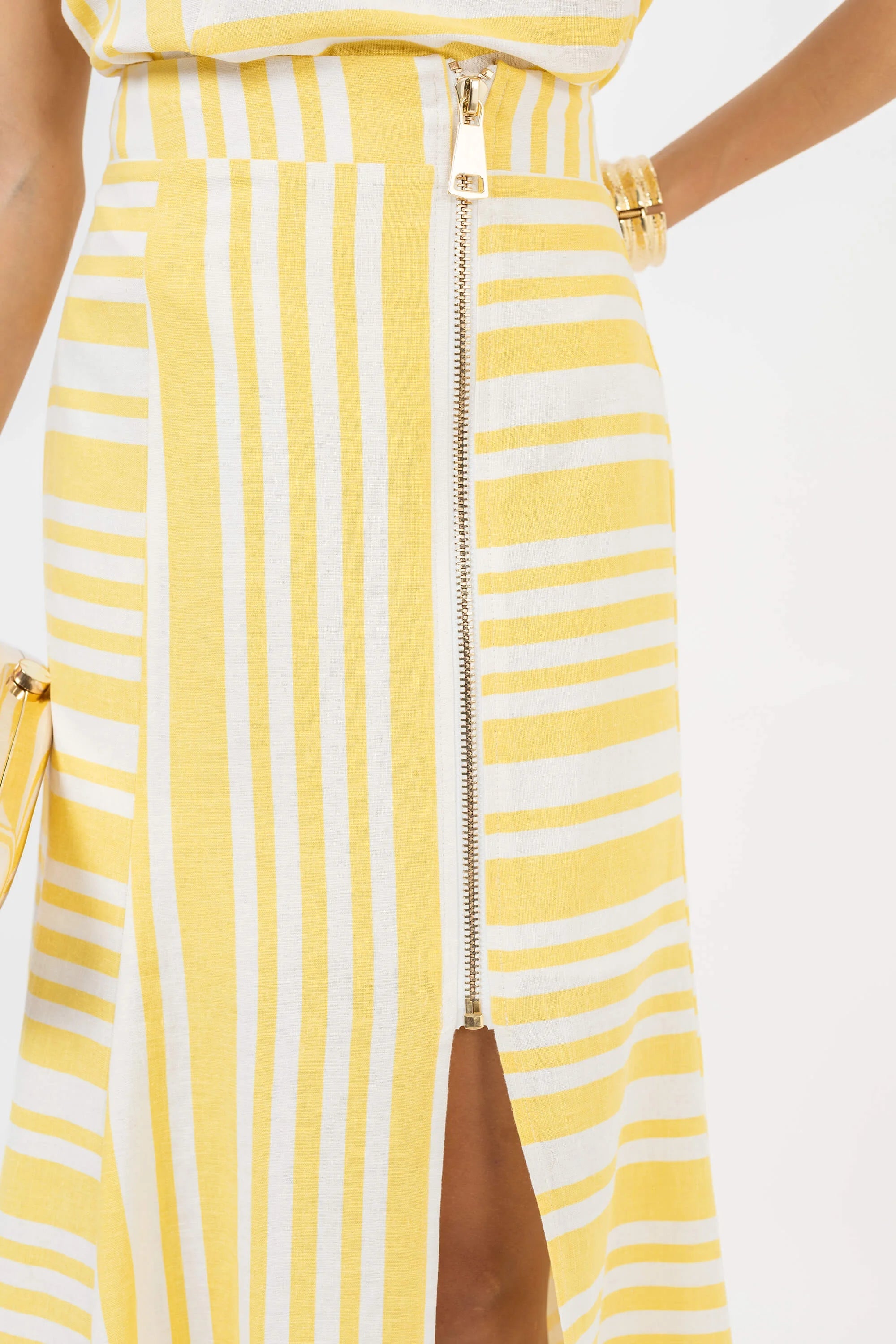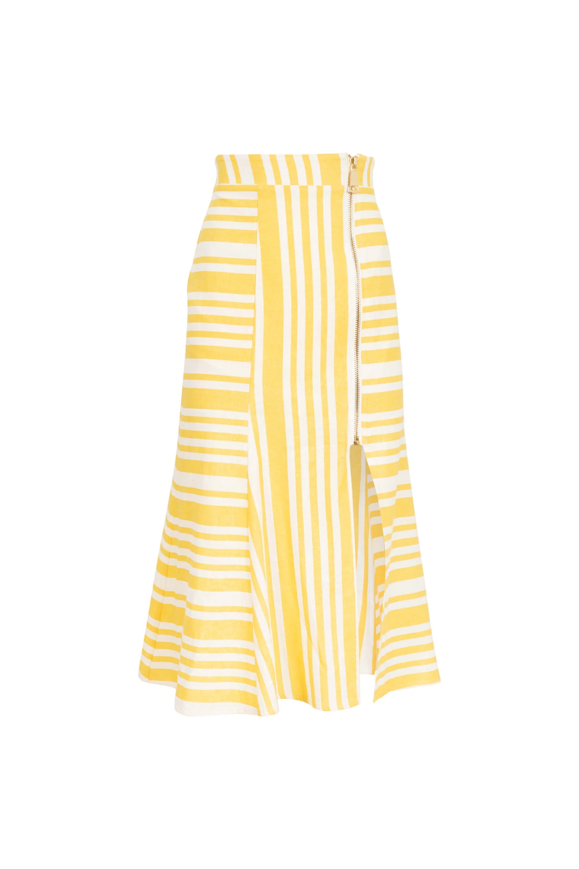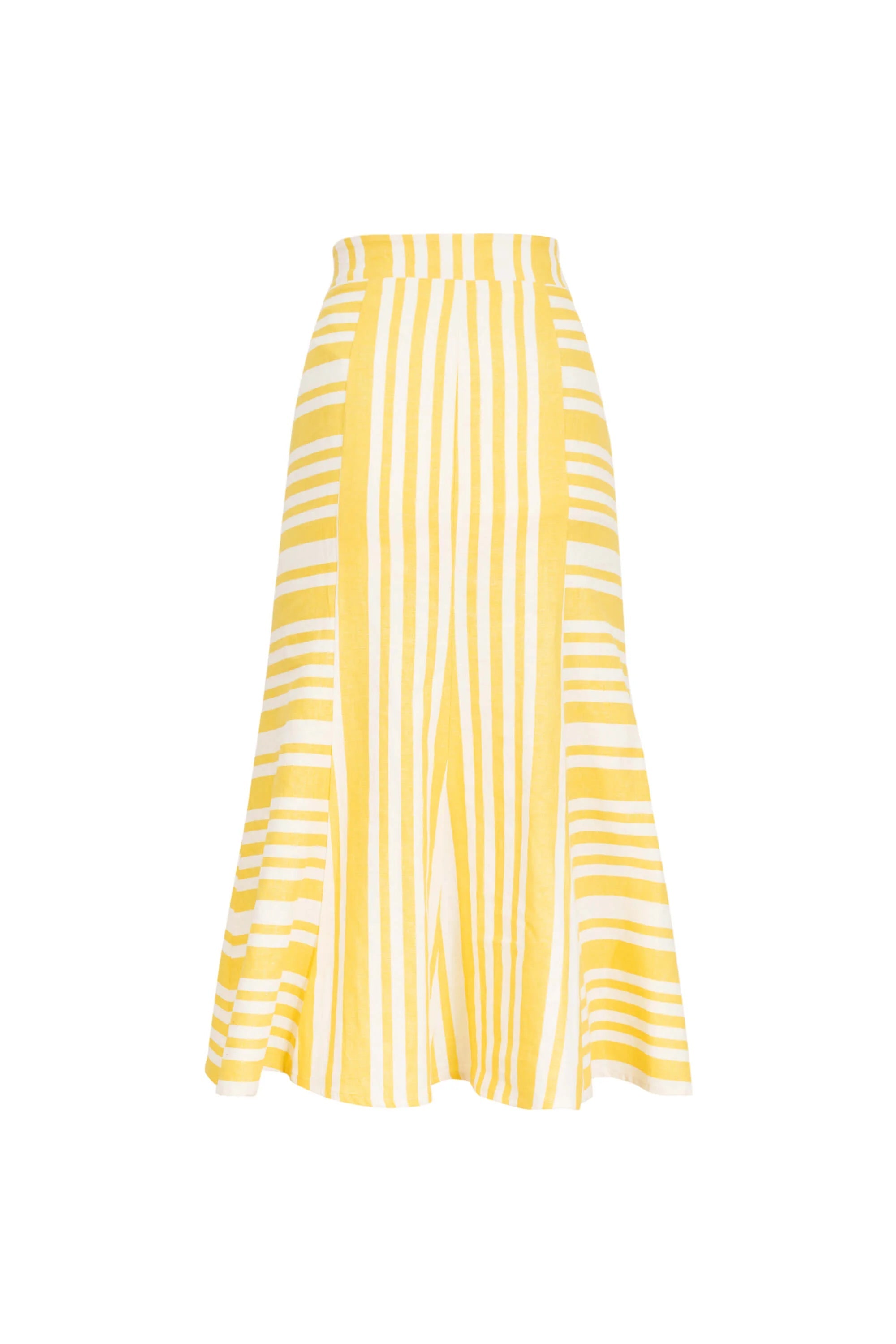 Falda midi asimétrica de lino a rayas blancas y amarillas.