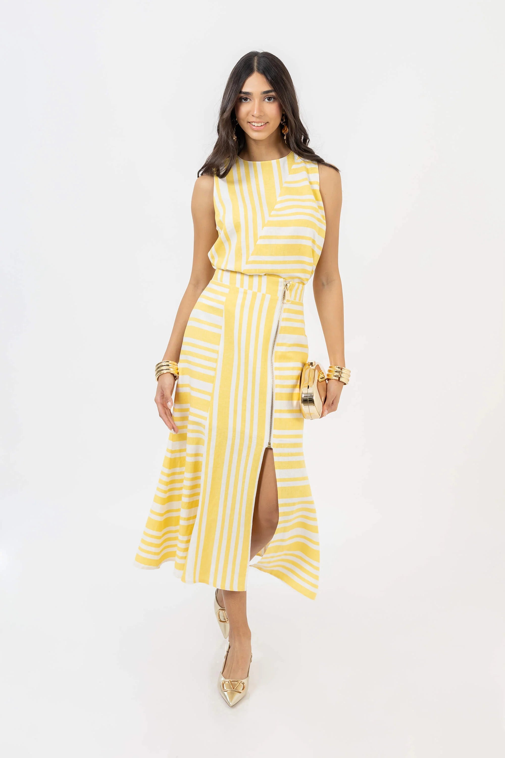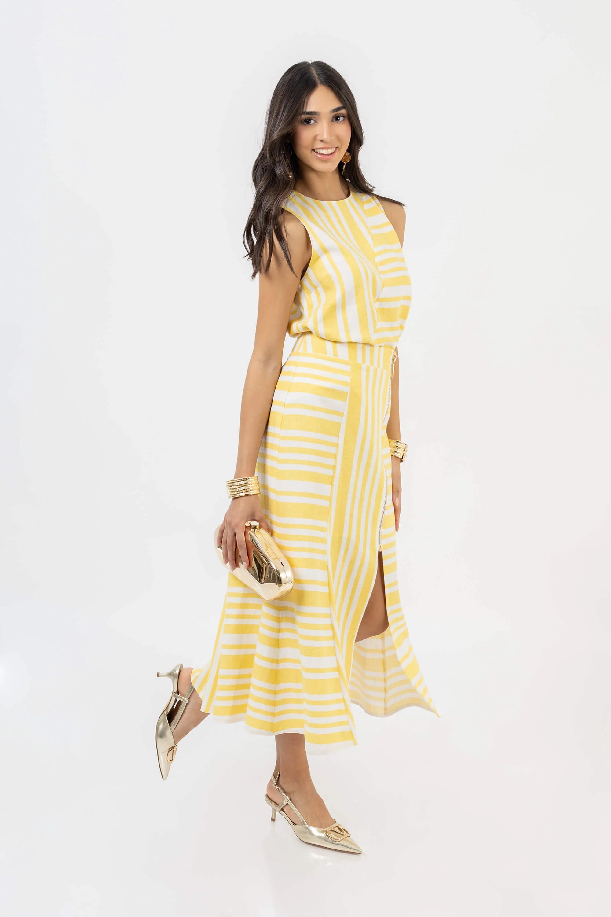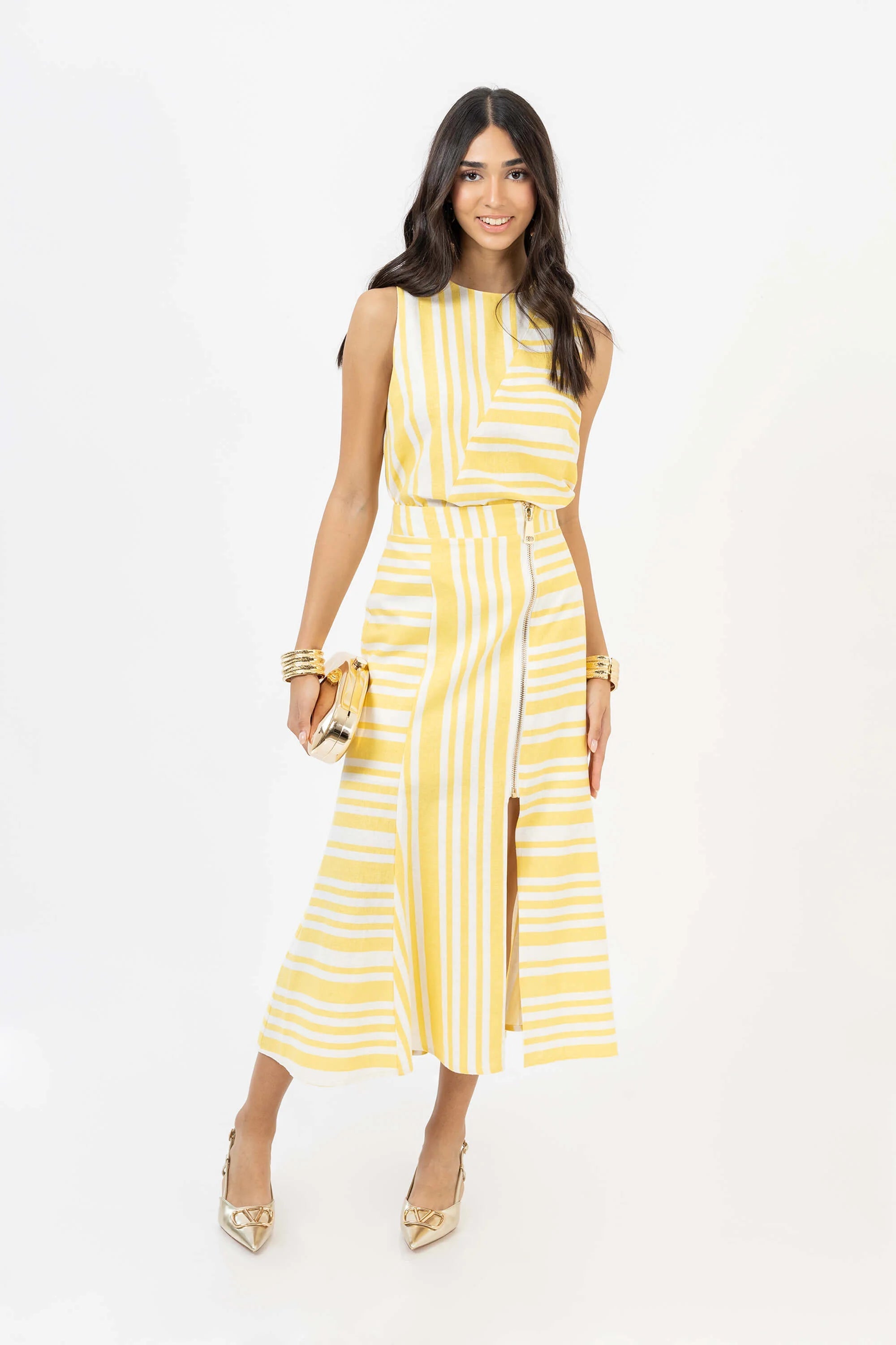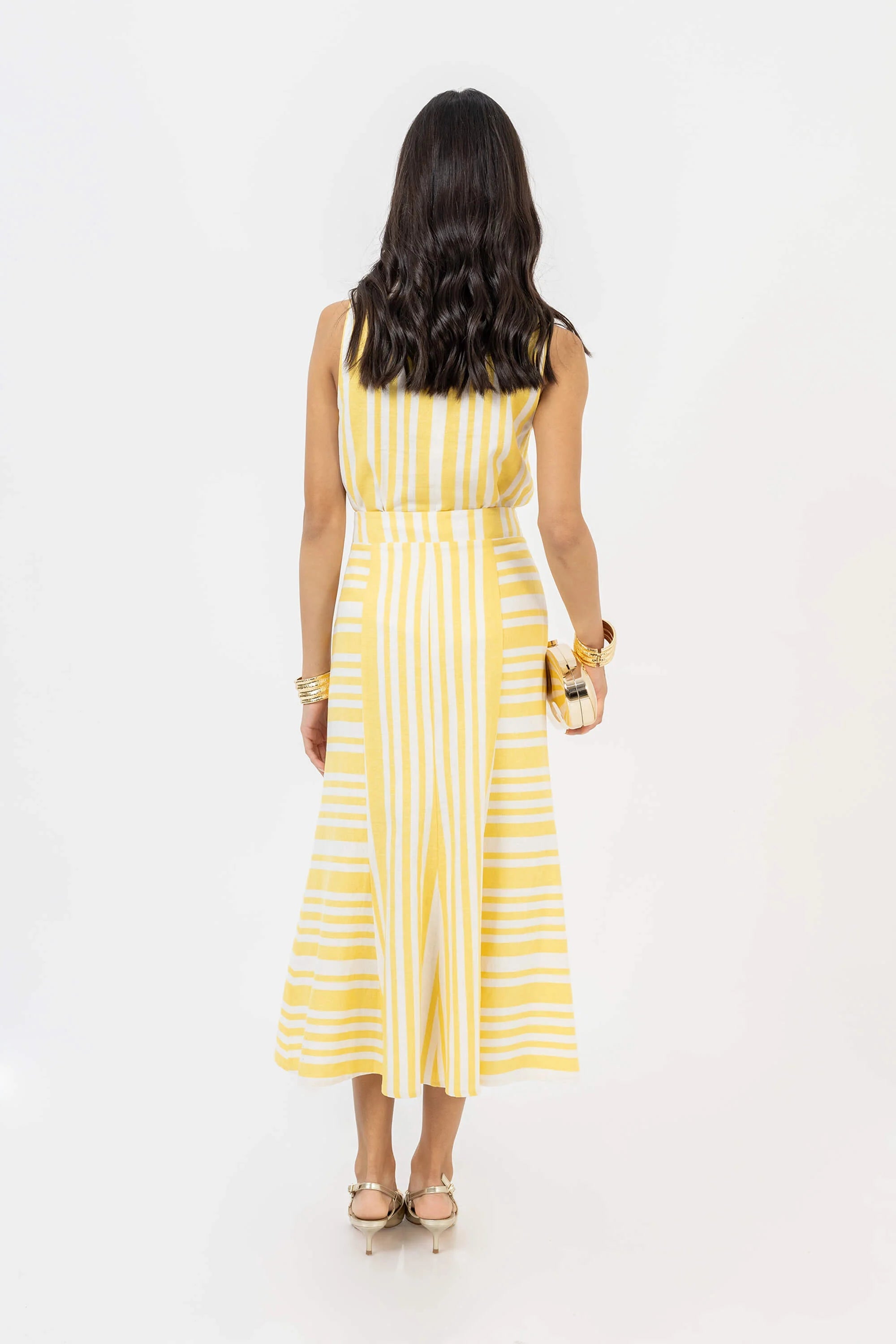 Falda midi asimétrica de lino a rayas blancas y amarillas.