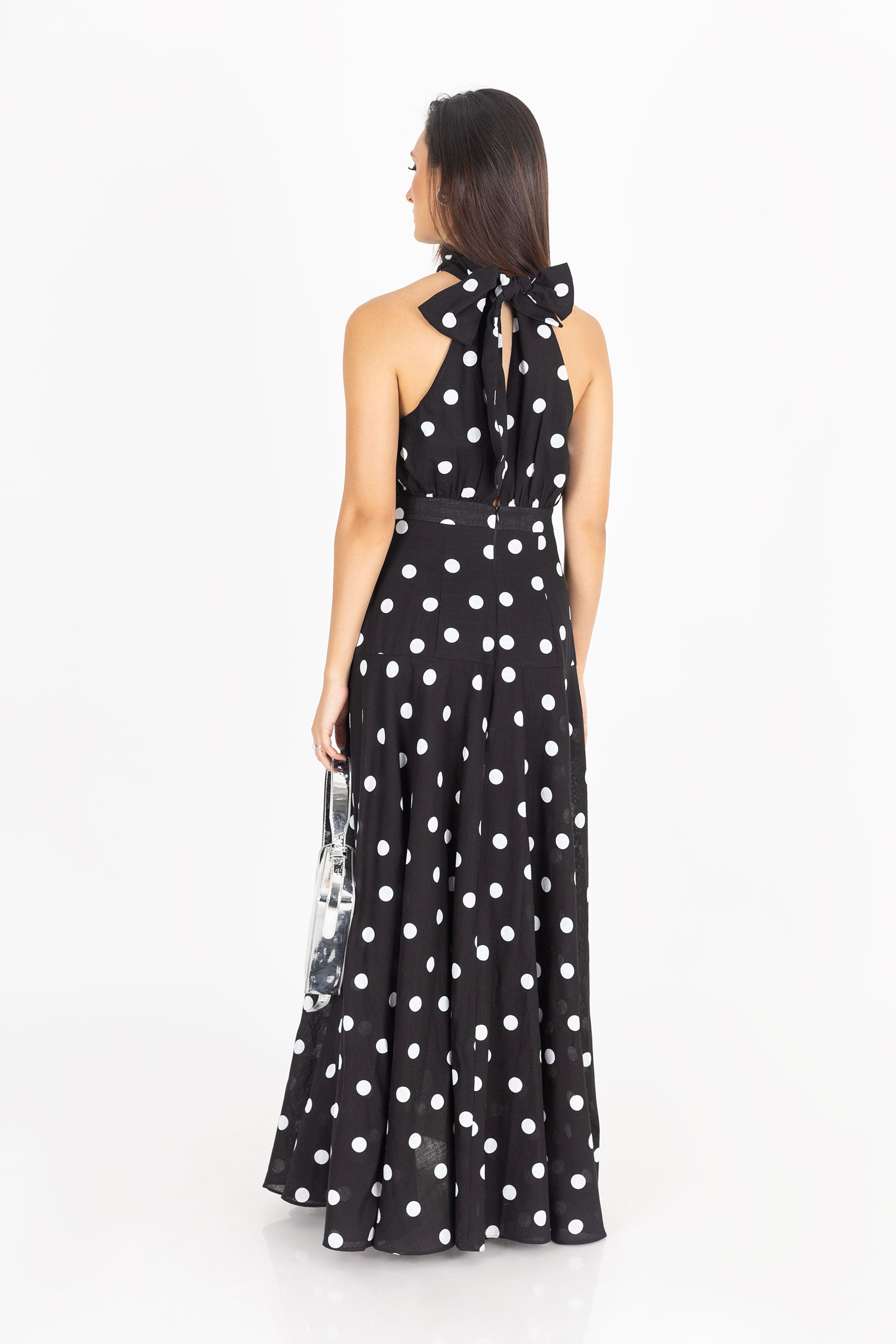 Este vestido sin mangas con cuello alto y tiras de amarre captura la esencia del glamour atemporal con un toque moderno. Su silueta halter enmarca los hombros y alarga visualmente el cuello, mientras que la falda circular de amplio vuelo brinda movimiento y presencia escénica con cada paso.