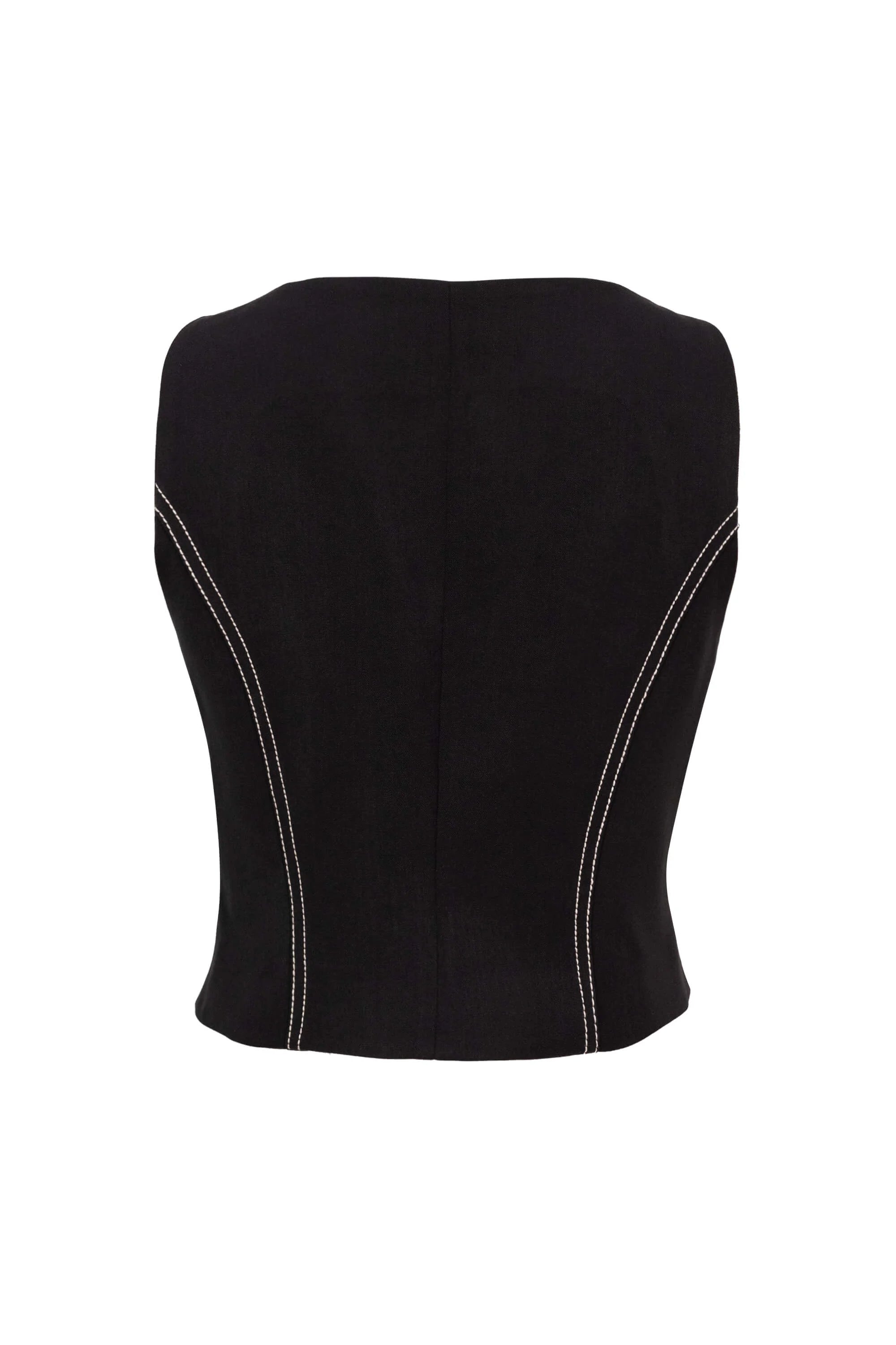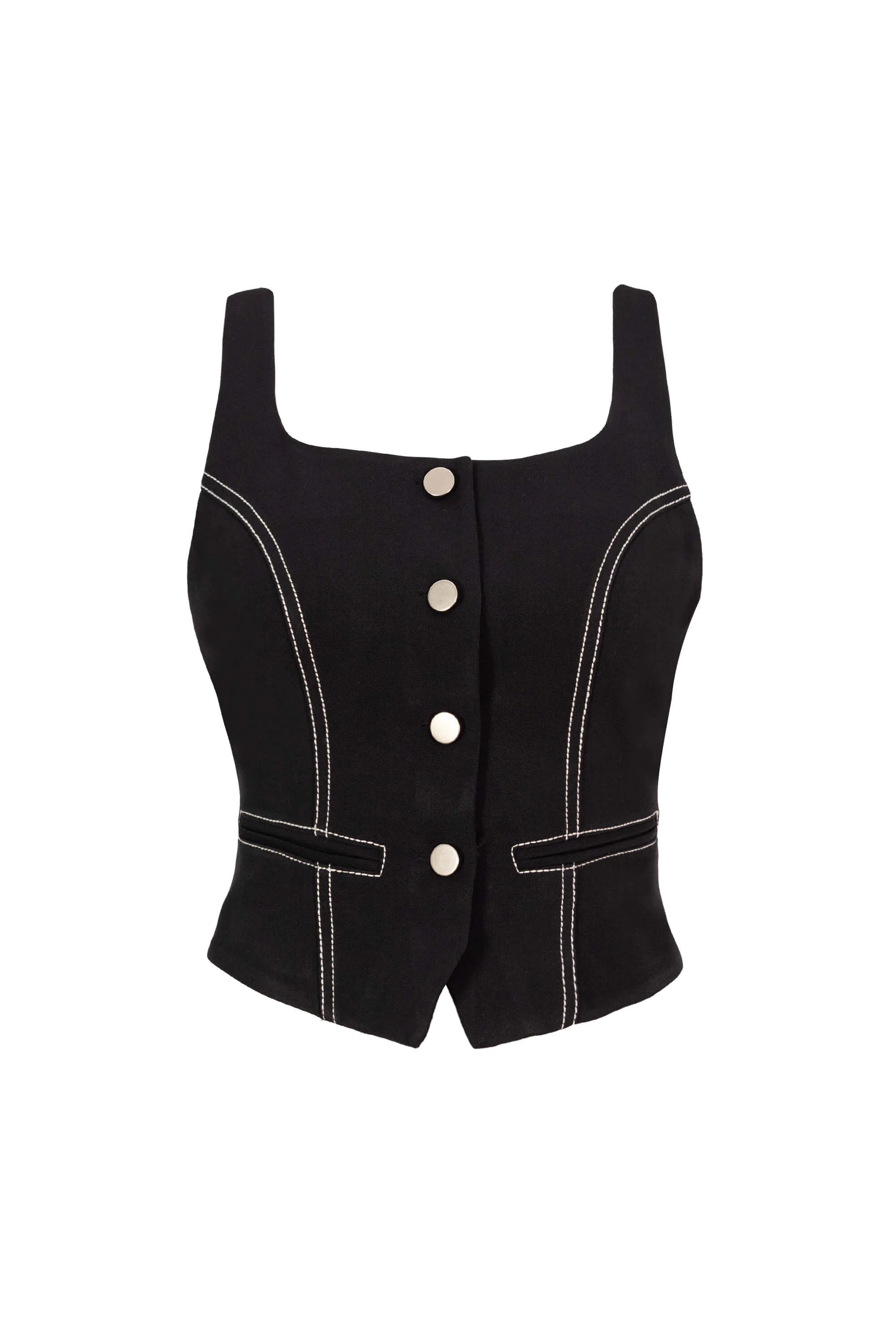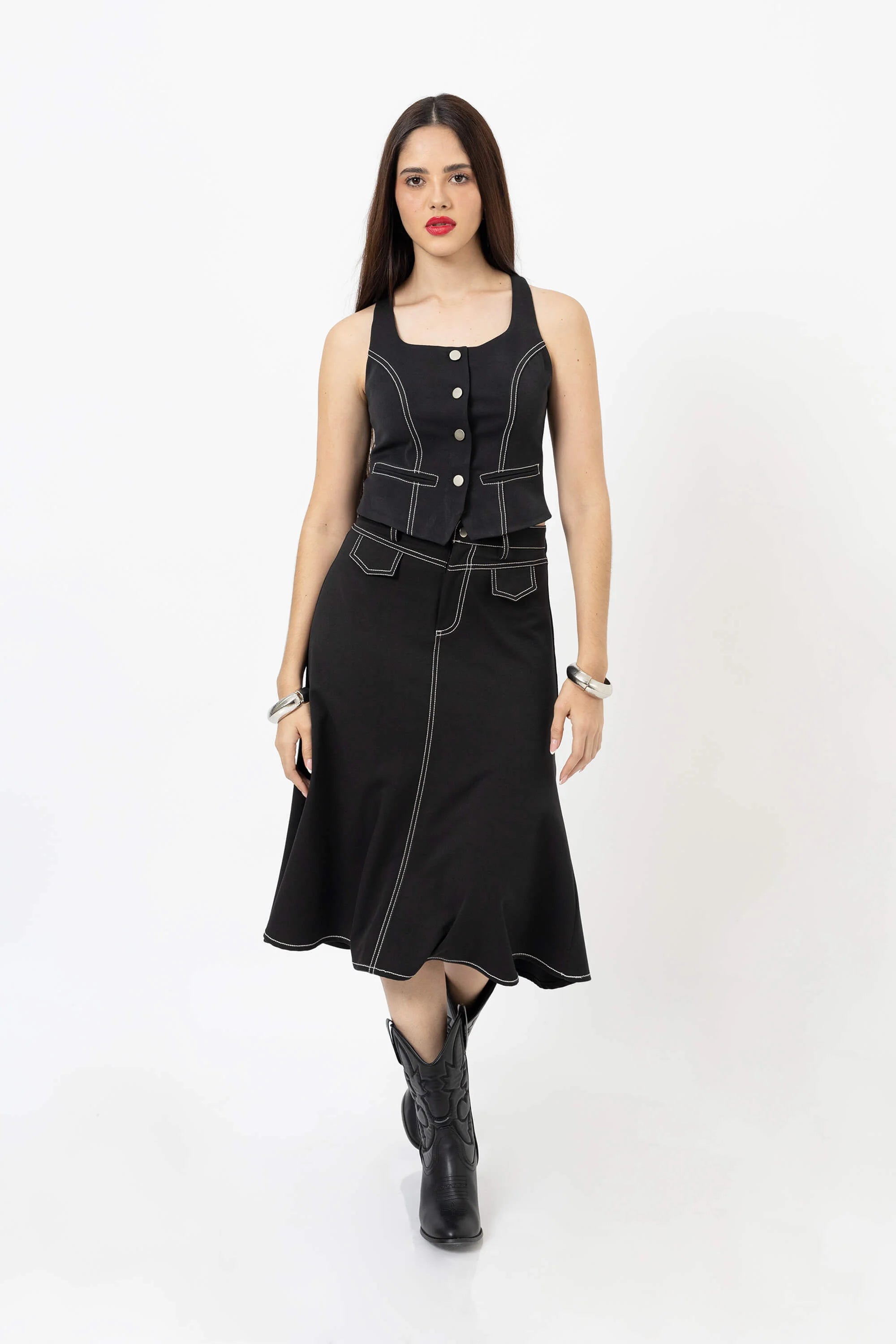 El top escote cuadrado con bies tipo chaleco es una prenda que reinventa la sastrería femenina con un aire moderno y versátil. Inspirado en la elegancia atemporal de los chalecos clásicos, este diseño destaca por su escote estructurado y líneas con bies contrastante, que estilizan la figura y le otorgan un carácter sofisticado.