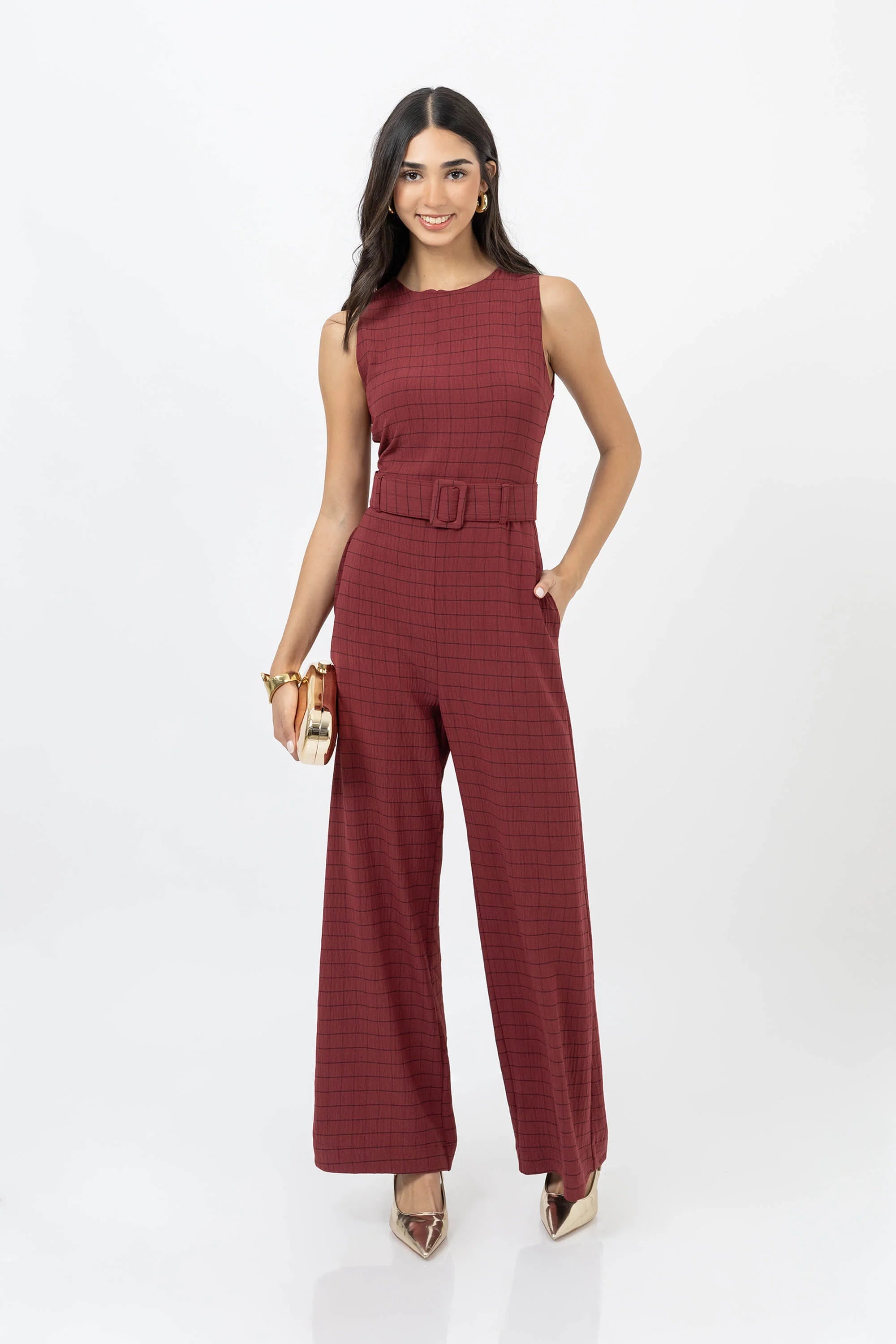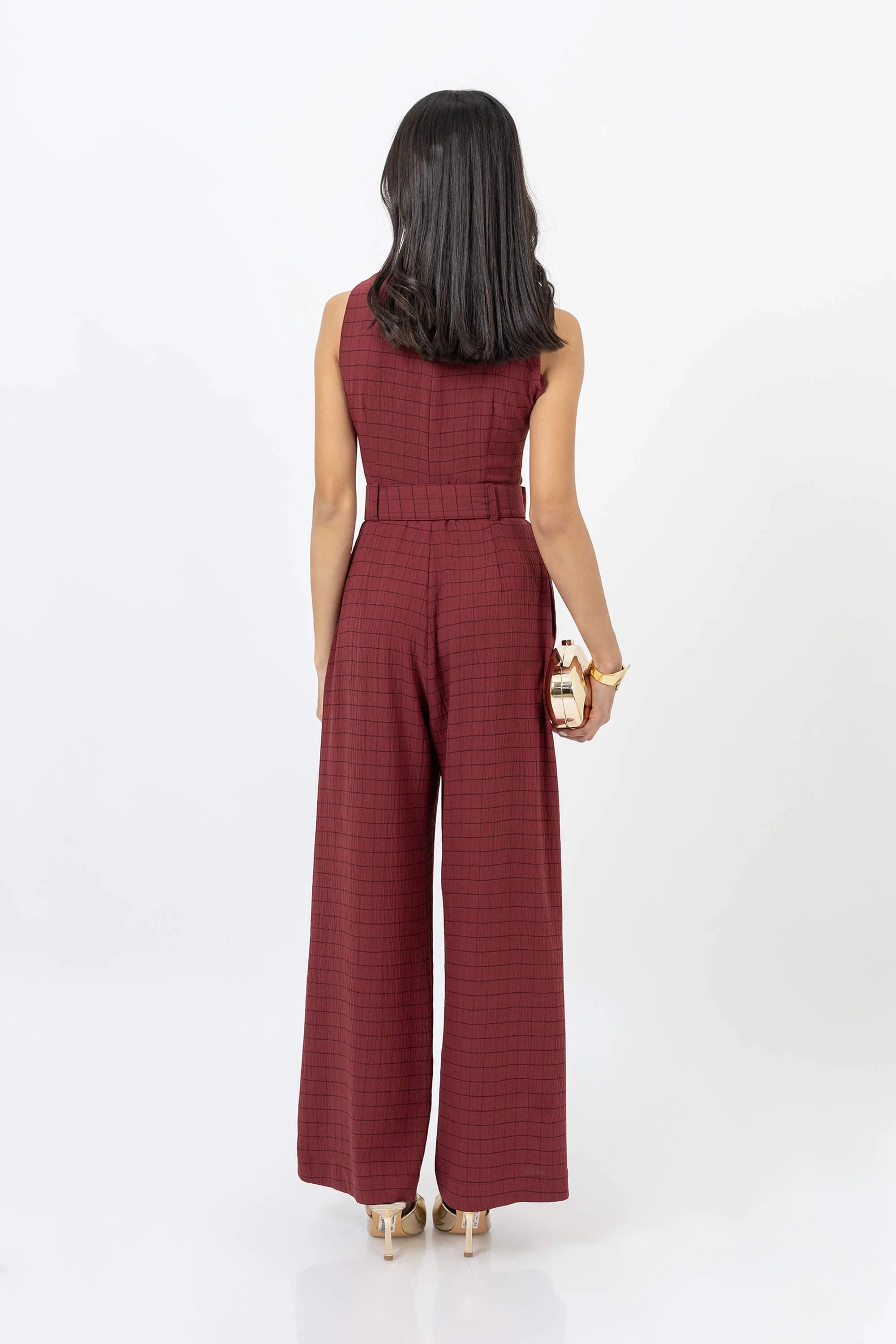El pantsuit wide leg sin manga con escote básico y cinto de Poet Couture combina minimalismo y sofisticación. Su silueta estructurada con corte amplio en pierna y cinturón a tono resalta la figura con equilibrio y elegancia, ideal para looks contemporáneos de día o noche.