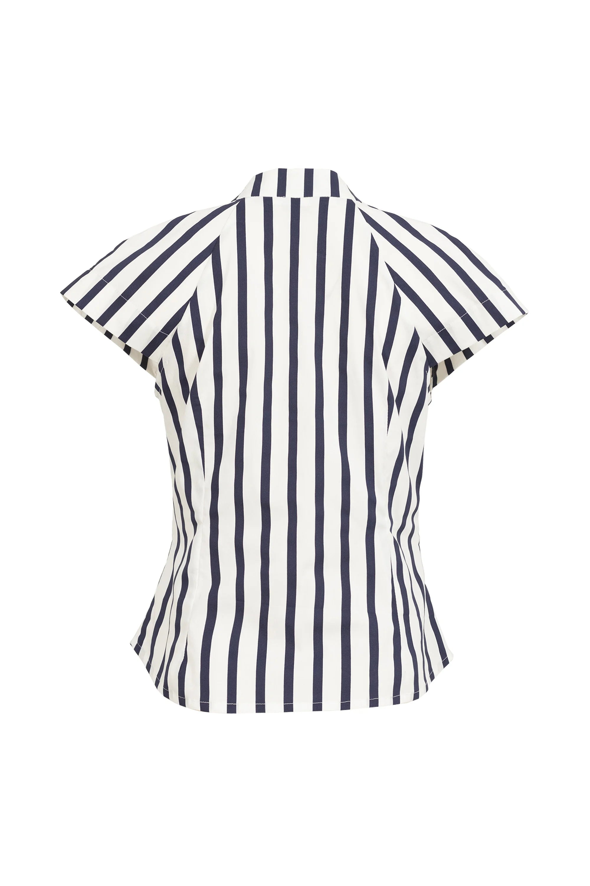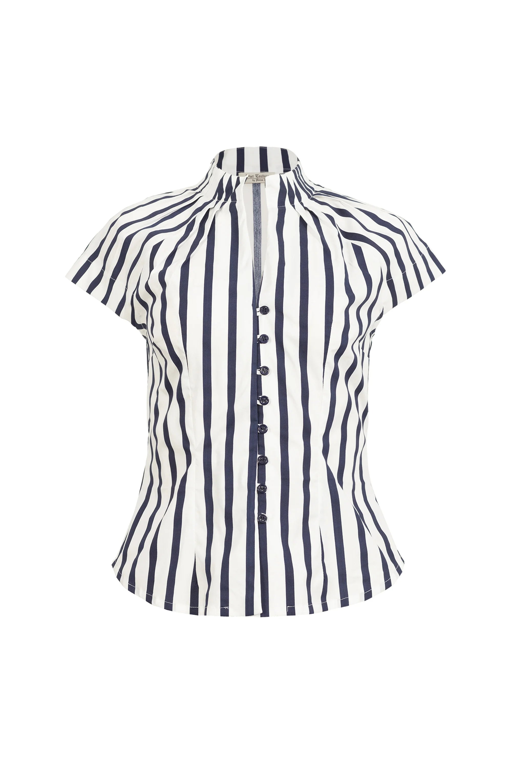 Blusa entallada con estampado rayado en azul y blanco, cuello cerrado y botones al frente.