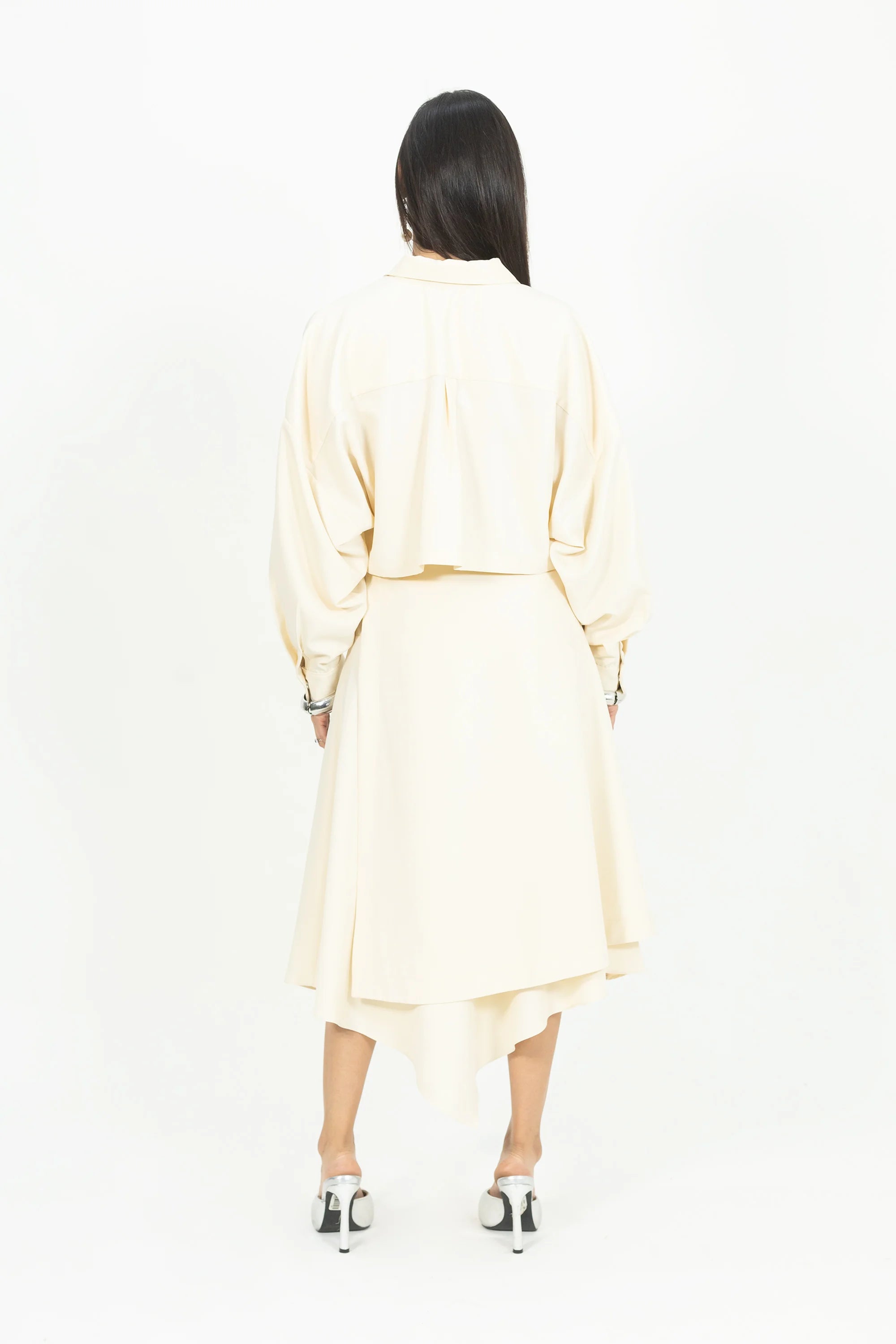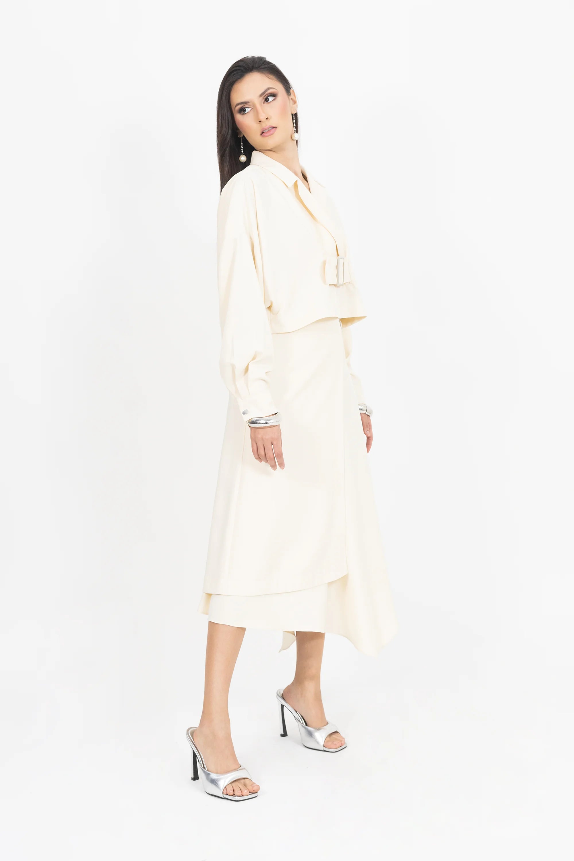 La elegancia cobra movimiento con esta falda midi asimétrica con sobrefalda, diseñada para mujeres que valoran los detalles de confección y las siluetas con carácter. Su corte irregular crea un juego visual dinámico y sofisticado, mientras que la sobrefalda envolvente aporta fluidez y volumen controlado.