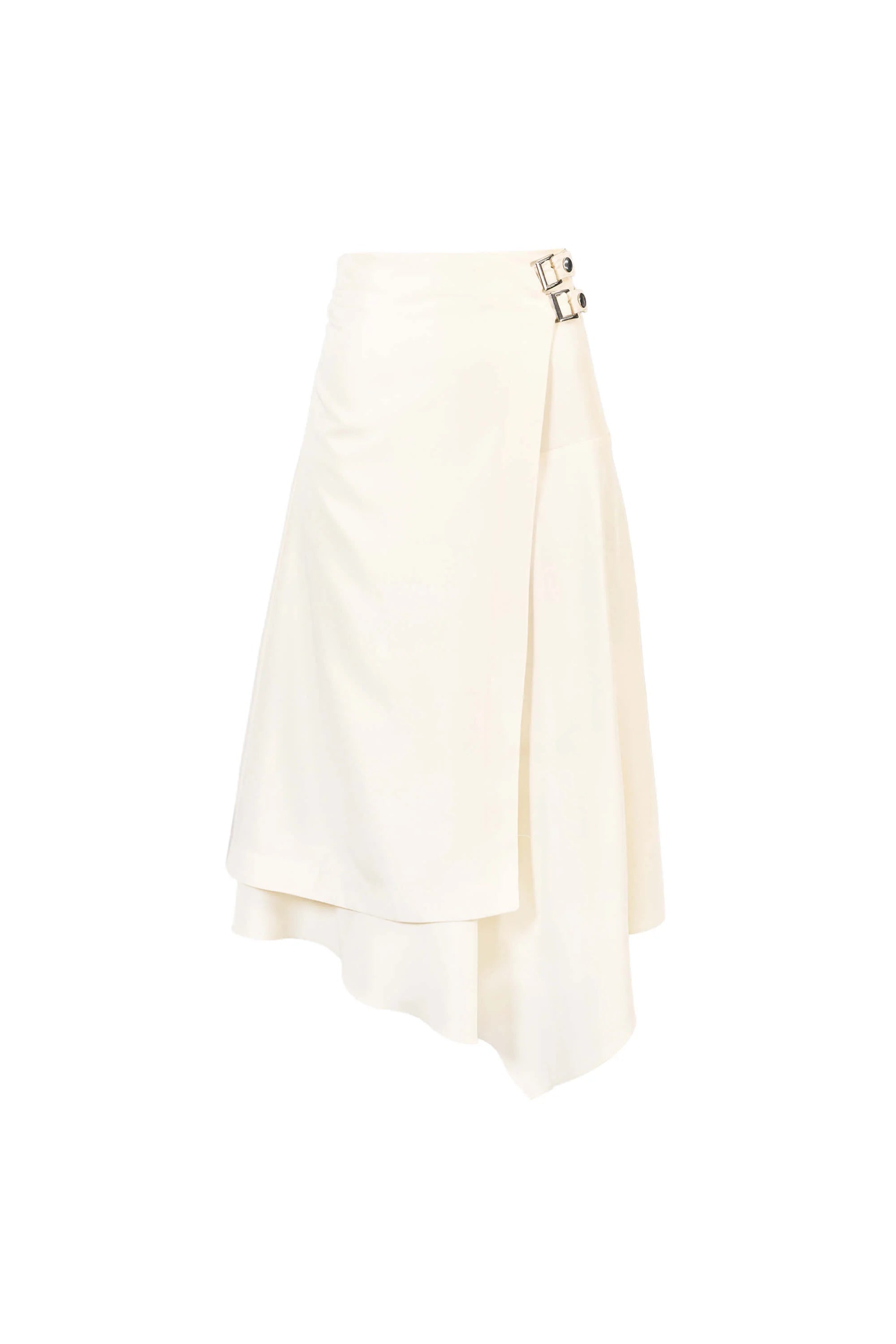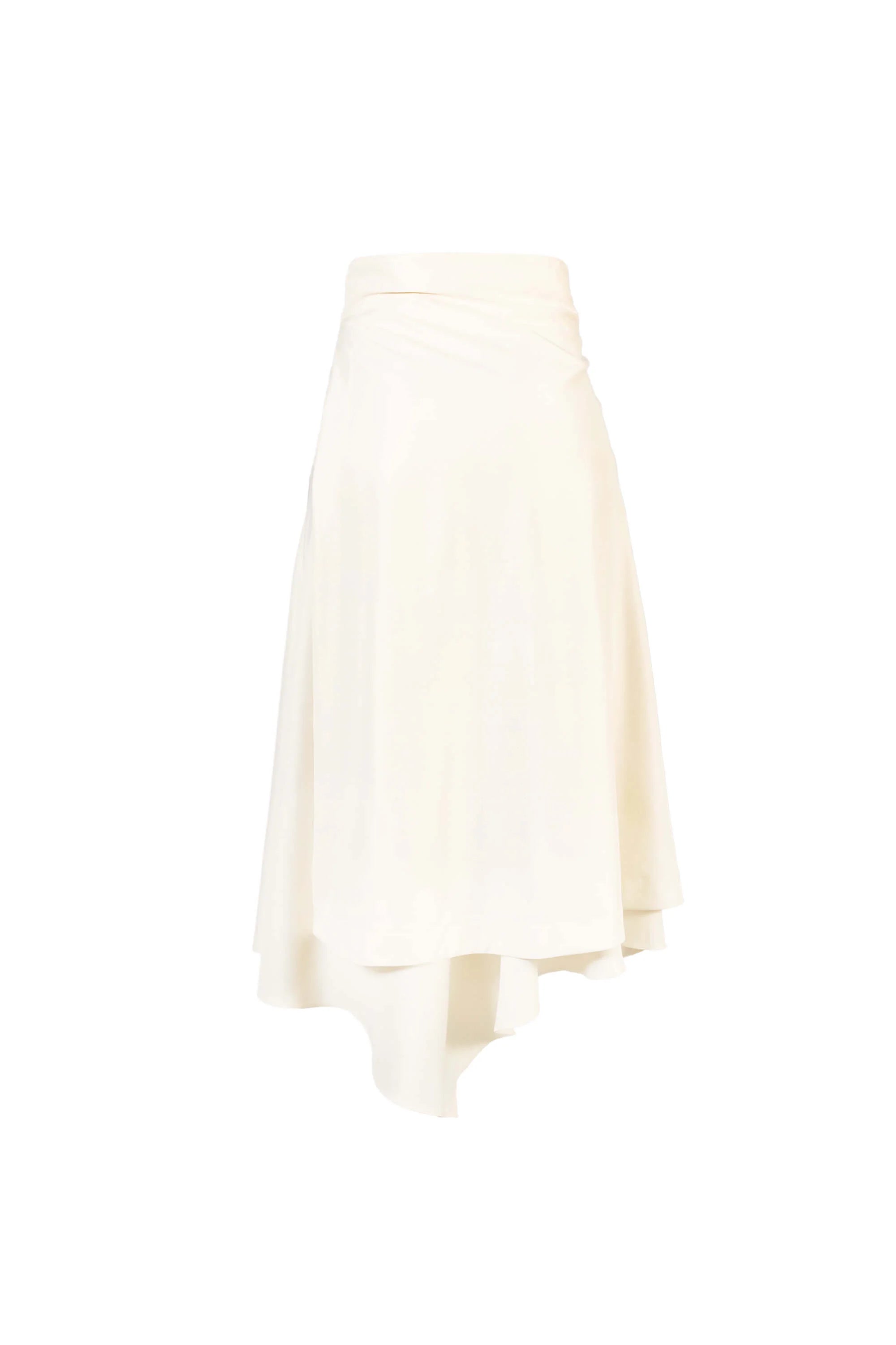 Falda midi asimétrica con sobrefalda y caída fluida.