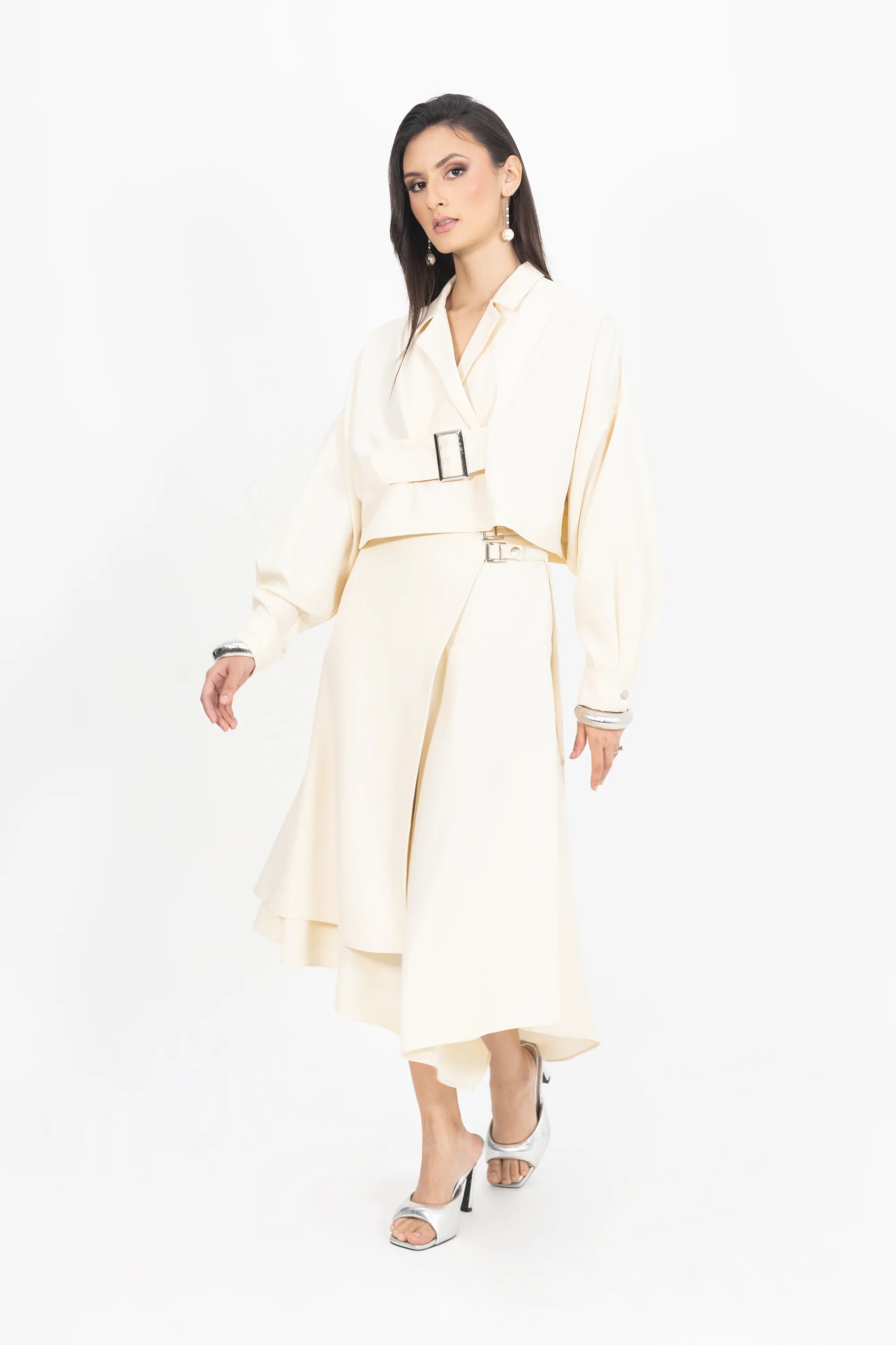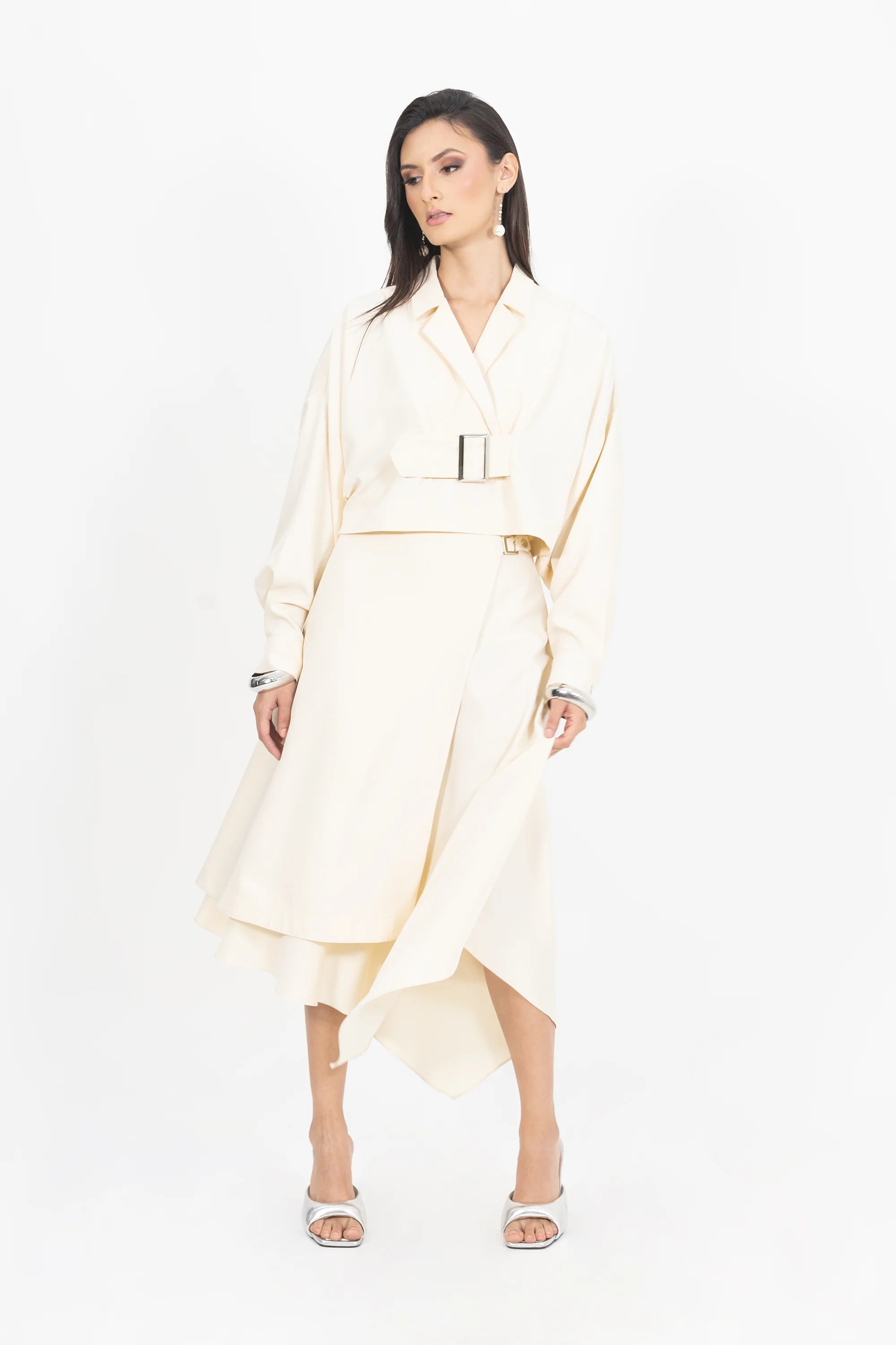 Confeccionada en un tono neutro versátil, esta prenda es una base perfecta para looks tanto formales como relajados. El diseño se ajusta con un discreto broche metálico en la cintura, acentuando la figura con naturalidad y aportando un detalle moderno y funcional.