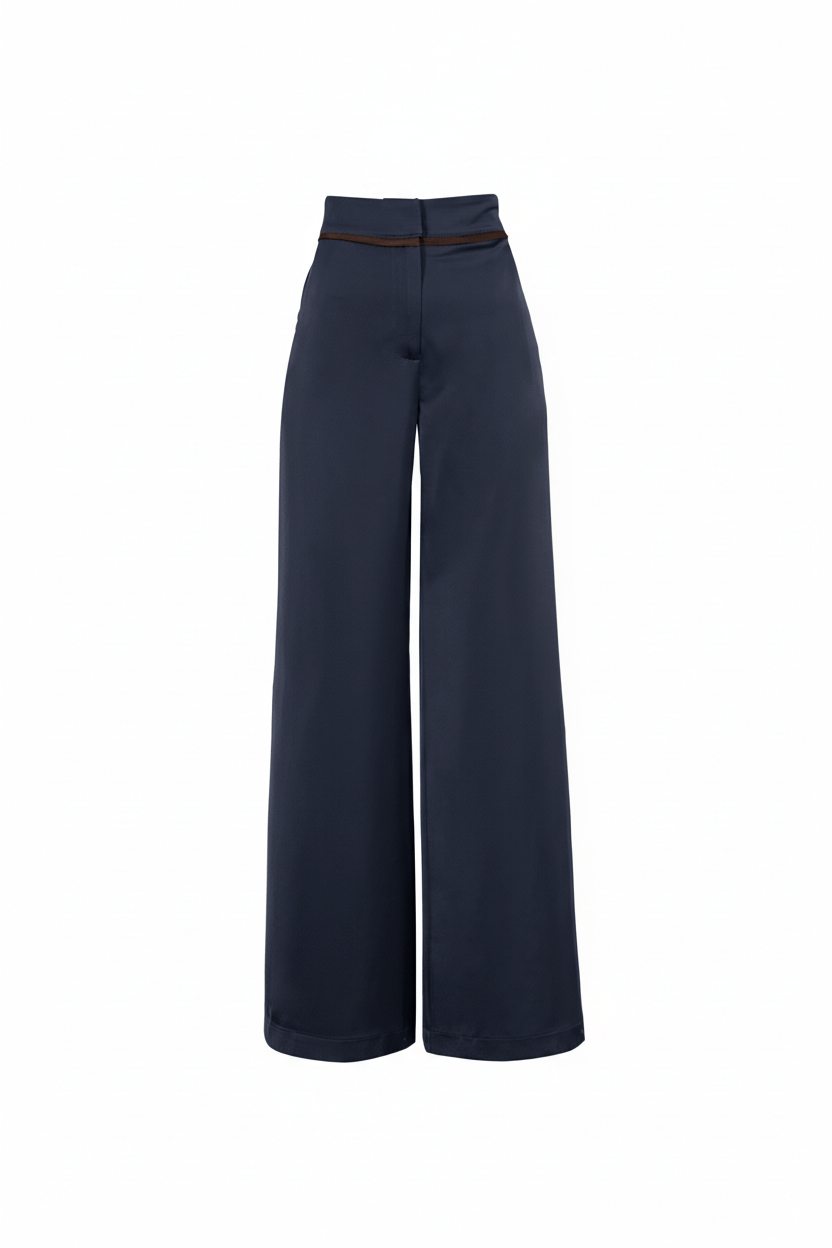 El pantalón largo wide leg duo color de Poet Couture combina elegancia y diseño contemporáneo. Con detalles de vivos contrastantes en la cintura y corte amplio, estiliza la silueta y ofrece un porte sofisticado. Ideal para looks formales o combinaciones modernas de día.