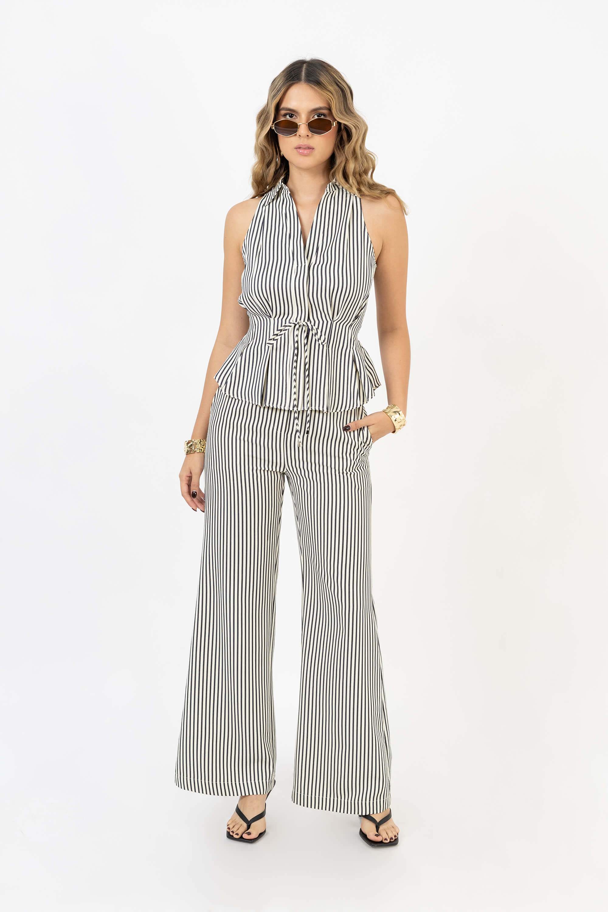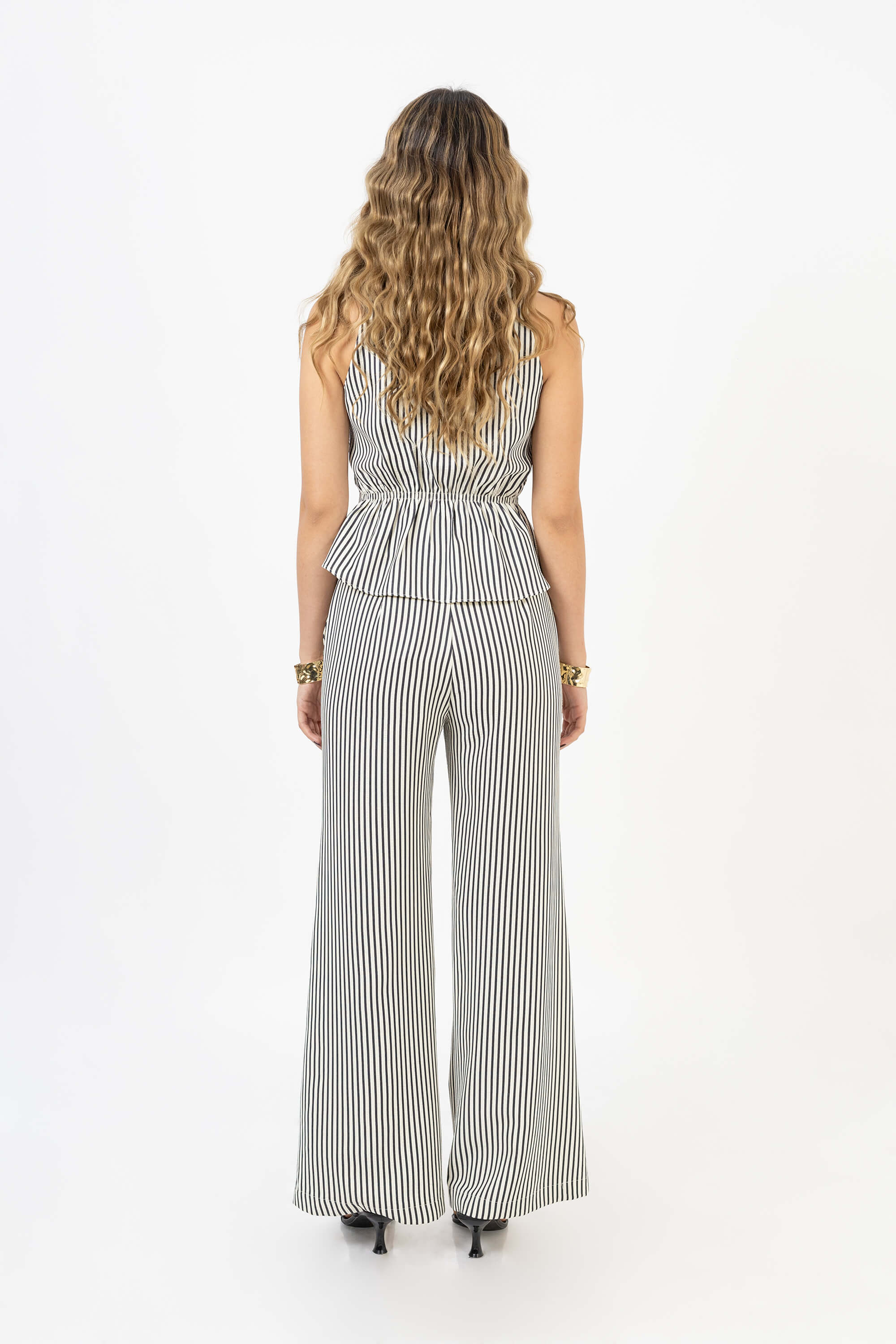 Pantalón bootcut wide con diseño a rayas y bolsas laterales. Confeccionado en tela ligera y elegante, ideal para un look contemporáneo con equilibrio entre comodidad y estilo. Las bolsas laterales añaden un toque práctico sin perder la estética refinada. Ideal para combinar con blusas estructuradas o tops ligeros.