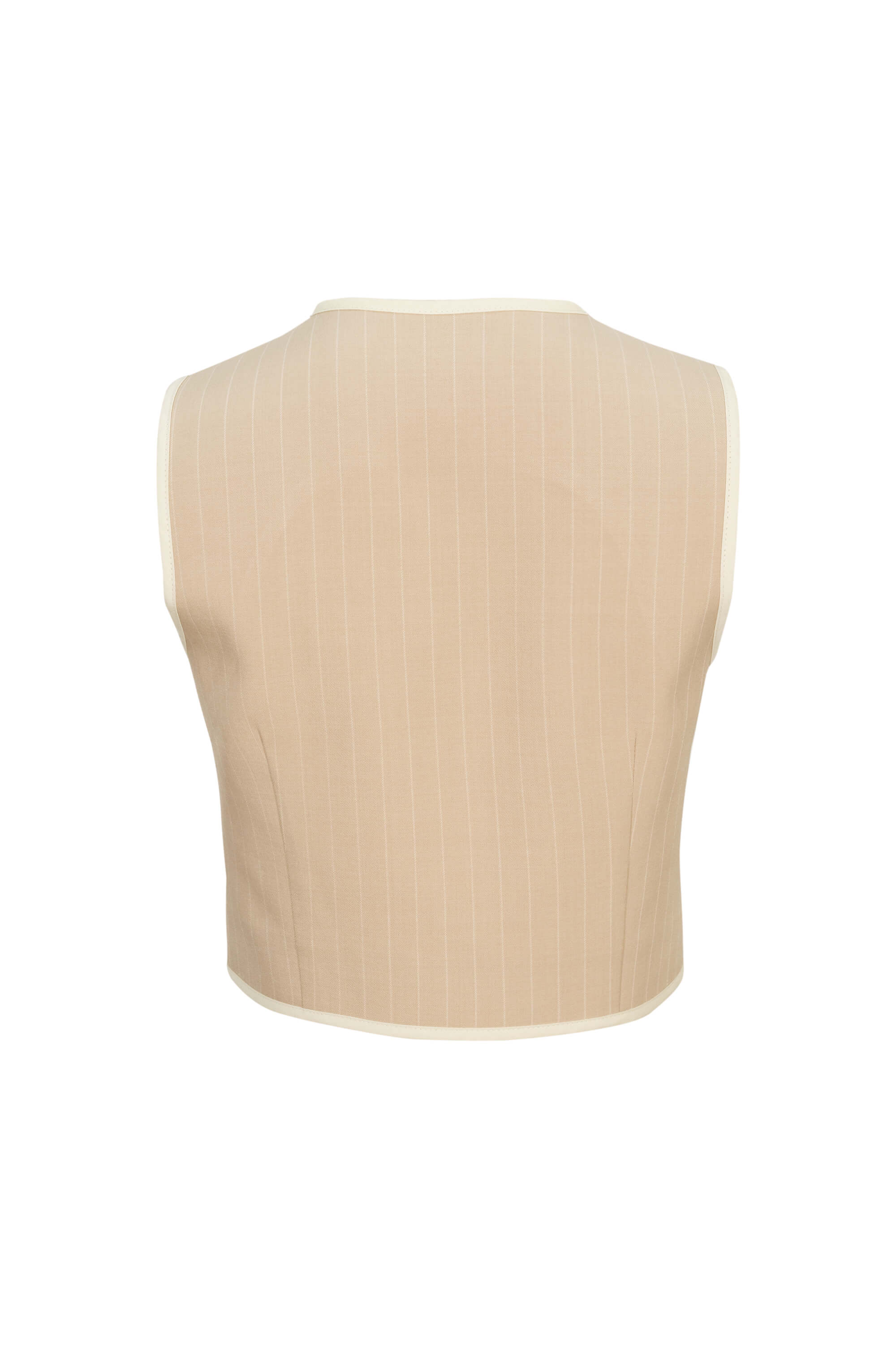 Este chaleco corto de rayas redefine la sastrería femenina con un diseño contemporáneo. Los vivos dobles en contraste en solapas y bolsillos aportan estructura visual y un toque distintivo.