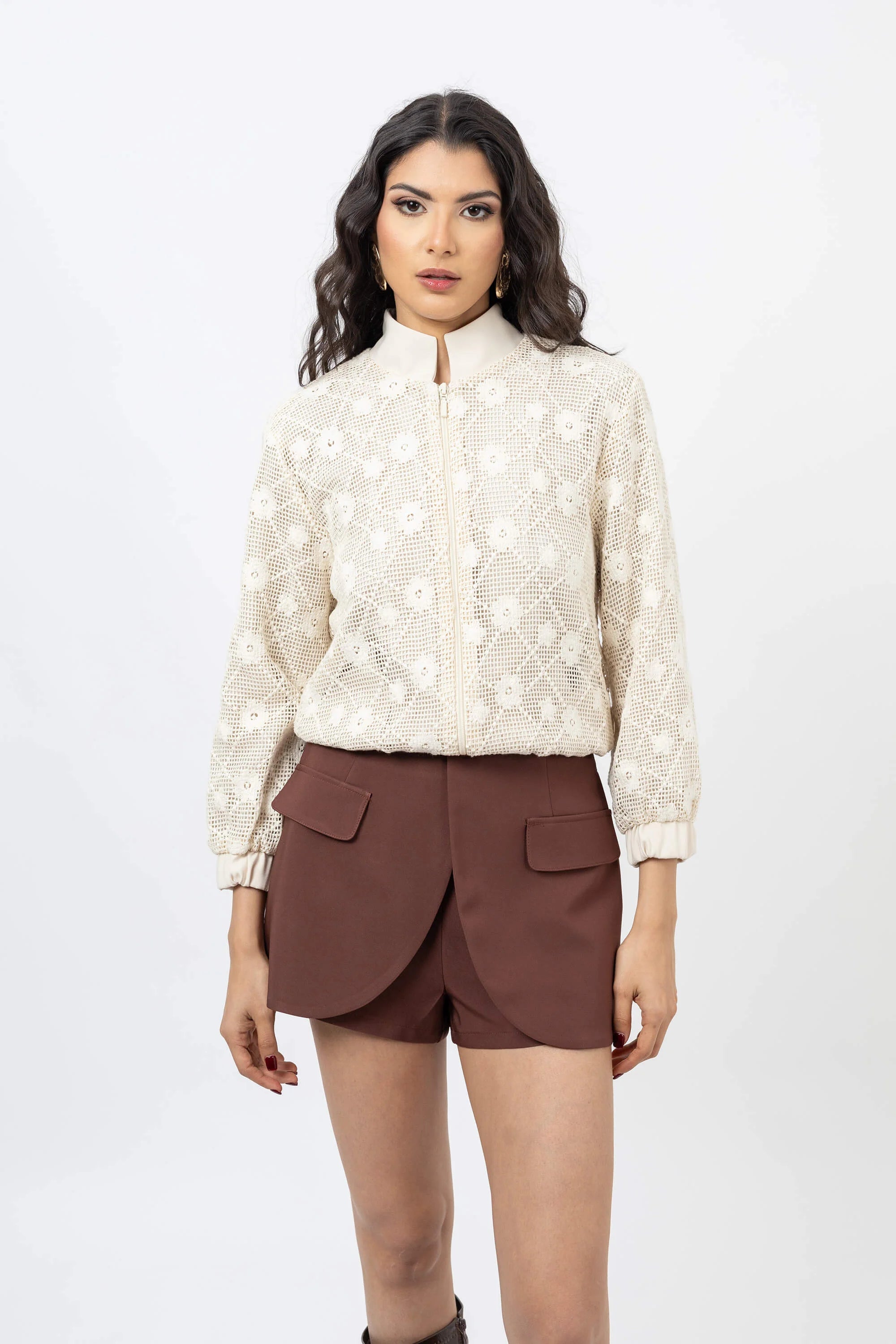La Chaqueta de algodón tejida con cuello alto de Poet Couture redefine la elegancia casual con un diseño que une confort y estilo artesanal. Confeccionada en tejido de algodón calado con delicados motivos florales, presenta un cuello alto estructurado y cierre frontal que aporta modernidad y funcionalidad. Ideal para looks de transición o para elevar conjuntos básicos con un toque sutil y sofisticado.