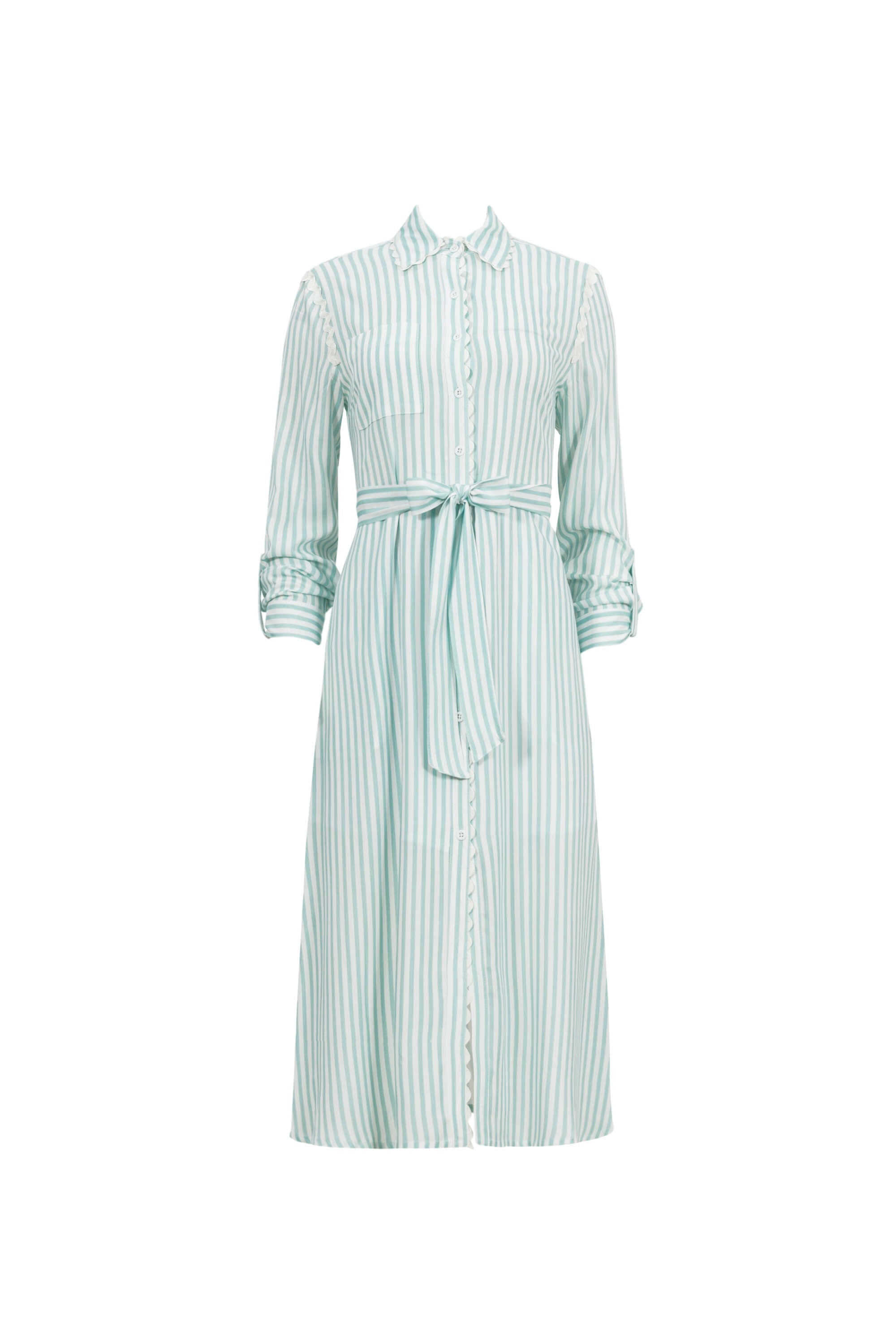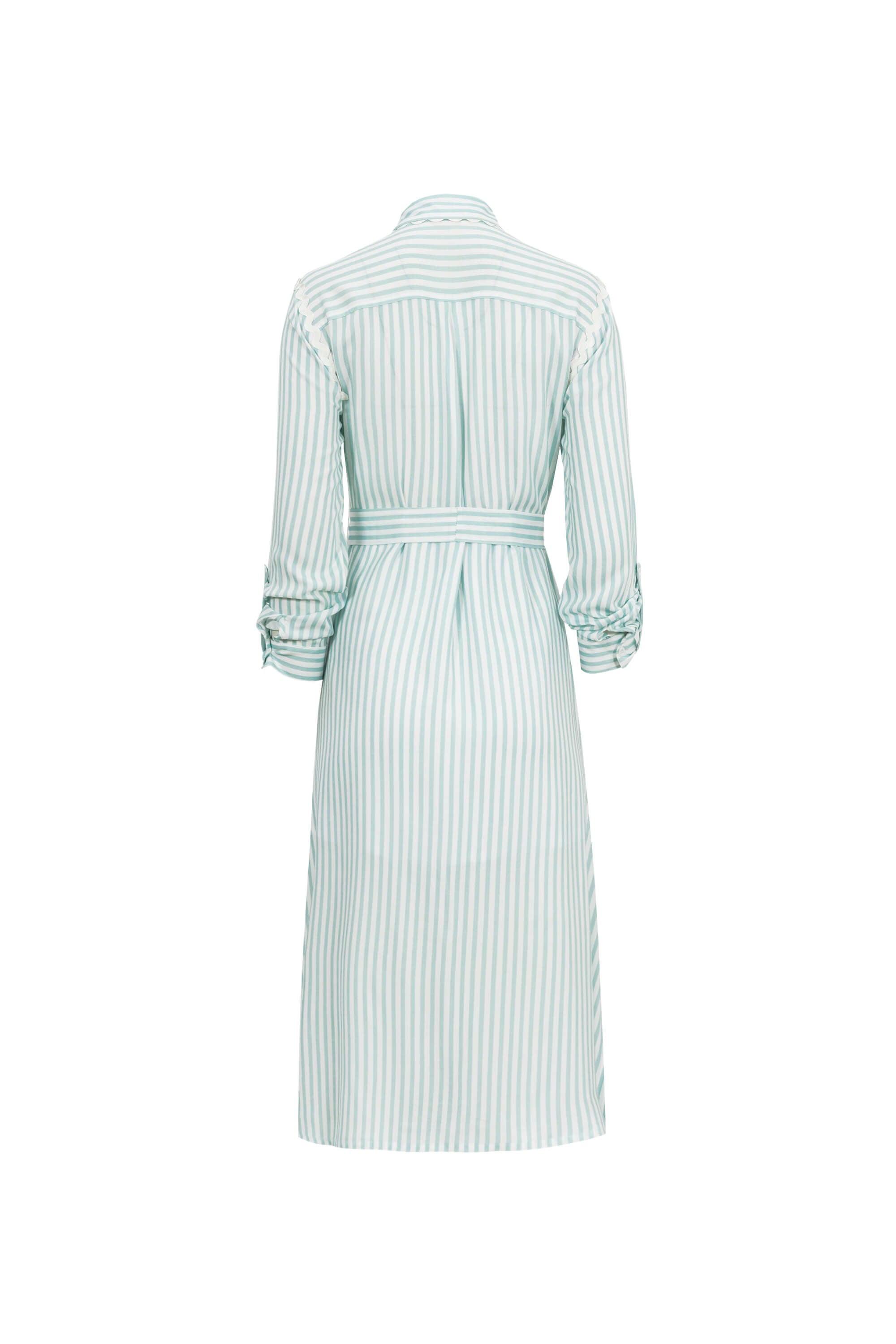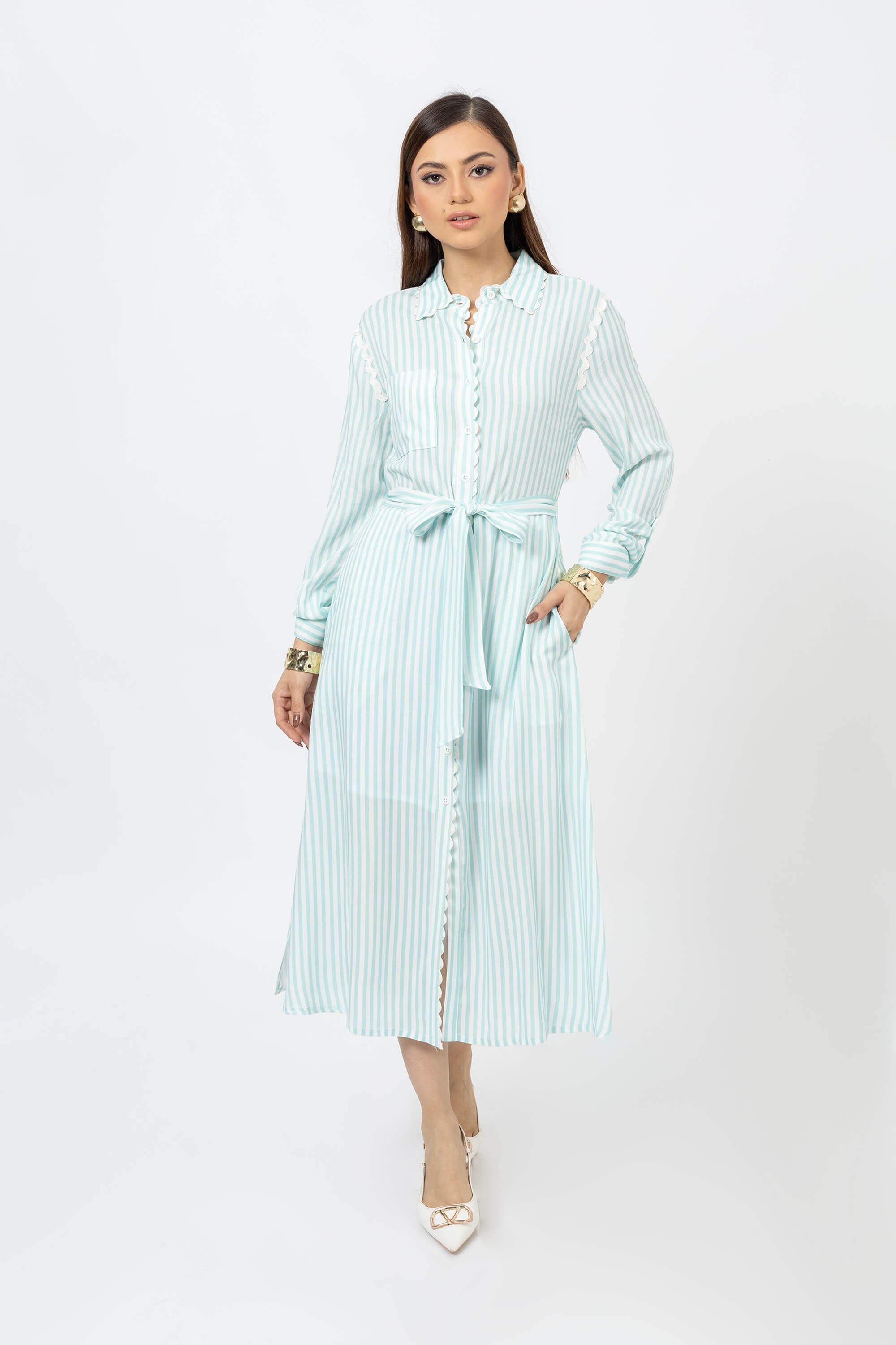 Refrescante y femenino, este vestido midi camisero transmite naturalidad y equilibrio. Ideal para un día casual o una cita al aire libre, su tejido ligero y cinturón destacan la figura con elegancia relajada.