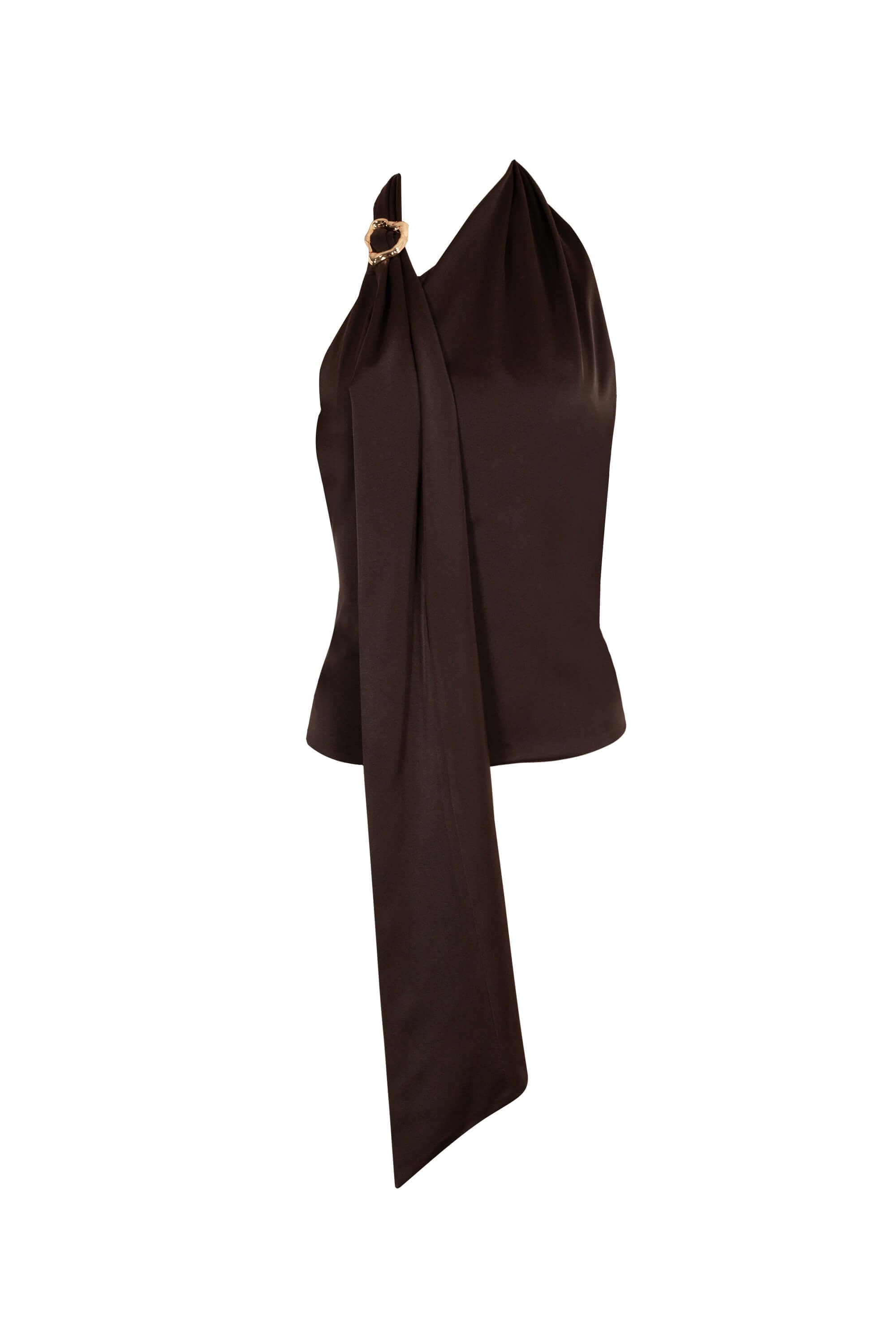 La blusa asimétrica de un hombro con tira para cuello de Poet Couture combina elegancia y modernidad. Su diseño fluido con detalle metálico en el cuello crea una silueta sofisticada, ideal para eventos formales o looks de noche con un toque refinado.