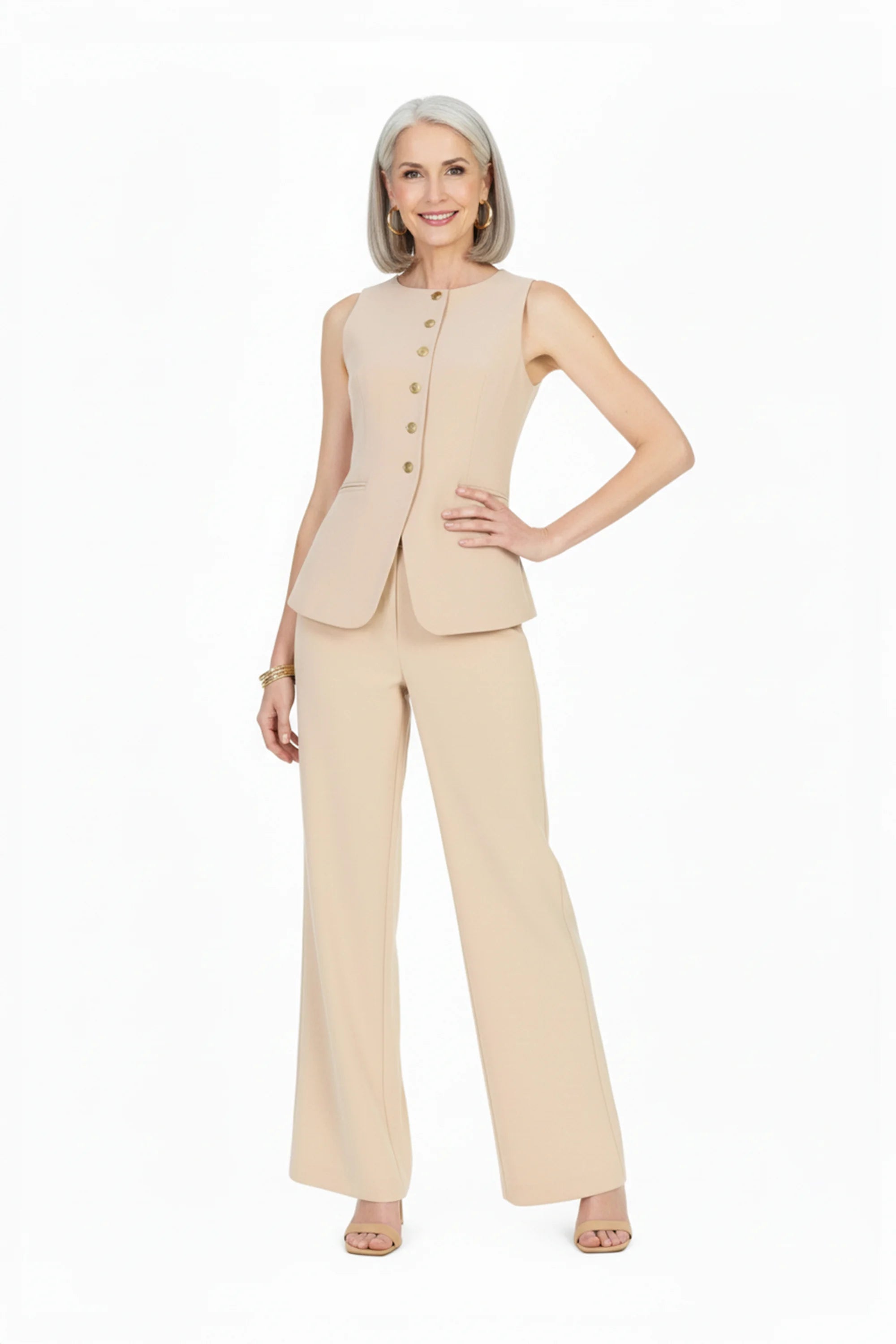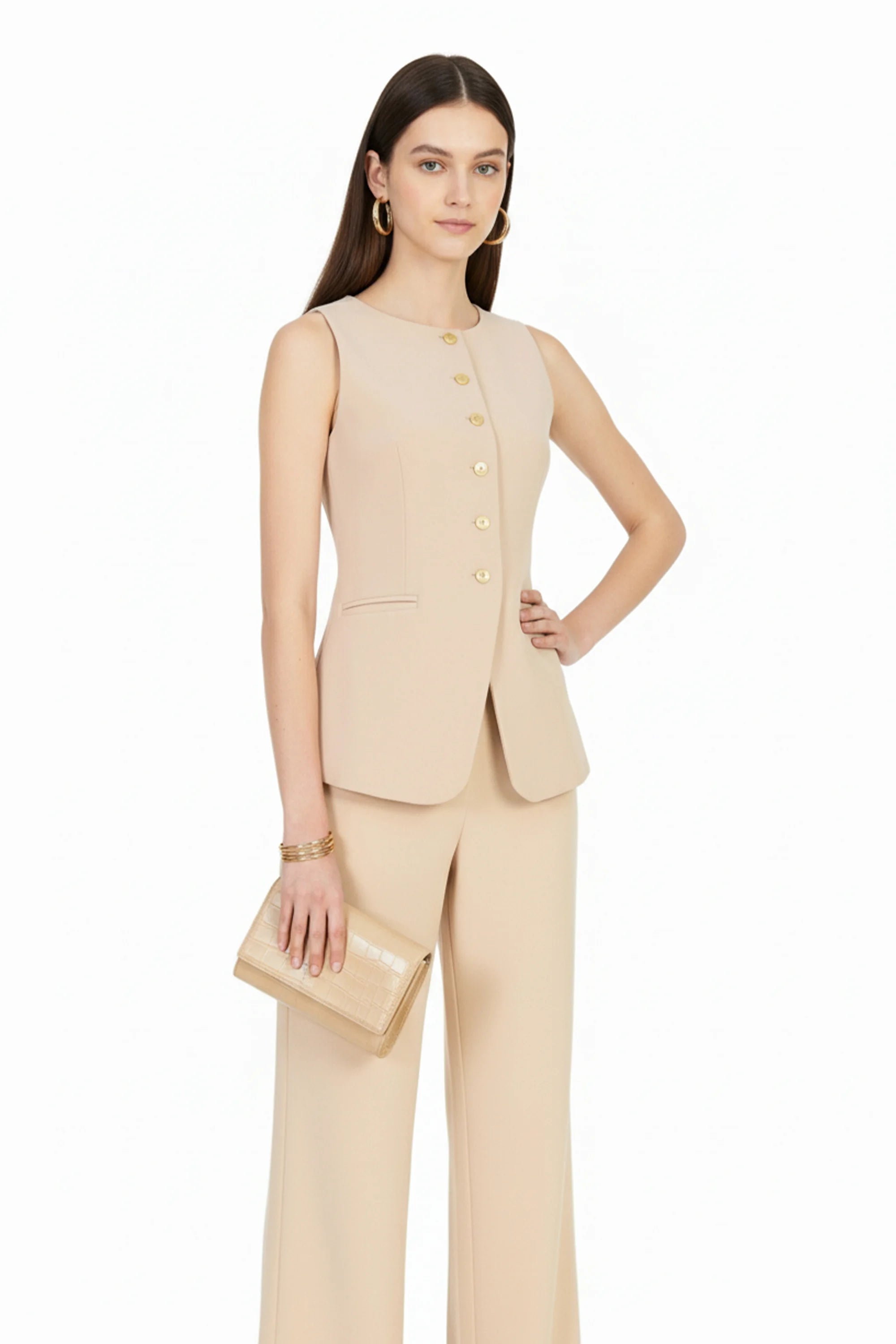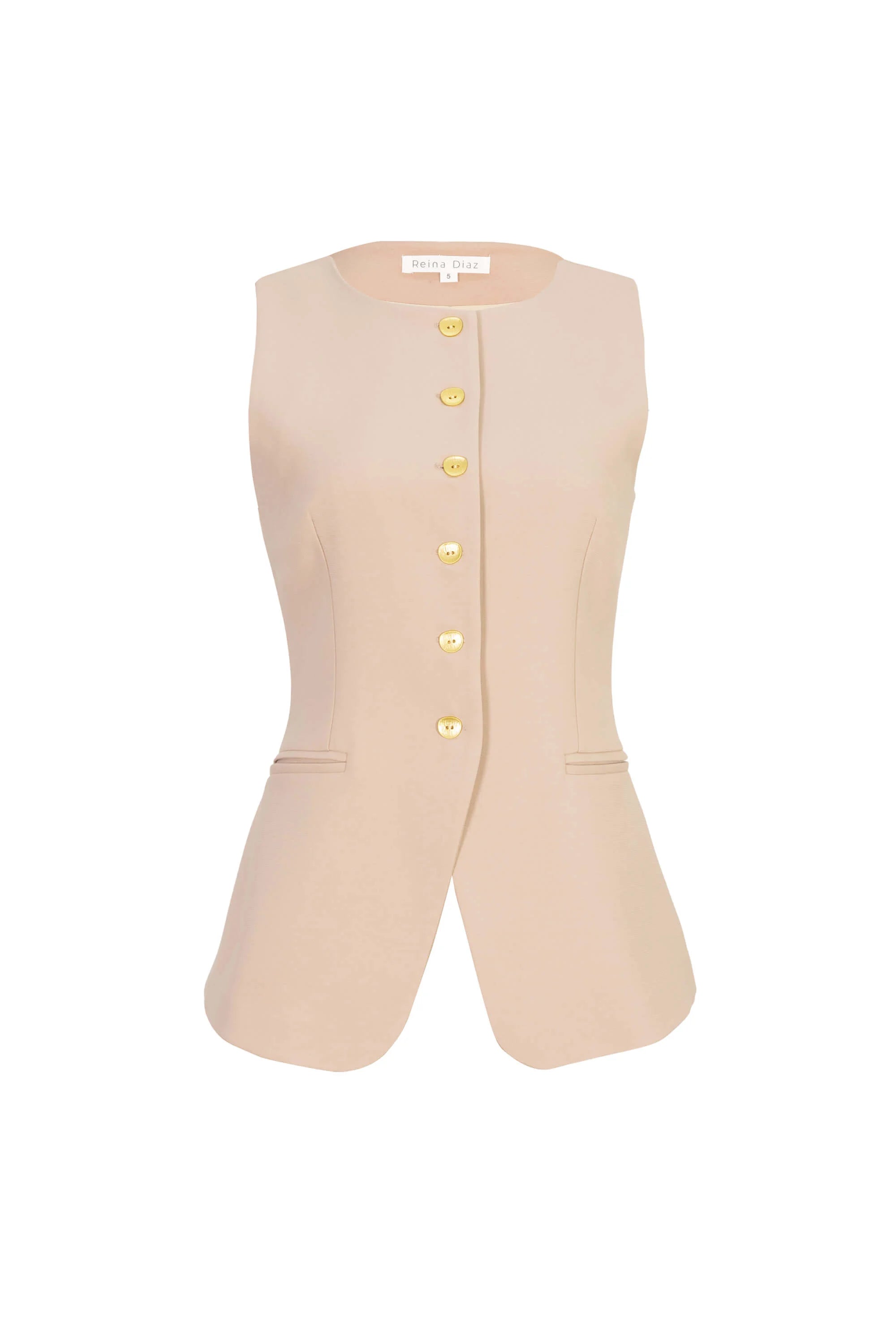 Chaleco sin mangas con corte alargado y botones dorados.