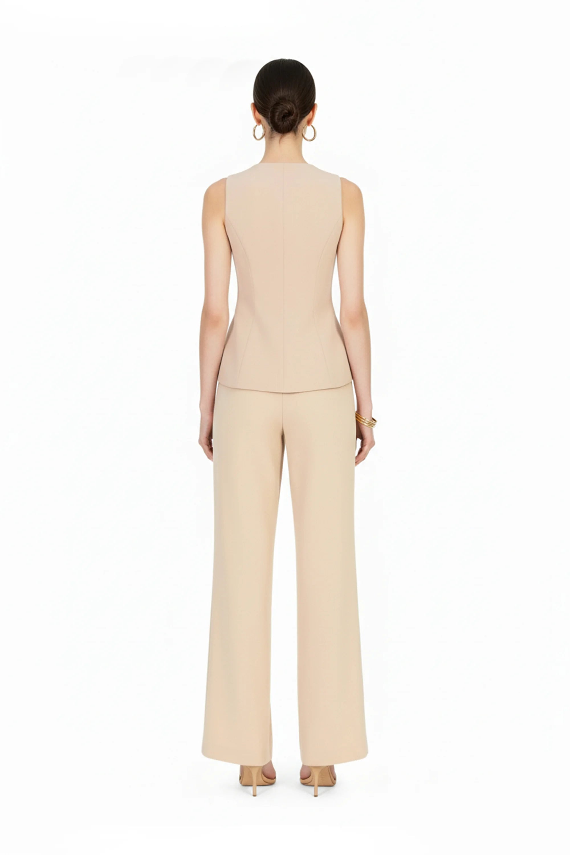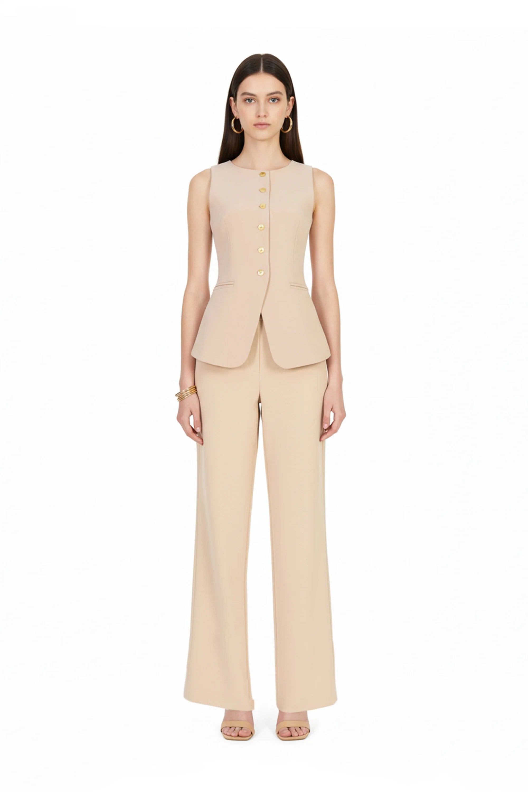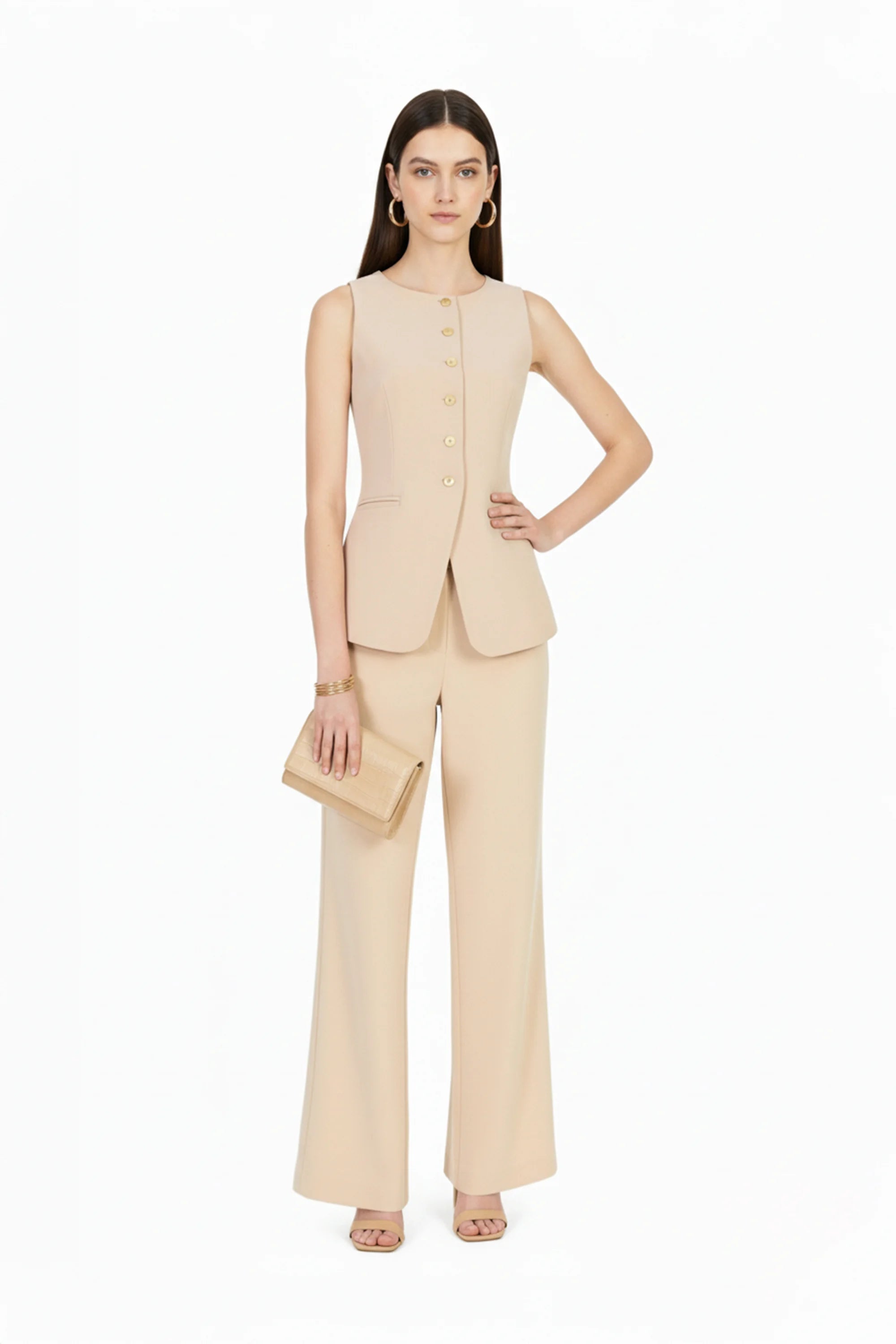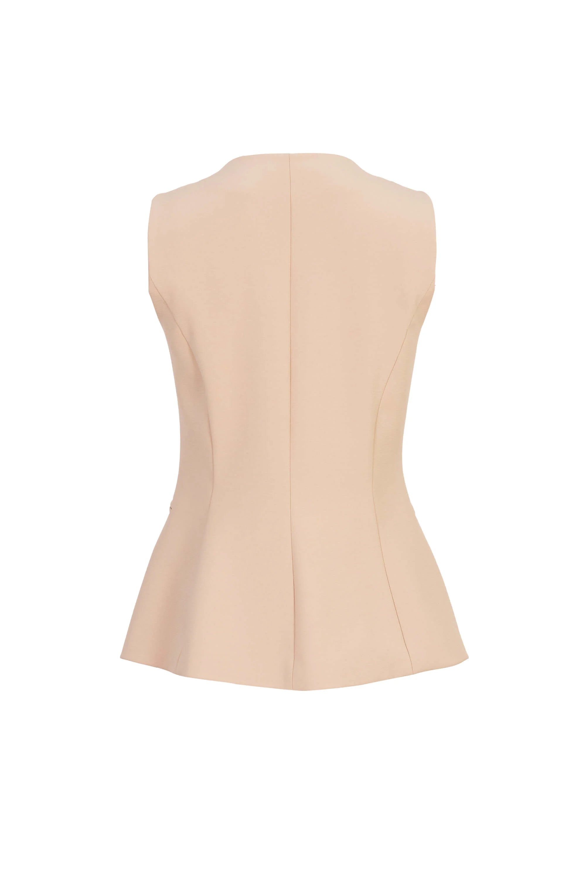 Este chaleco sin mangas de Reina Díaz es una declaración de estilo sobrio y refinado. Su corte alargado y entallado en la cintura realza la figura con sutileza, mientras que el escote redondo y la abertura inferior brindan un equilibrio perfecto entre estructura y ligereza.