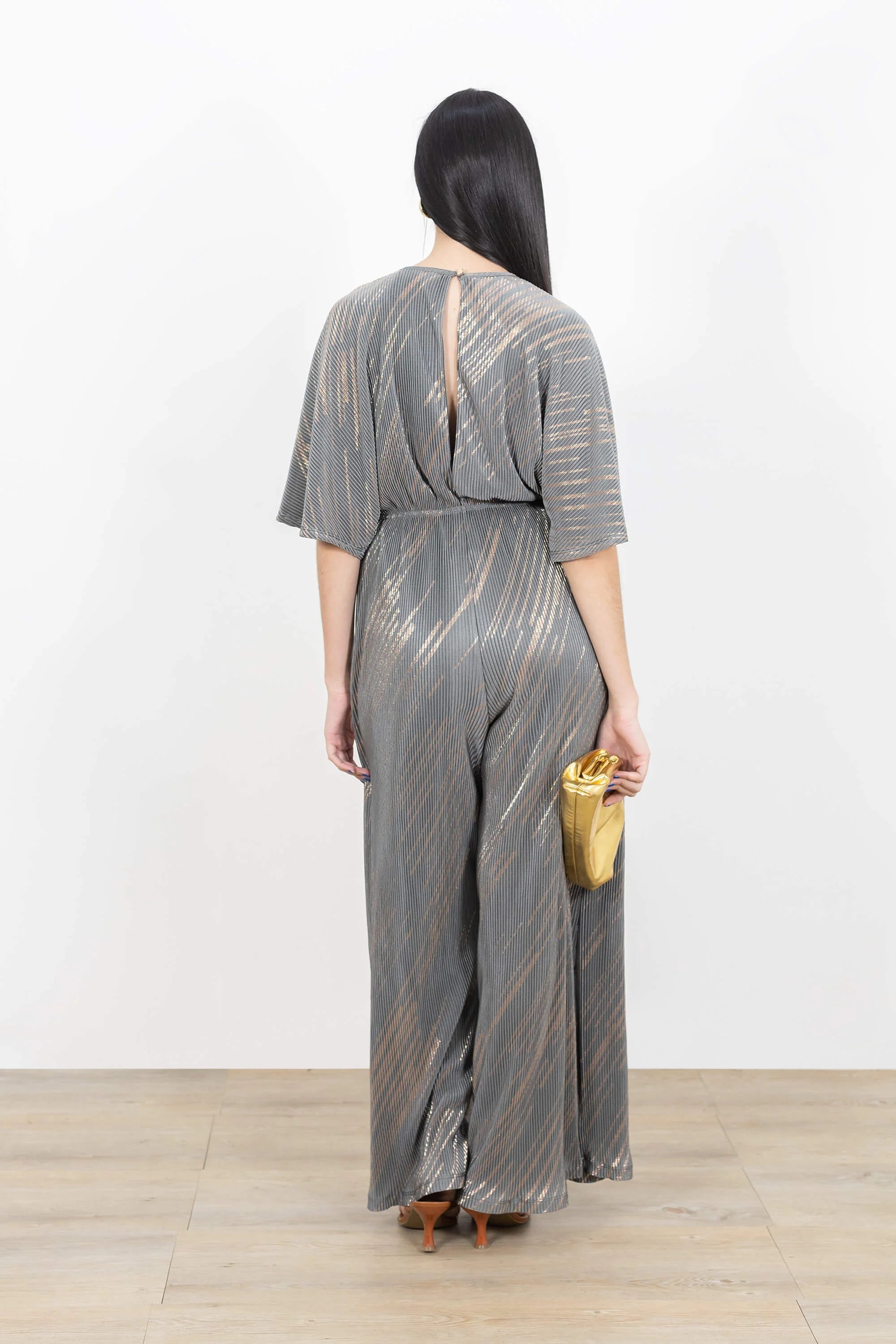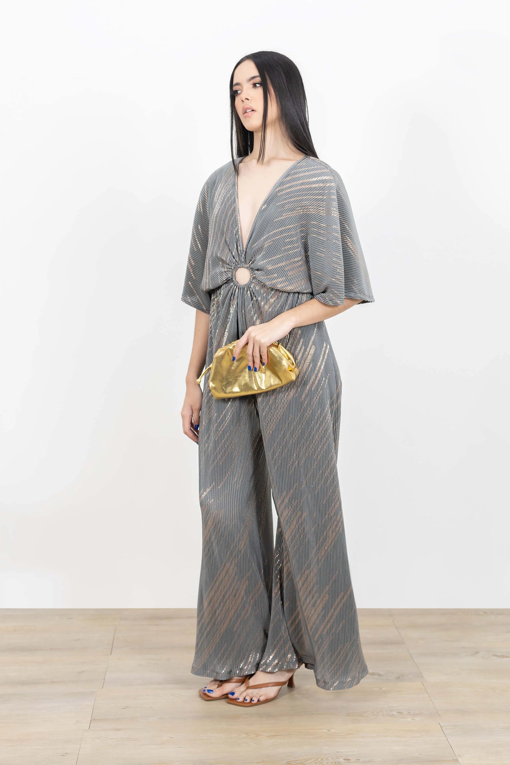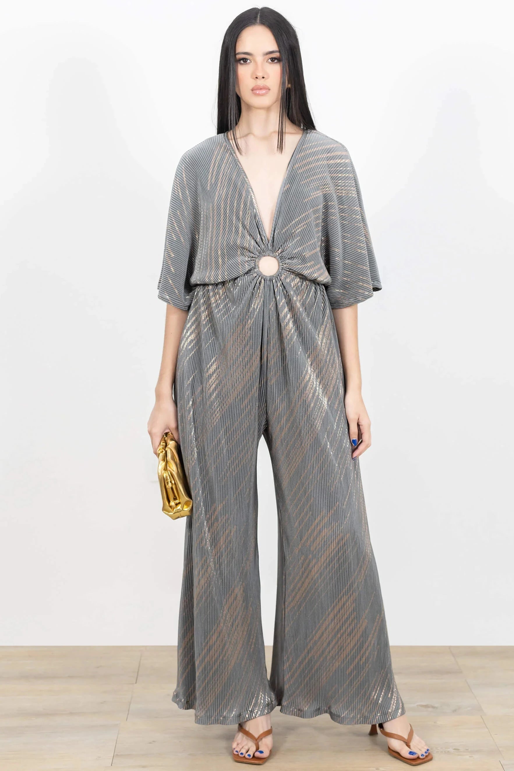 Jumpsuit de jersey pleat, escote en "V", argolla en cintura, manga murcielago
