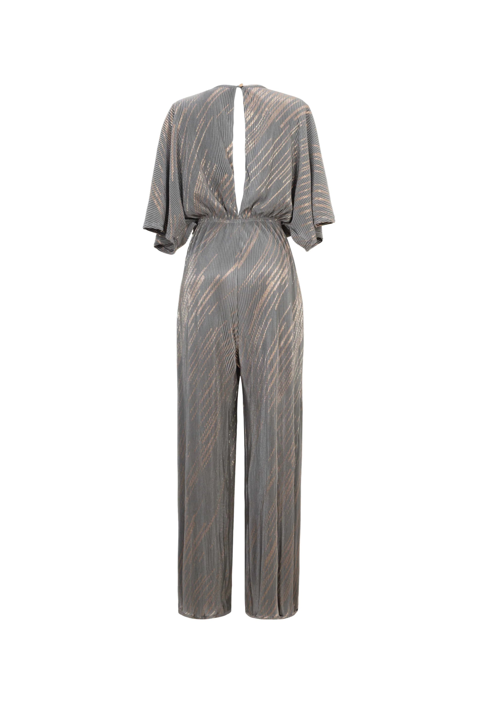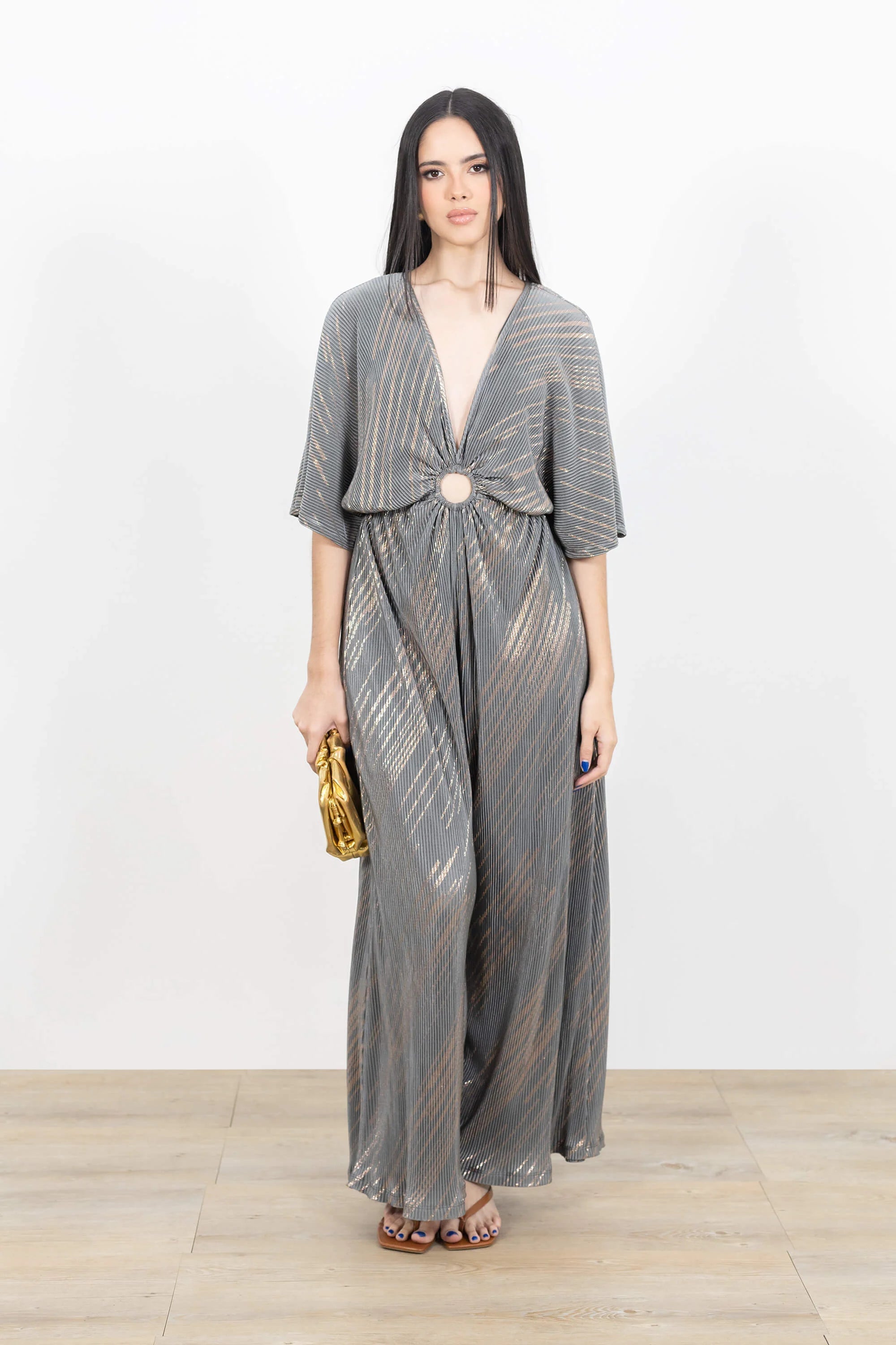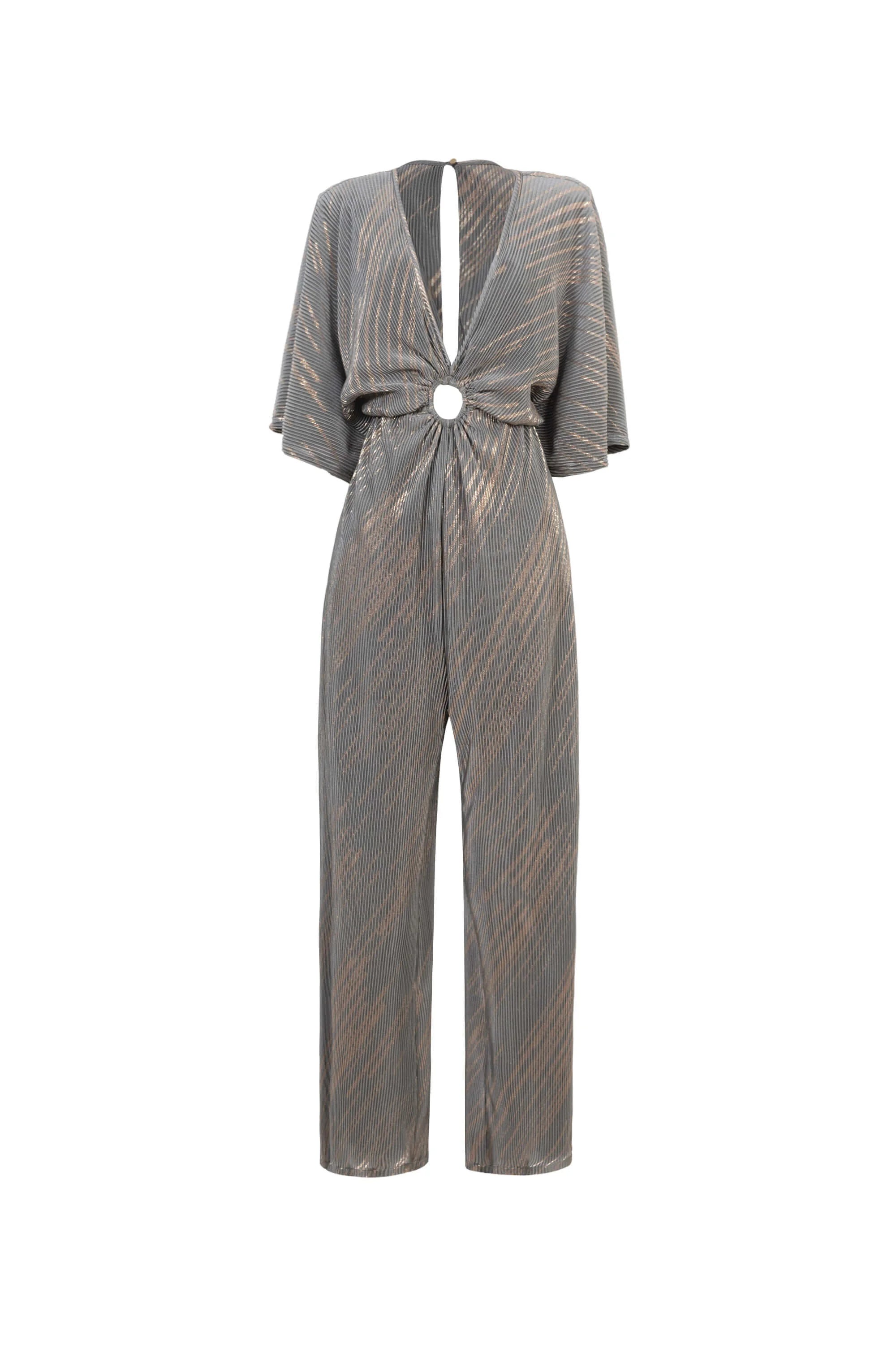 Jumpsuit de jersey pleat, escote en "V", argolla en cintura, manga murcielago