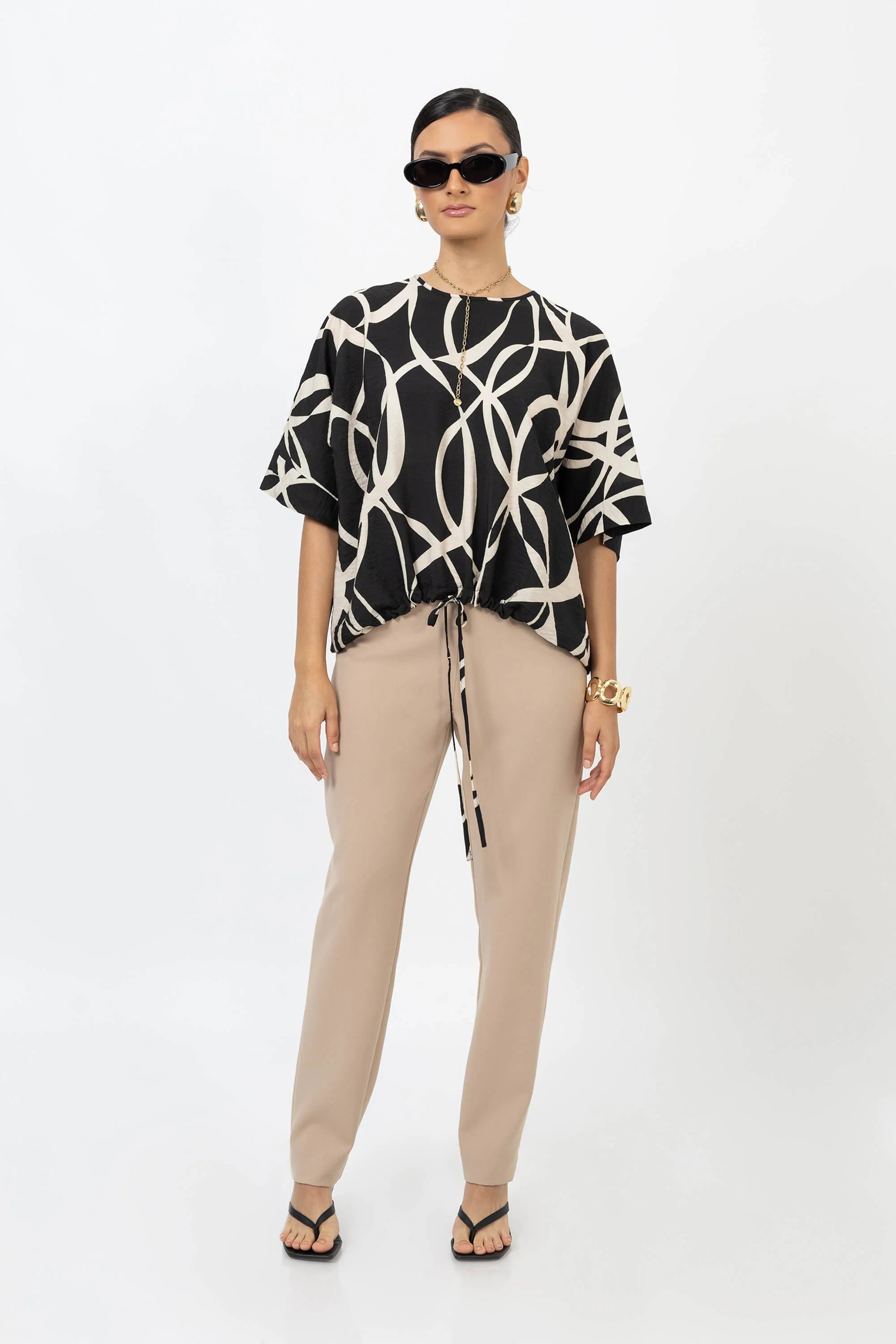 Moderna y versátil, esta blusa de manga pasada con jareta en la espalda es una pieza que combina diseño gráfico con comodidad estructurada. Su estampado abstracto en blanco y negro, de líneas entrelazadas, le confiere un carácter artístico que eleva cualquier look con solo un gesto.
