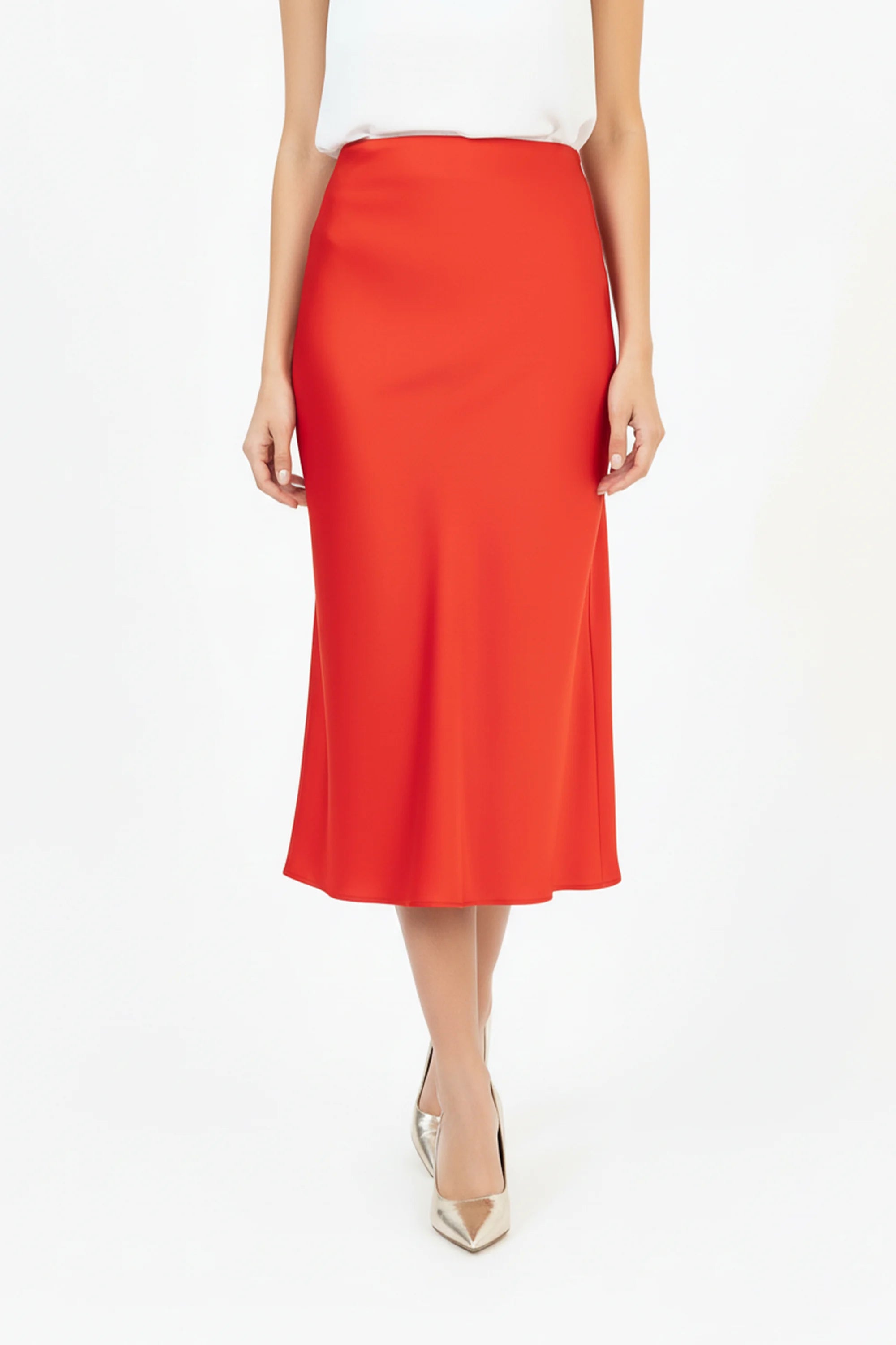 Esta falda en línea A de satín  Su silueta estructurada al cuerpo y sutilmente amplia hacia el ruedo estiliza la figura con naturalidad y libertad de movimiento.