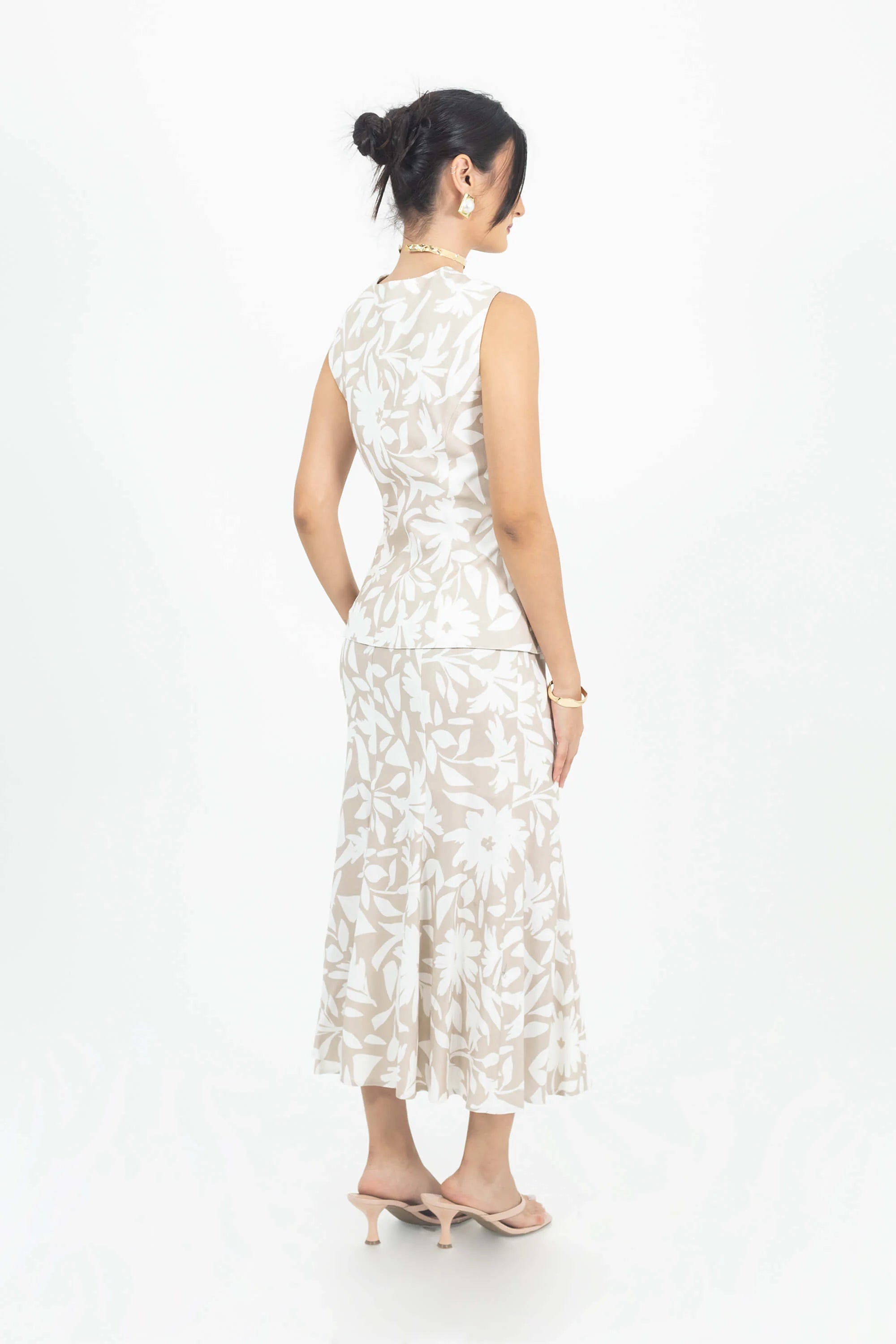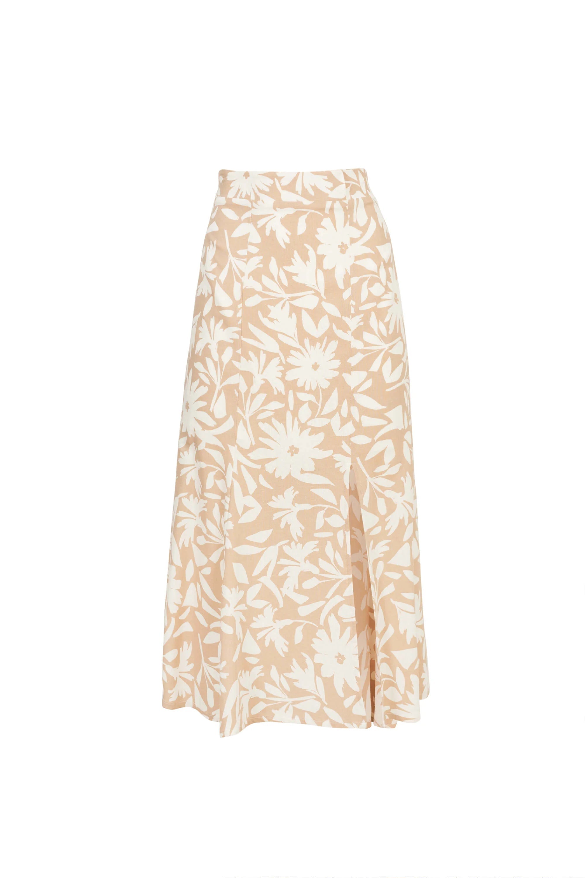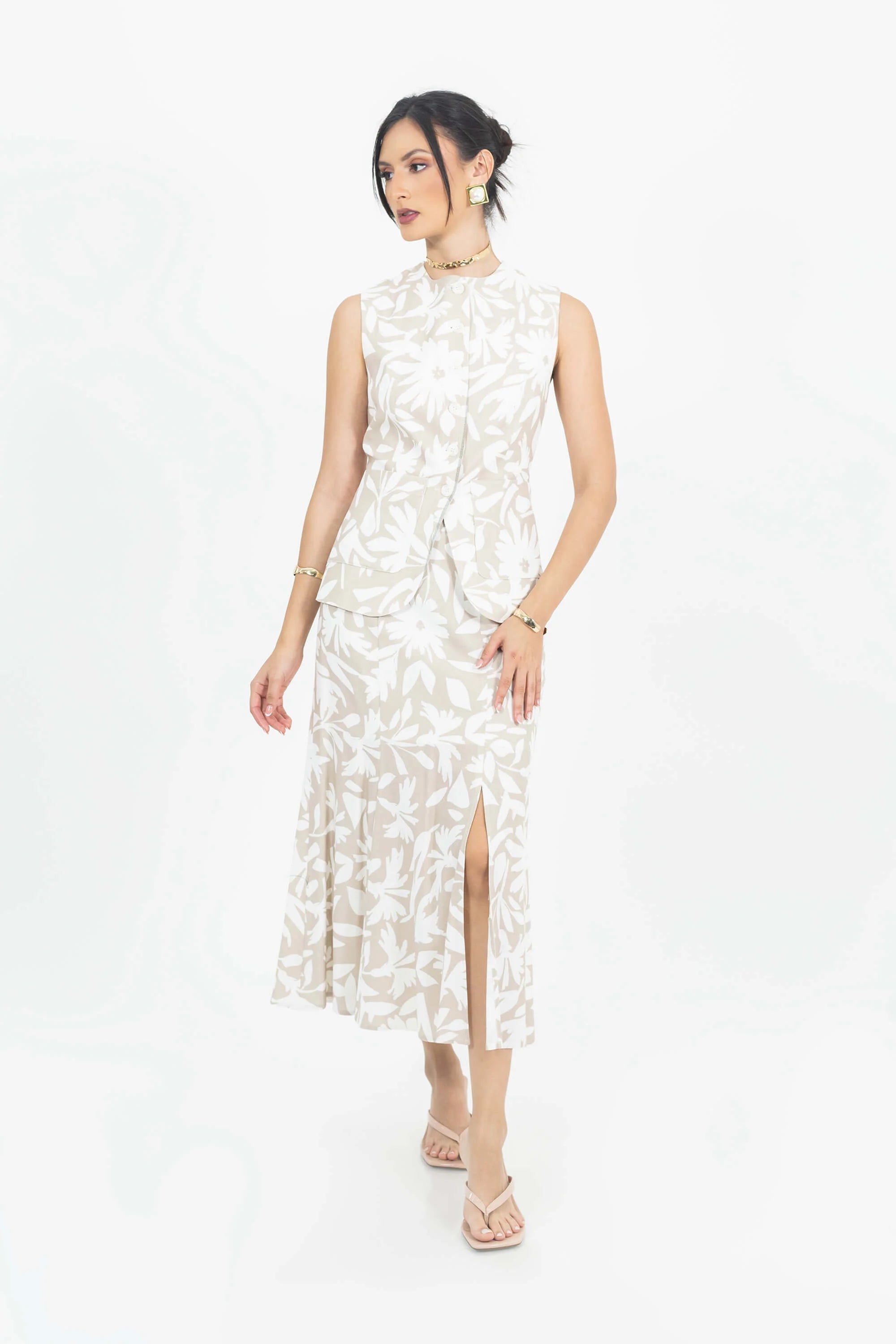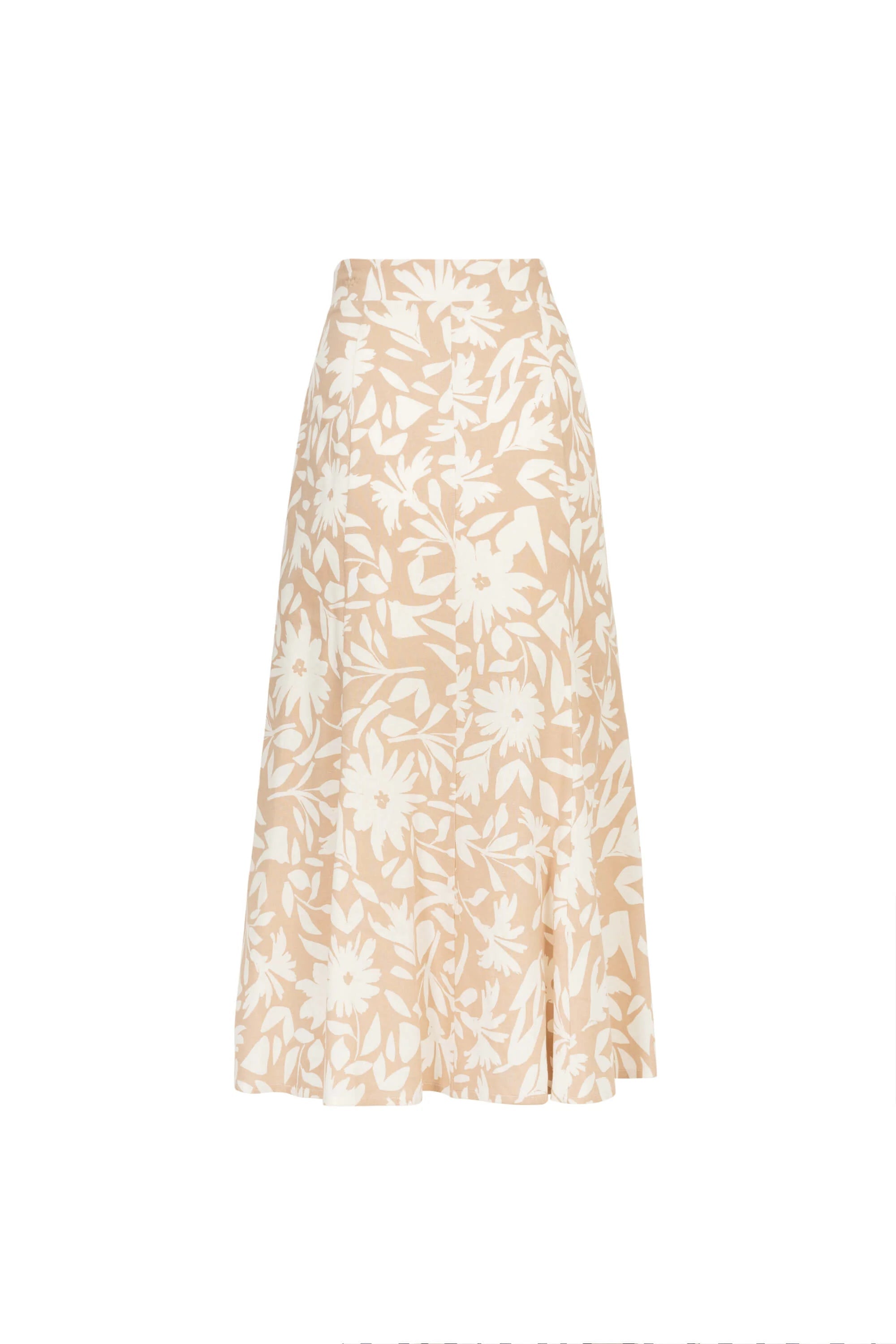 Esta falda midi con silueta evasé combina lo mejor del diseño clásico con una estética moderna y natural. Su confección en un estampado floral en tonos neutros permite una gran versatilidad, ideal para crear desde looks románticos hasta estilismos minimalistas con acento sofisticado.