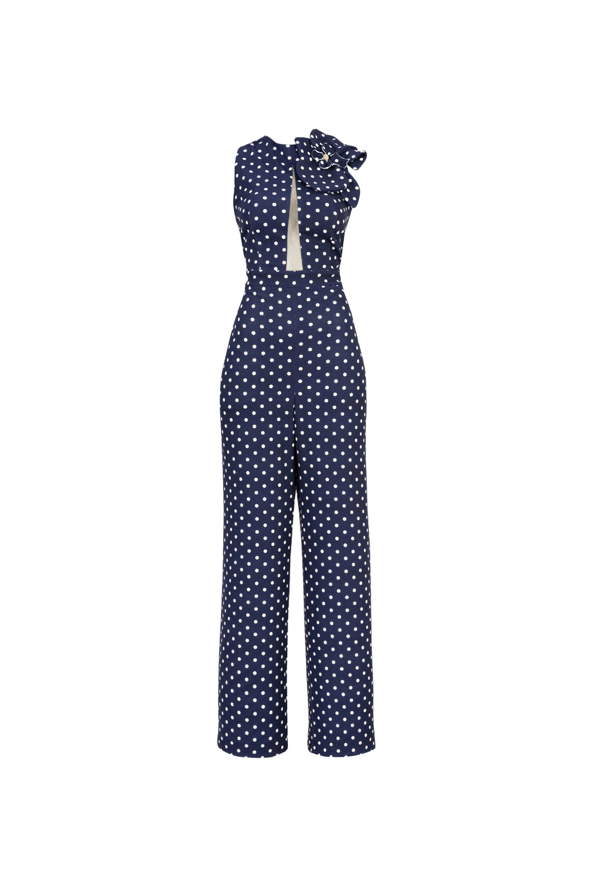 Este pantsuit sin mangas con estampado floral en blanco y azul marino es una declaración de estilo audaz y femenino. La silueta estilizada se equilibra con una caída amplia en el pantalón, mientras que el detalle escultural en el hombro y el cinturón estructurado marcan una figura poderosa, segura y refinada.