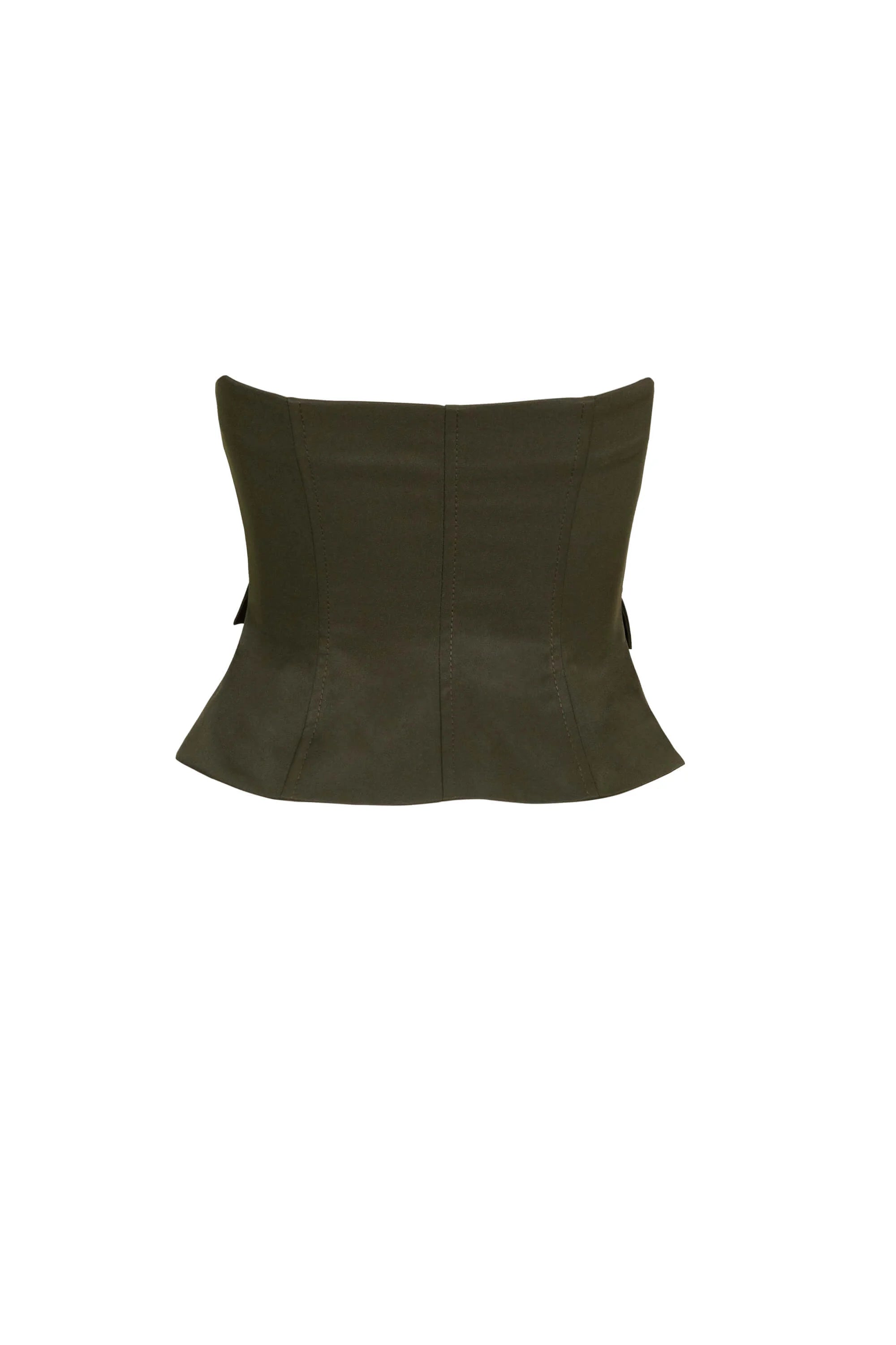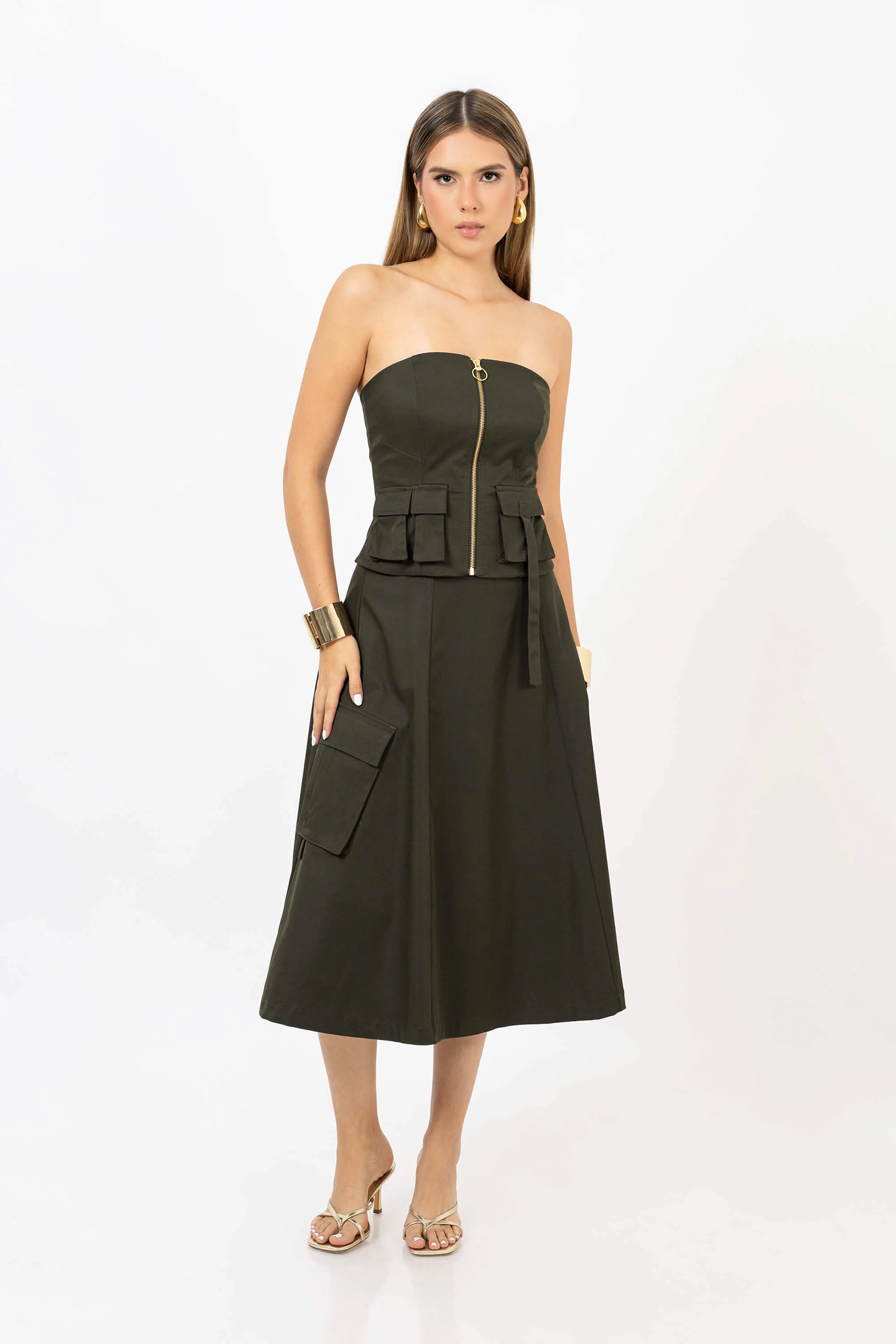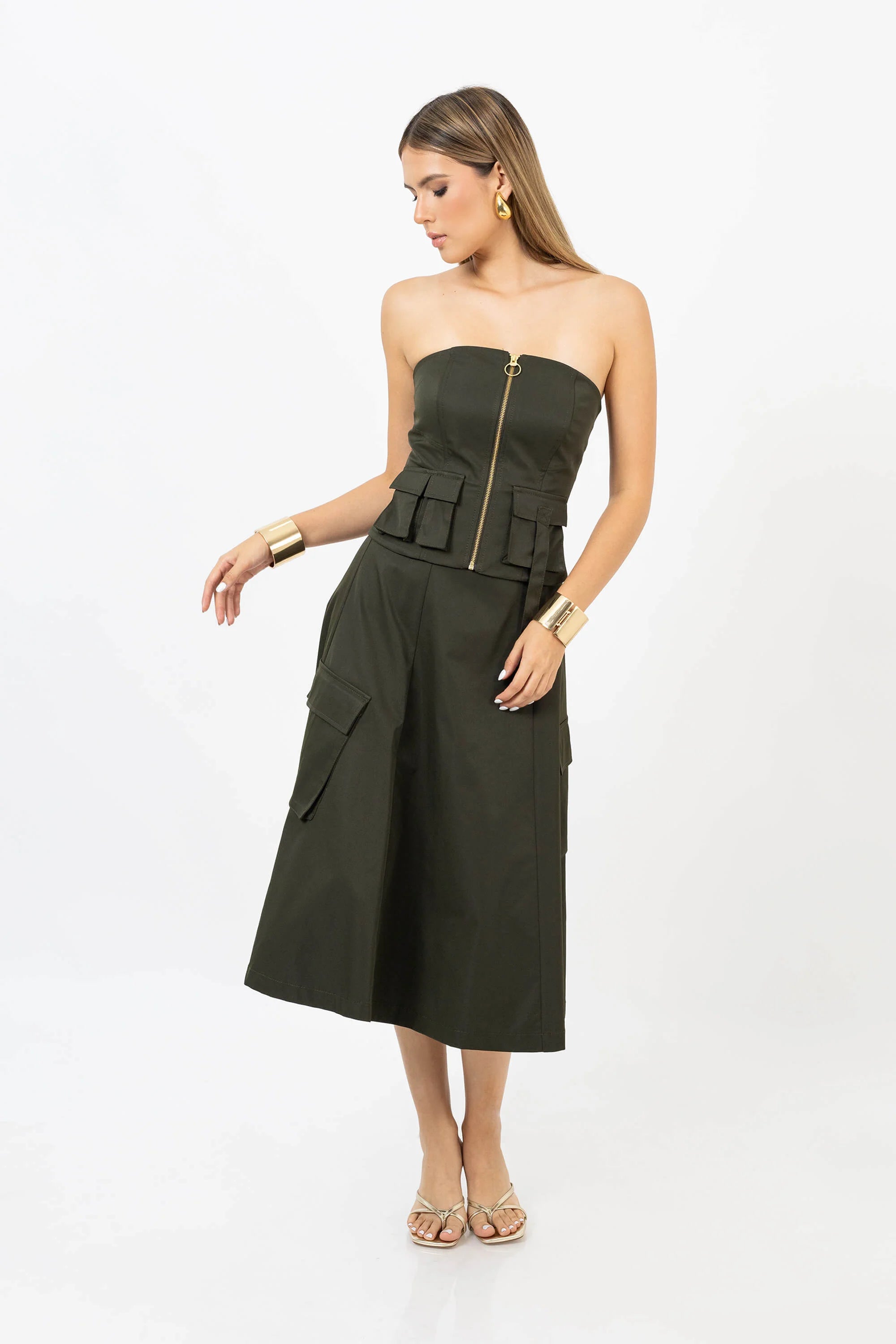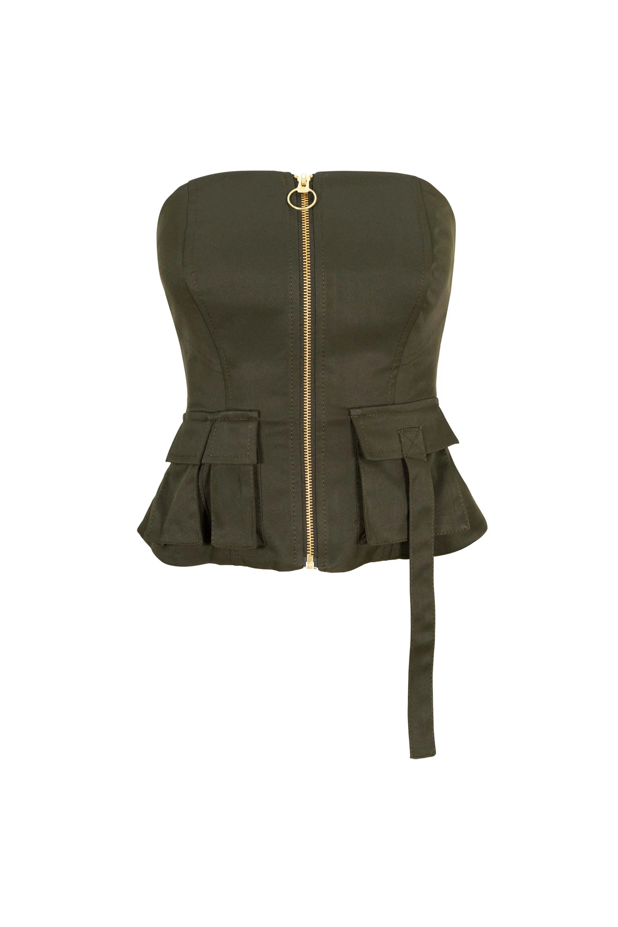 Top kaki strapless con cortes estructurados, cierre metálico y bolsas cargo.
