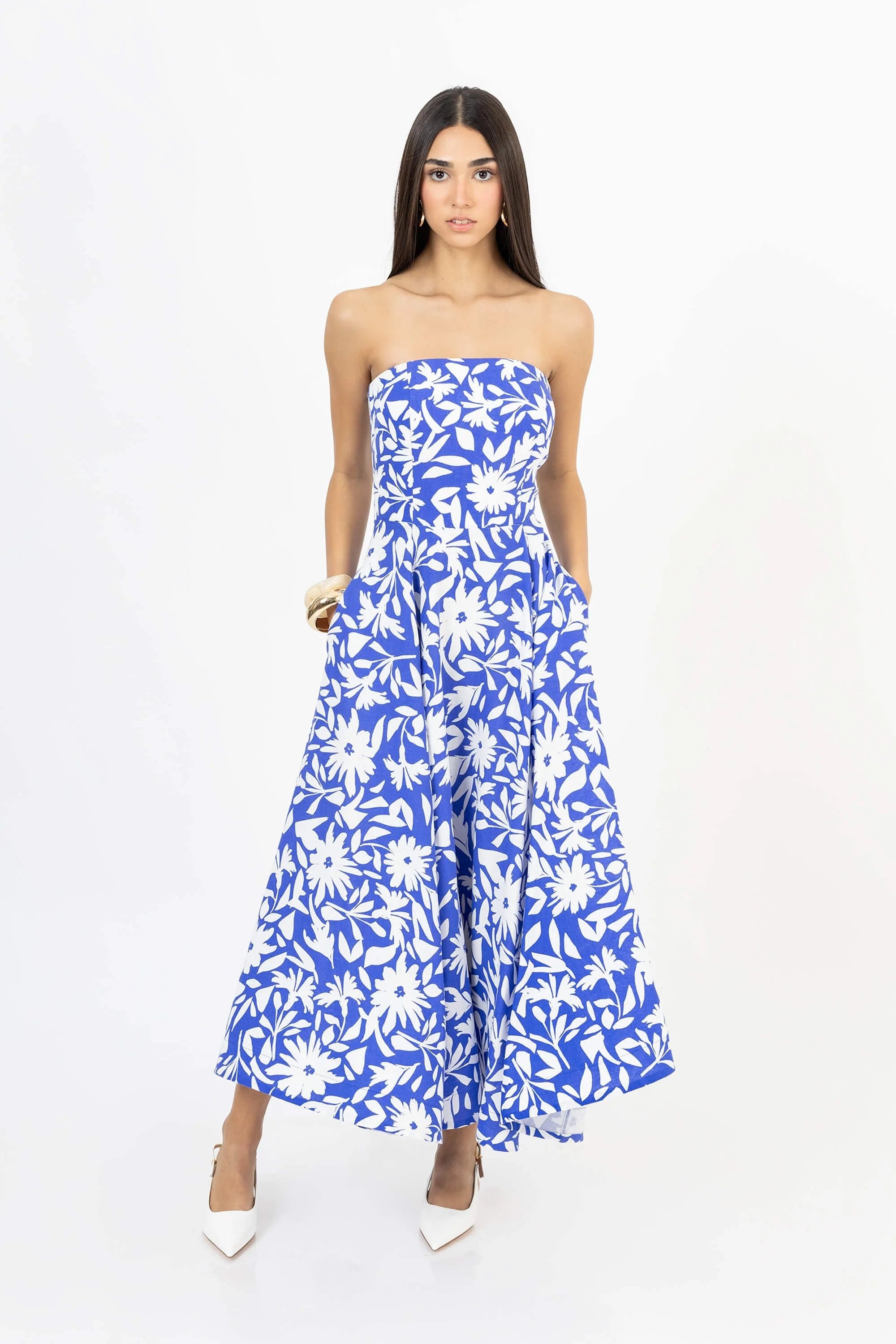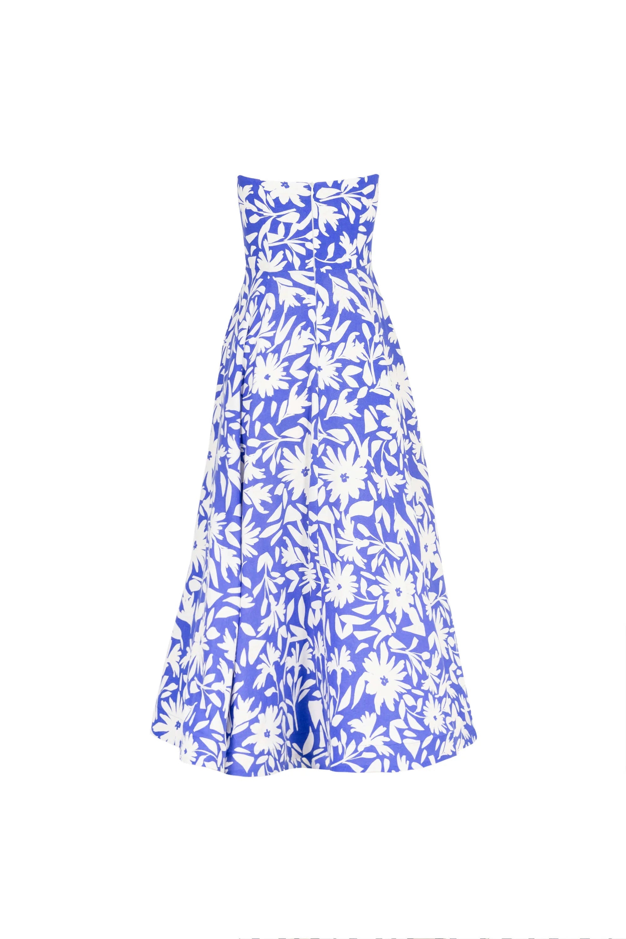 Este vestido strapless con falda de cuchillas captura la esencia de la feminidad contemporánea a través de una silueta escultural y un estampado floral en blanco y negro de alto impacto.