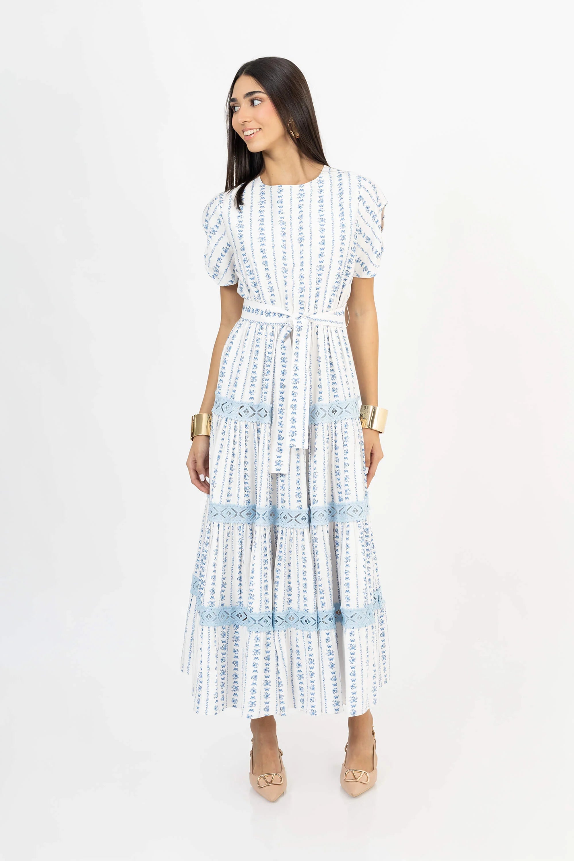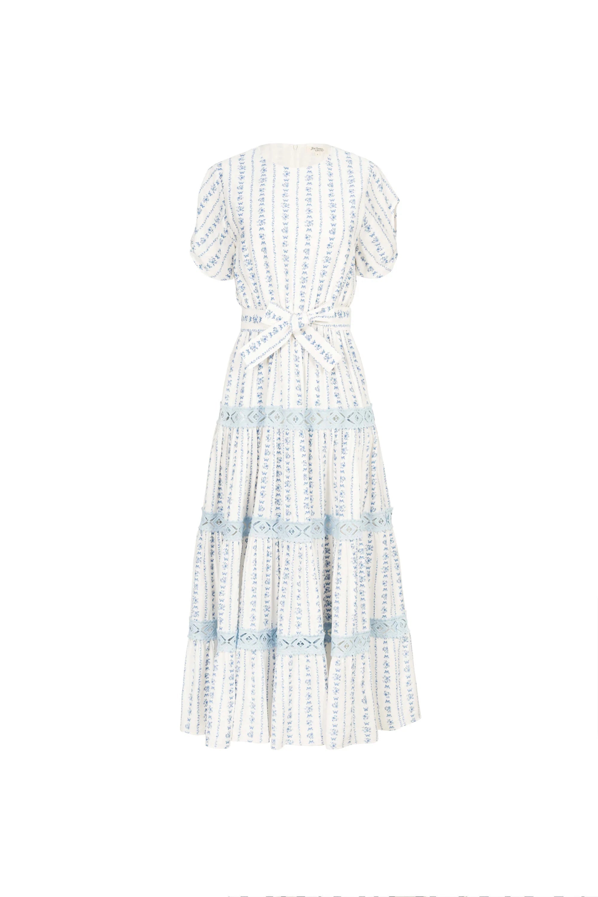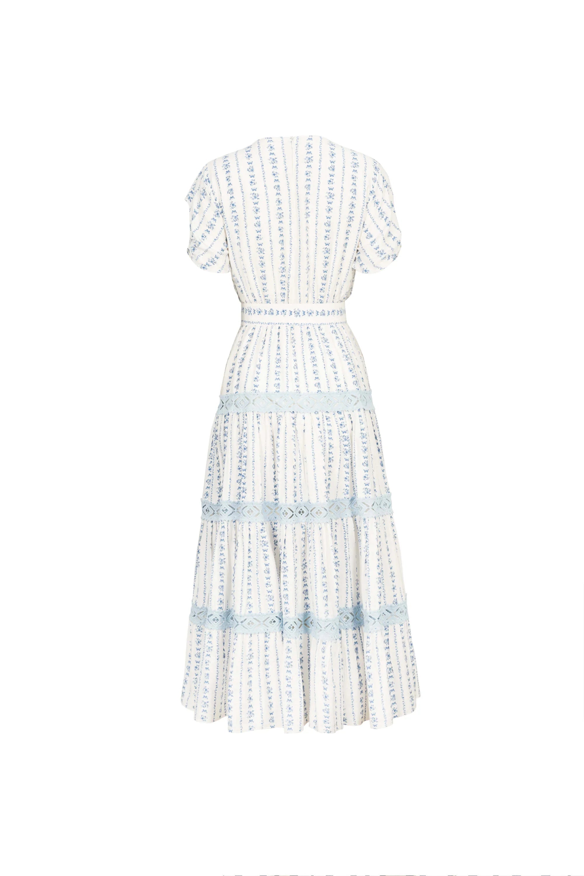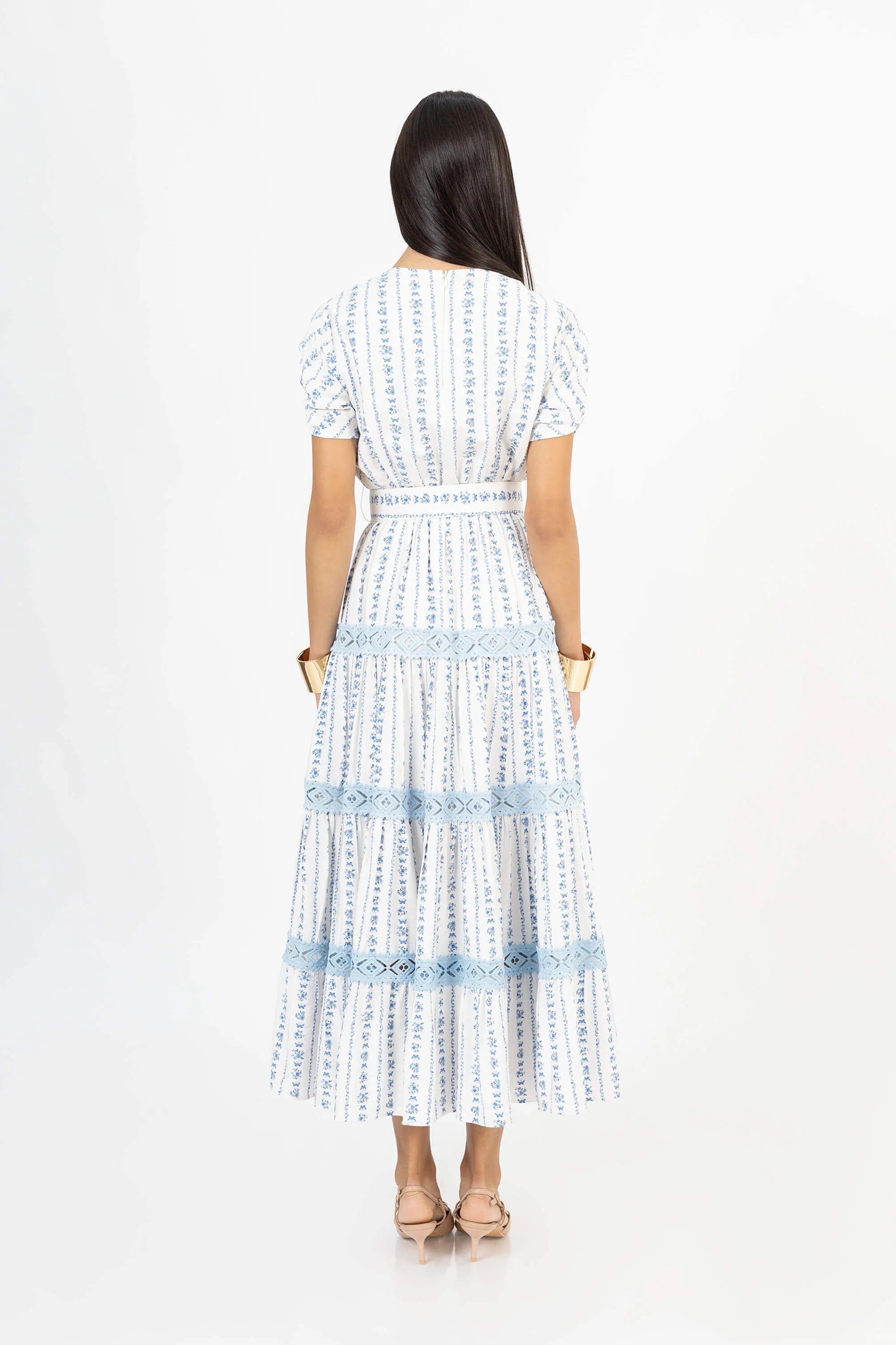 El estampado floral en tonos verdes sobre fondo marfil evoca jardines botánicos y días soleados, ideal para paseos matutinos, celebraciones al aire libre o escapadas de fin de semana. Su cinturón integrado realza la cintura sin sacrificar la fluidez del diseño, mientras que los detalles de encaje sutil le aportan un aire artesanal encantador.